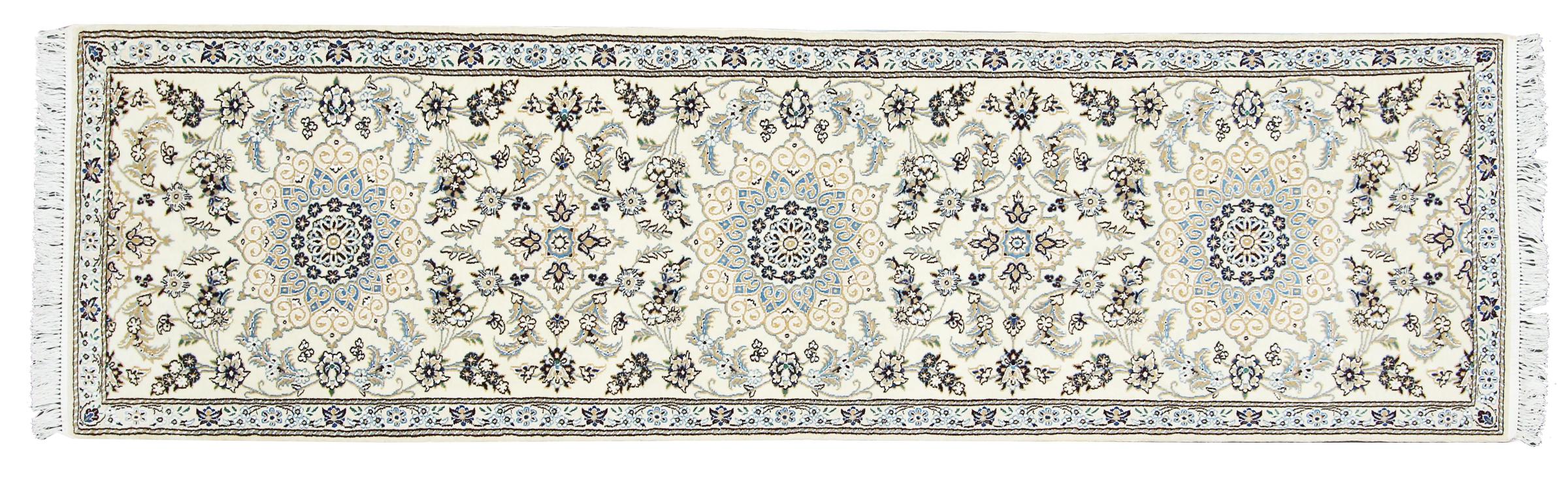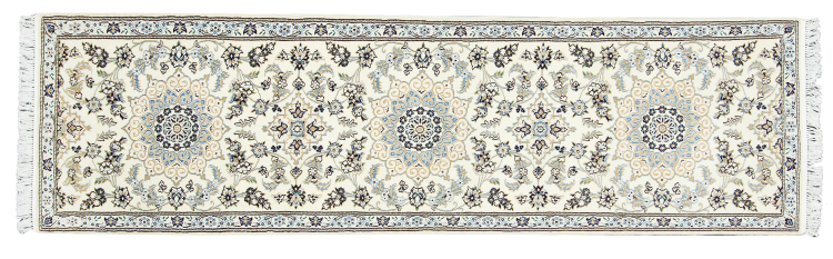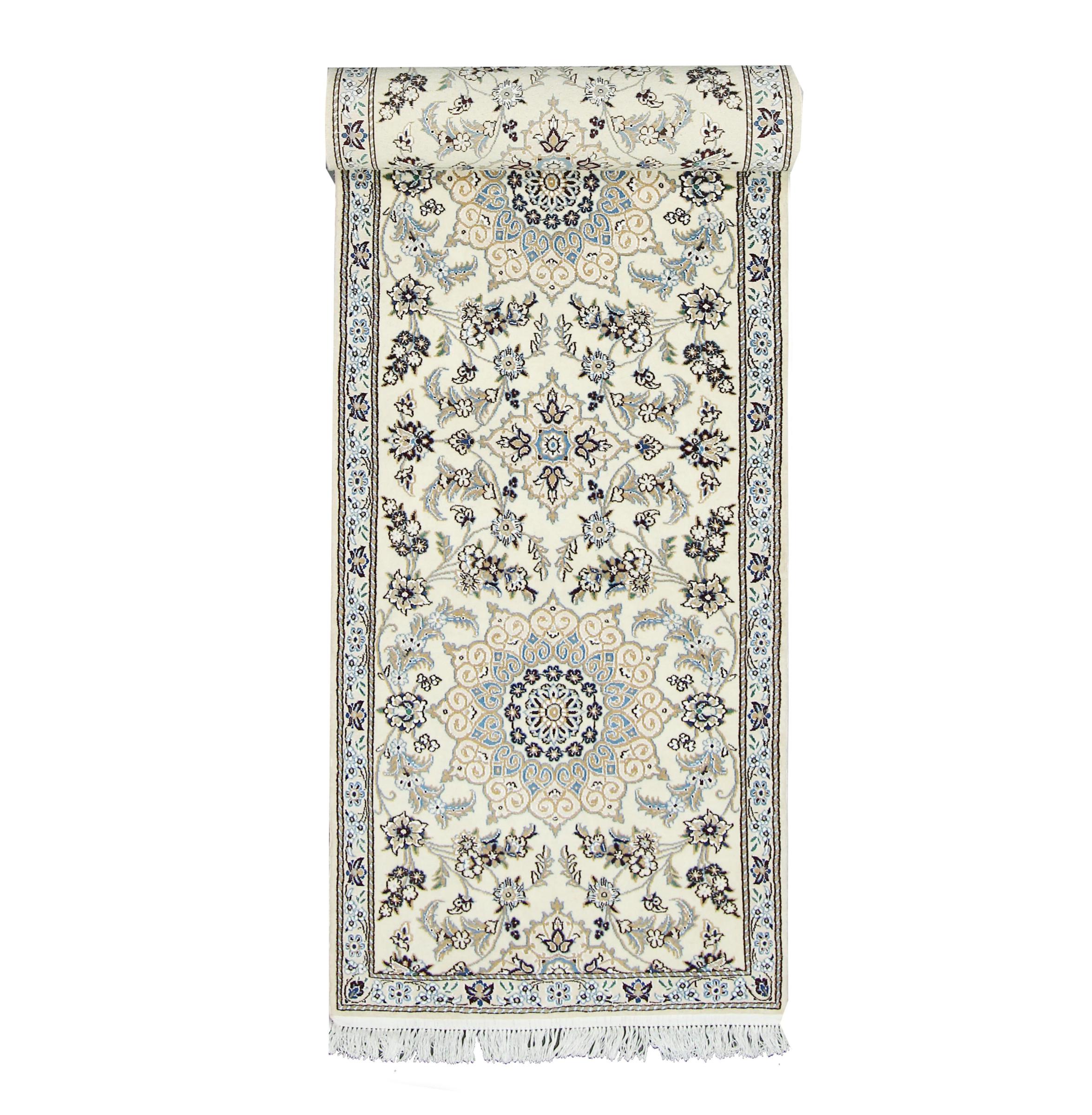 Nº do Tapete: 267420008946167 Tamanho: 306x83 cm Espessura: aproximadamente 8 mm Nós: 360 000 - 400 000 / m² Processamento: Atado à mão Veludo: Lã com seda Urdidura: Algodão Origem: Pérsia / Iran Idade: Novo Peso: aproximadamente 9 kg Em armazém: Único - Apenas 1 em stock
