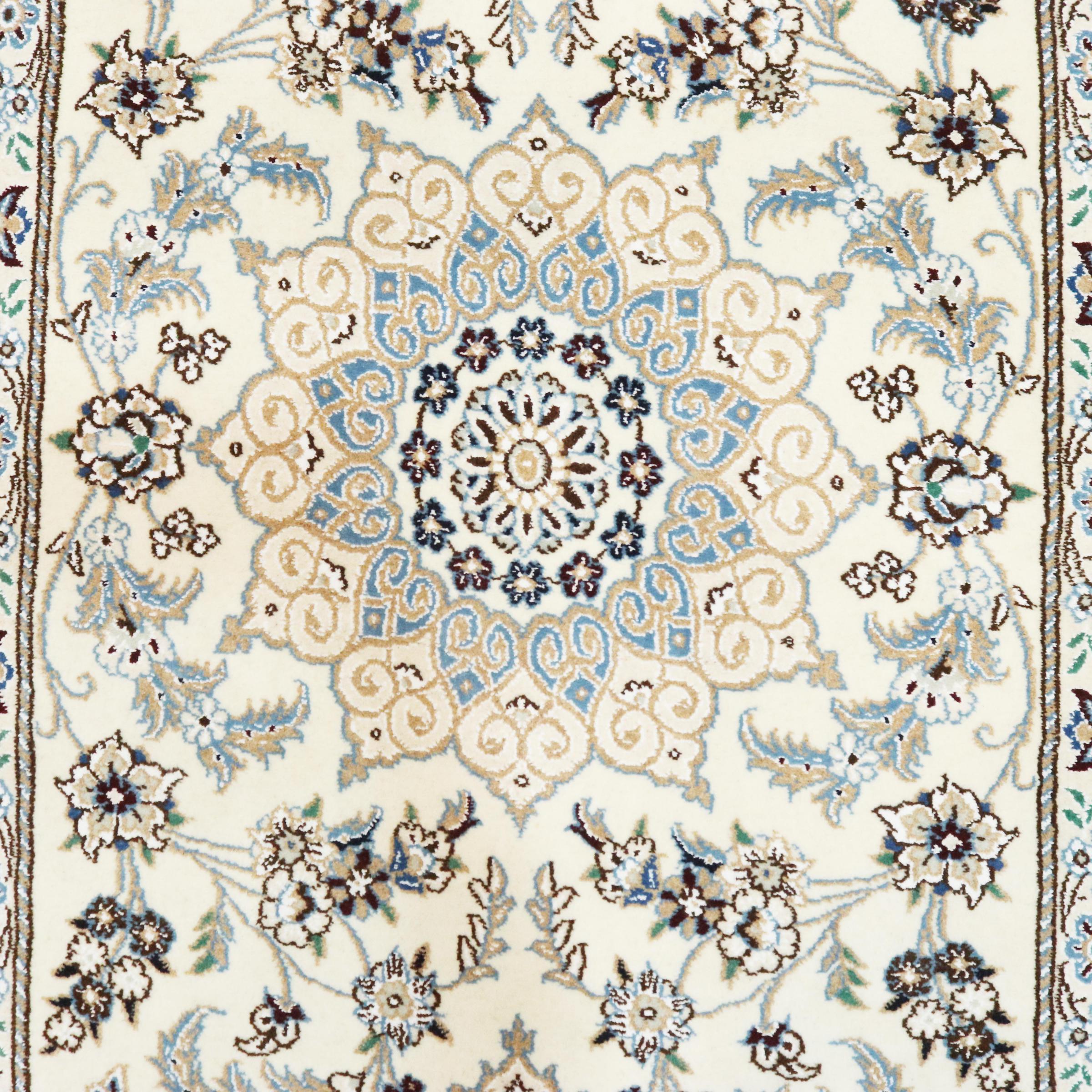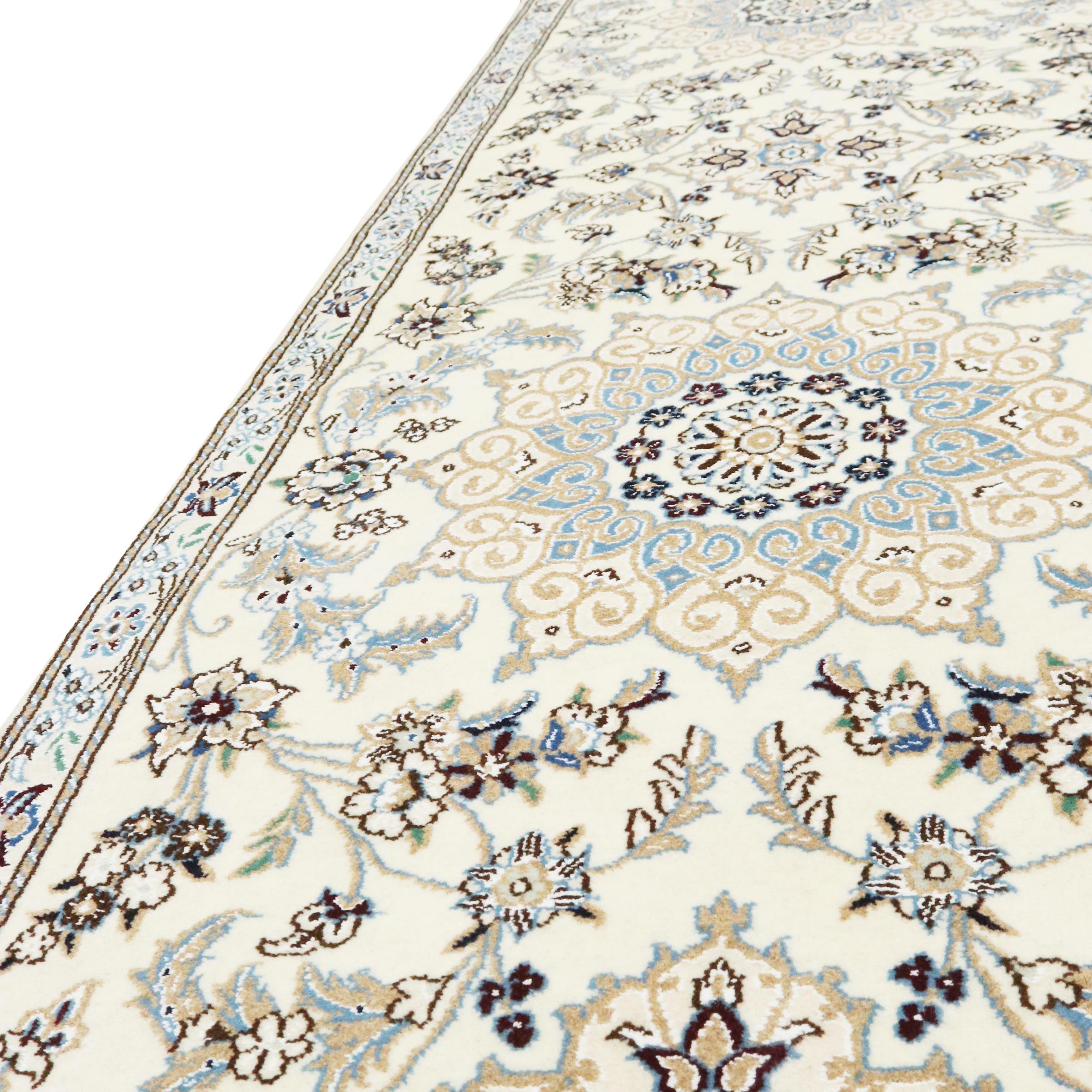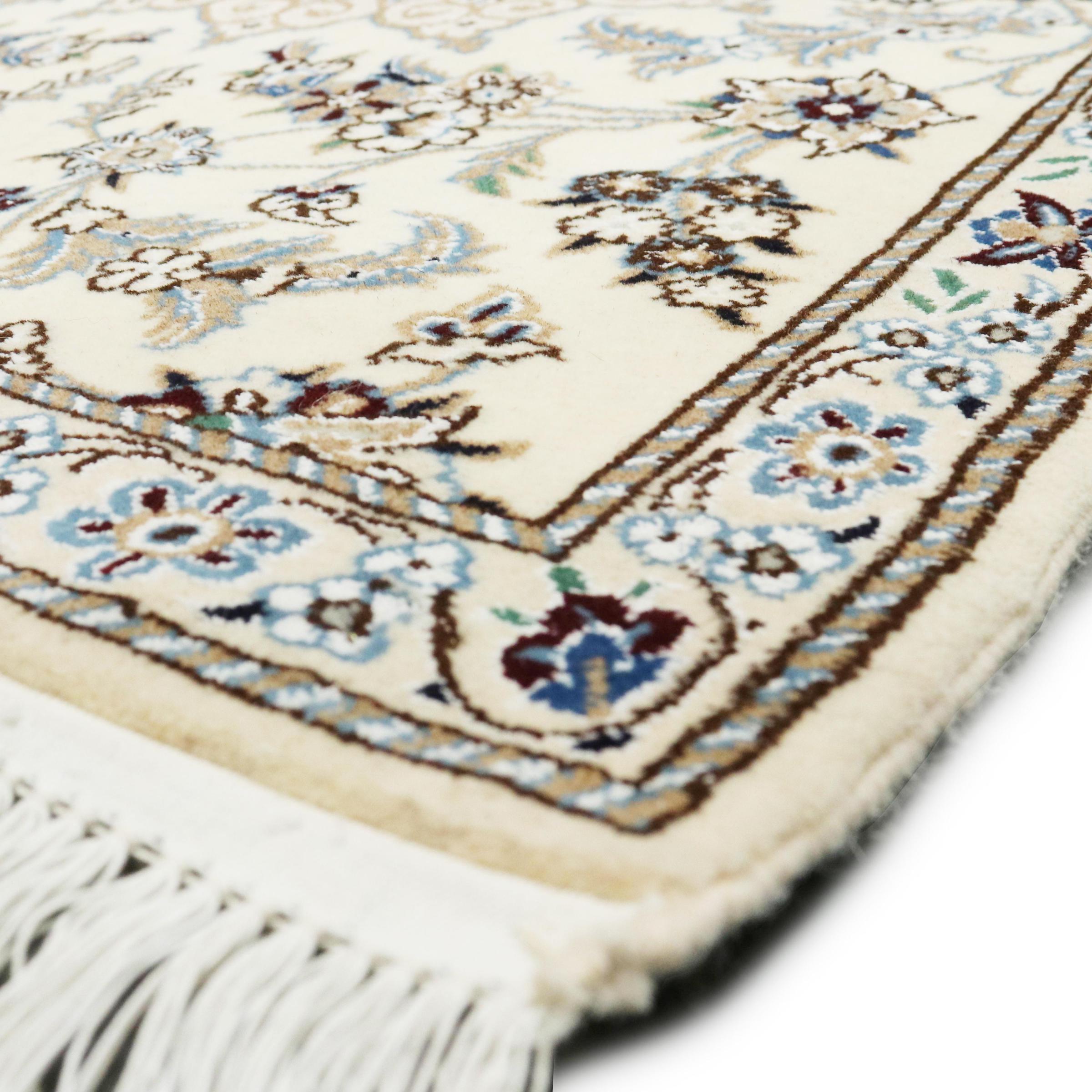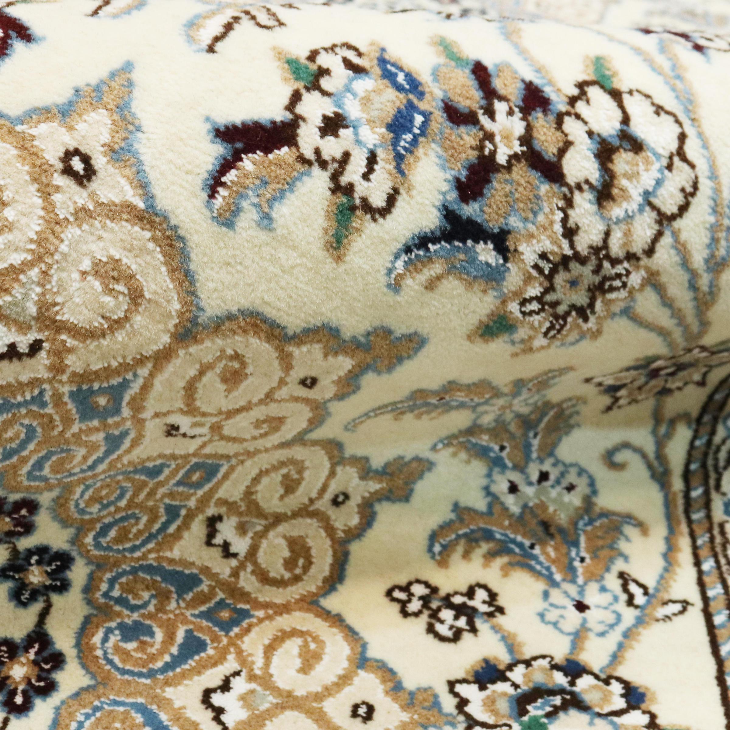Este tapete Nain é classificado como 9La. A excelente qualidade e o belo desenho oriental com os seus padrões curvilíneos farão as delícias de qualquer comprador. Este tapete persa foi feito à mão na cidade de Nain, que fica na extremidade ocidental do deserto de Dasht-e-Kavir, a partir de lã de alta qualidade e seda natural. 9La Nain são claramente mais finos do que um 12La e já mostram belos detalhes.