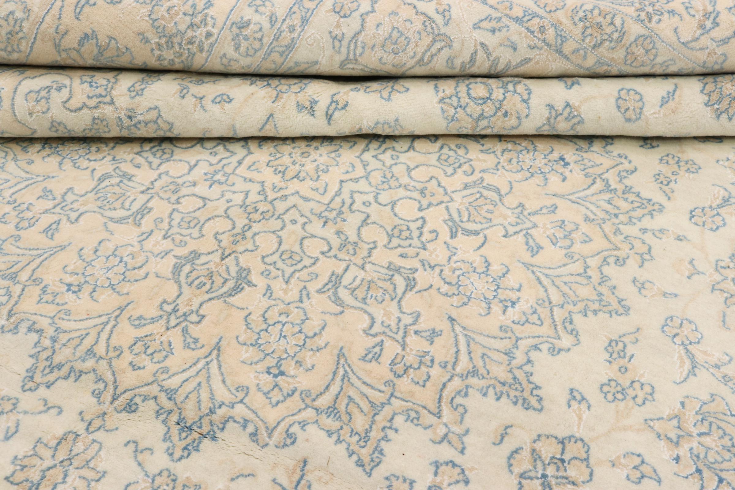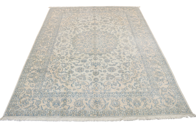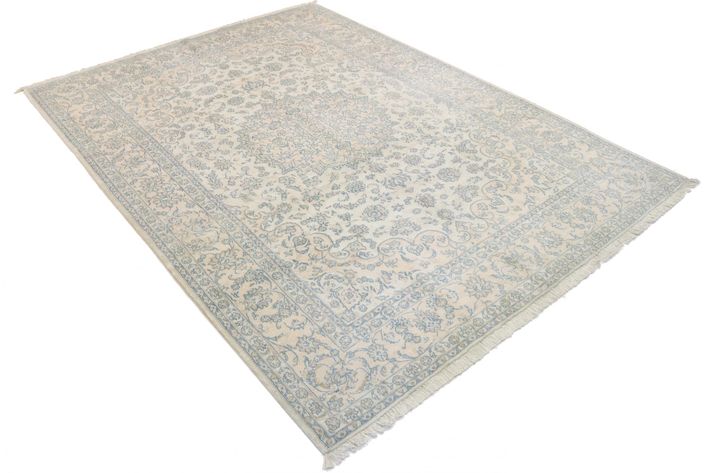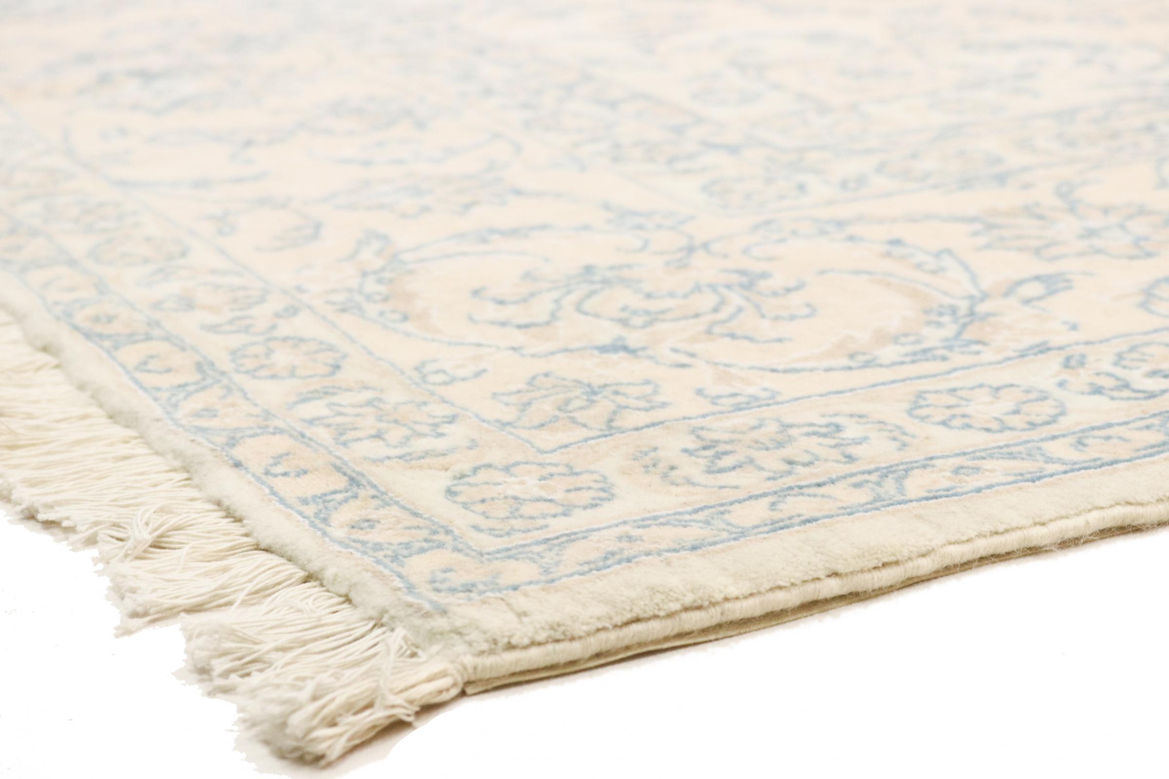 Este tapete Nain é classificado como 9La. A excelente qualidade e o belo desenho oriental com os seus padrões curvilíneos farão as delícias de qualquer comprador. Este tapete persa foi feito à mão na cidade de Nain, que fica na extremidade ocidental do deserto de Dasht-e-Kavir, a partir de lã de alta qualidade e seda natural. 9La Nain são claramente mais finos do que um 12La e já mostram belos detalhes.
