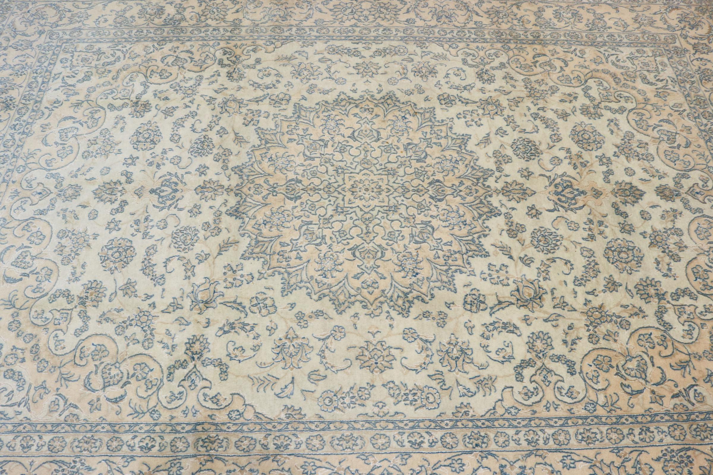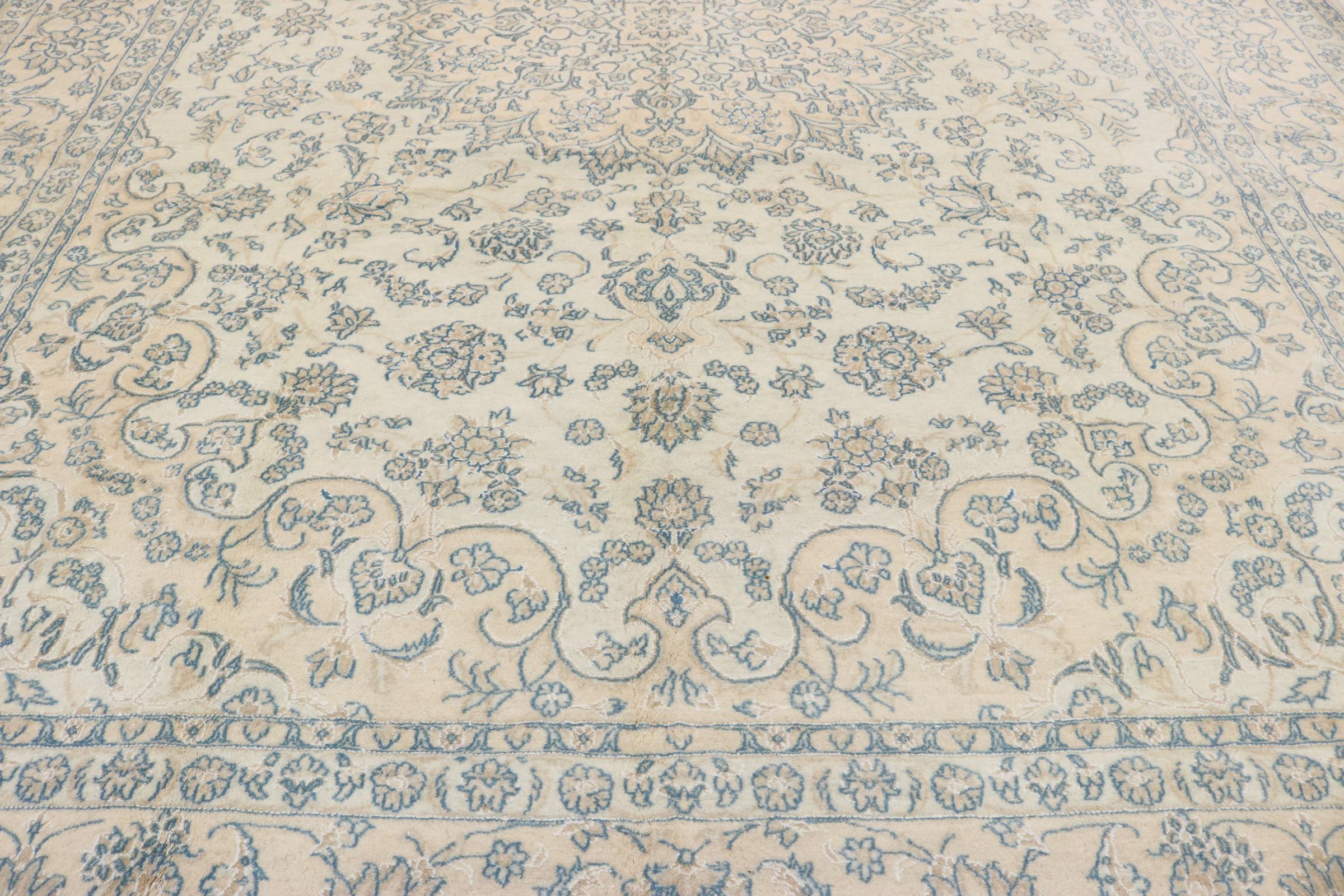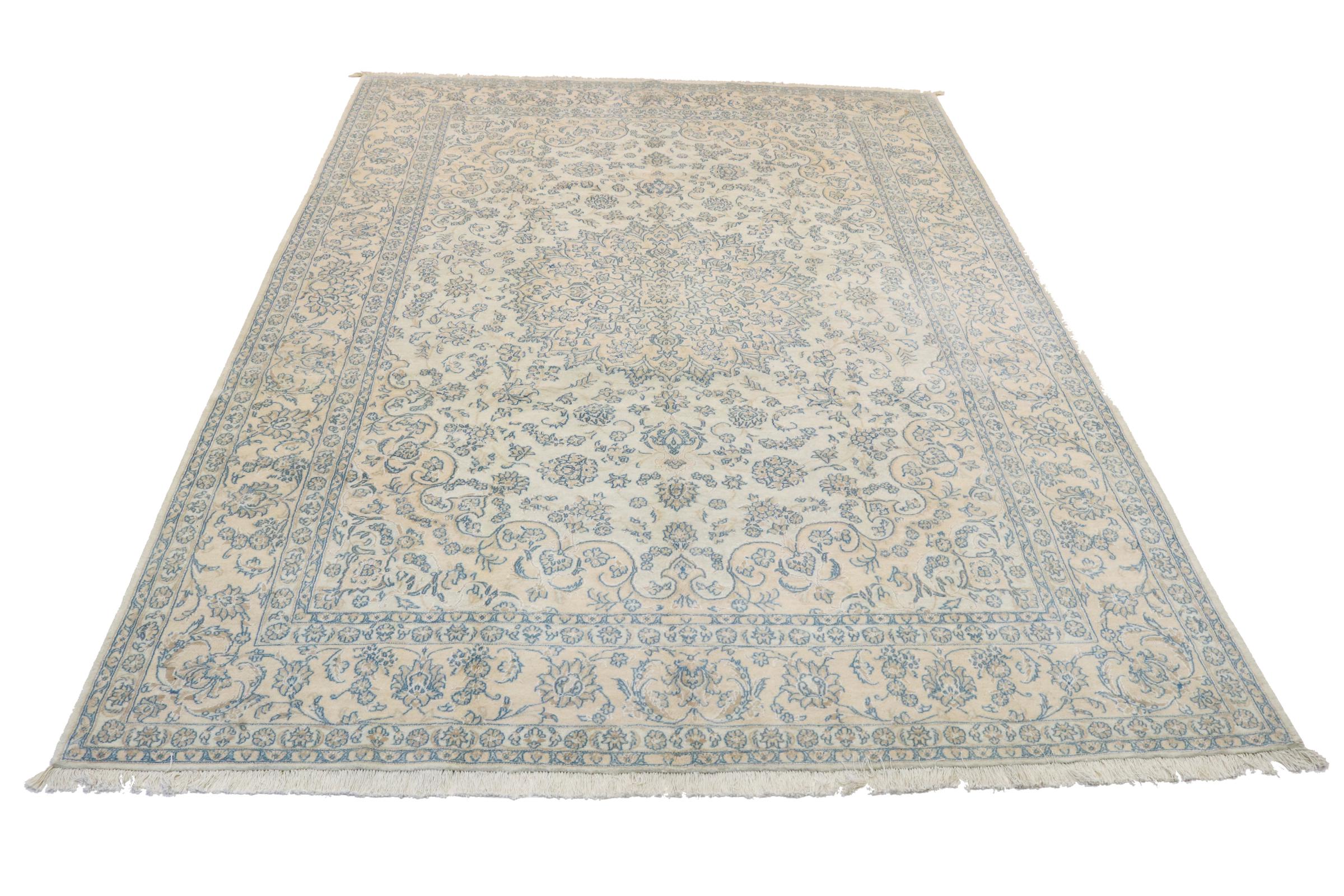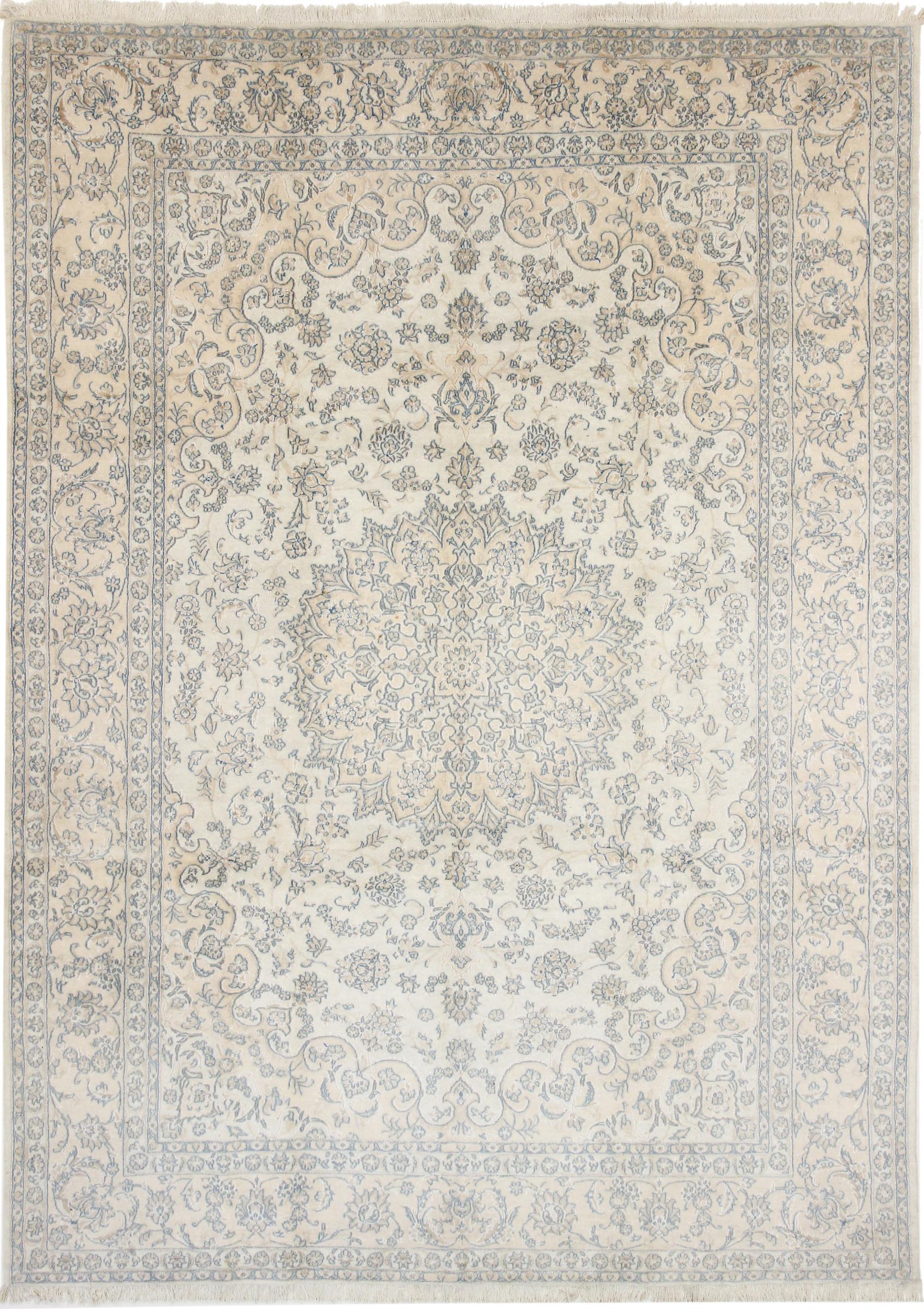 Este tapete Nain é classificado como 9La. A excelente qualidade e o belo desenho oriental com os seus padrões curvilíneos farão as delícias de qualquer comprador. Este tapete persa foi feito à mão na cidade de Nain, que fica na extremidade ocidental do deserto de Dasht-e-Kavir, a partir de lã de alta qualidade e seda natural. 9La Nain são claramente mais finos do que um 12La e já mostram belos detalhes.