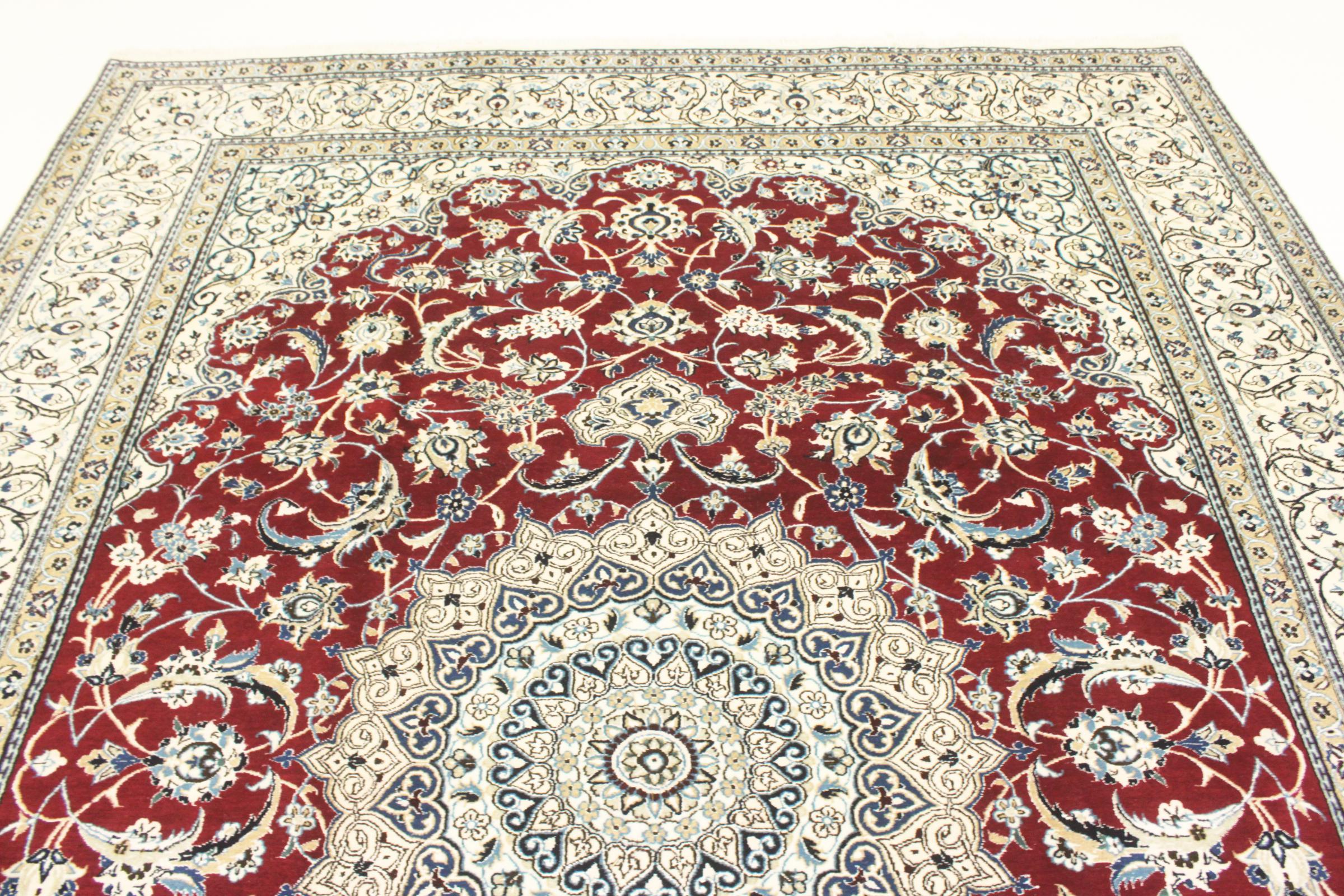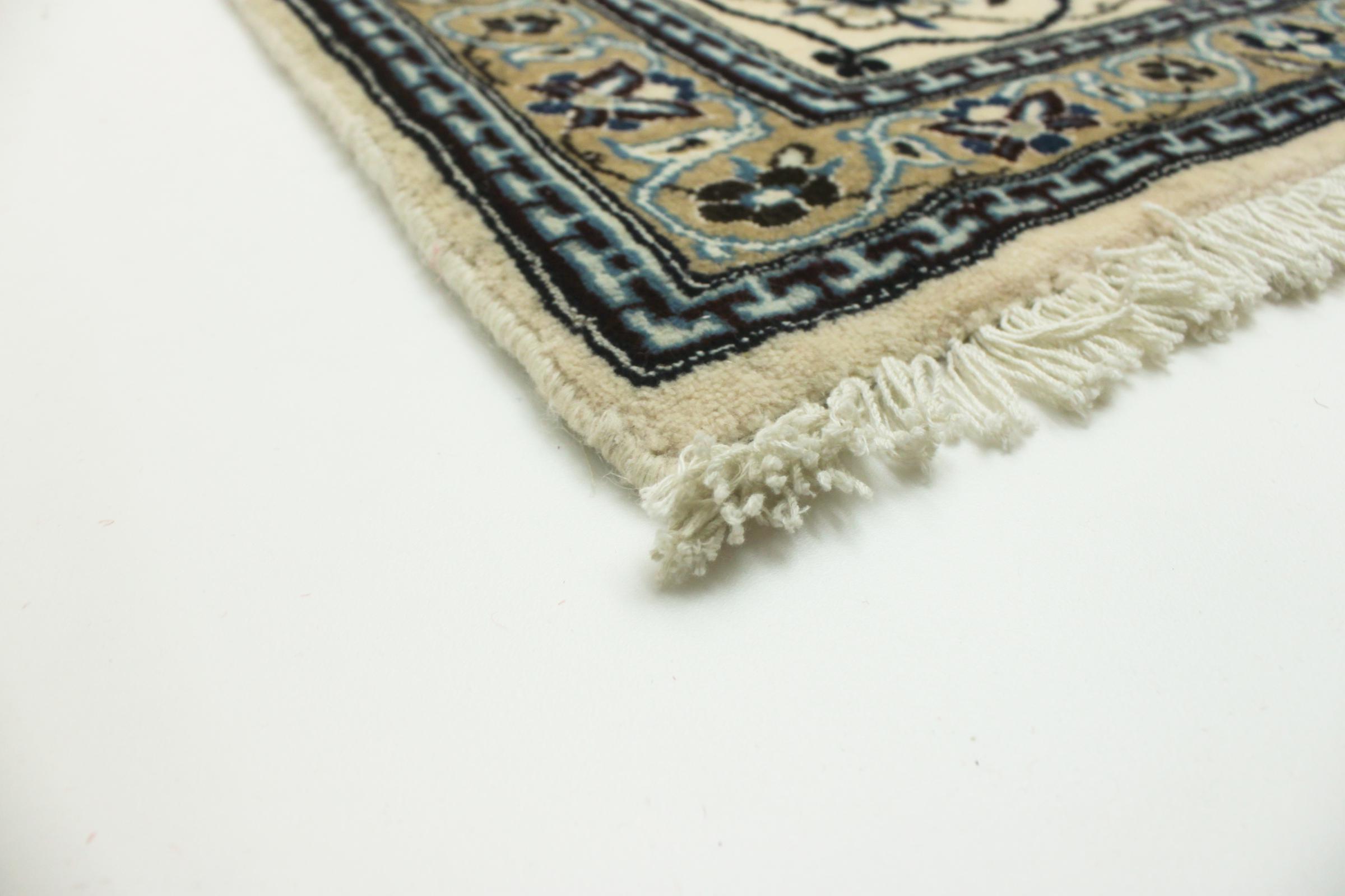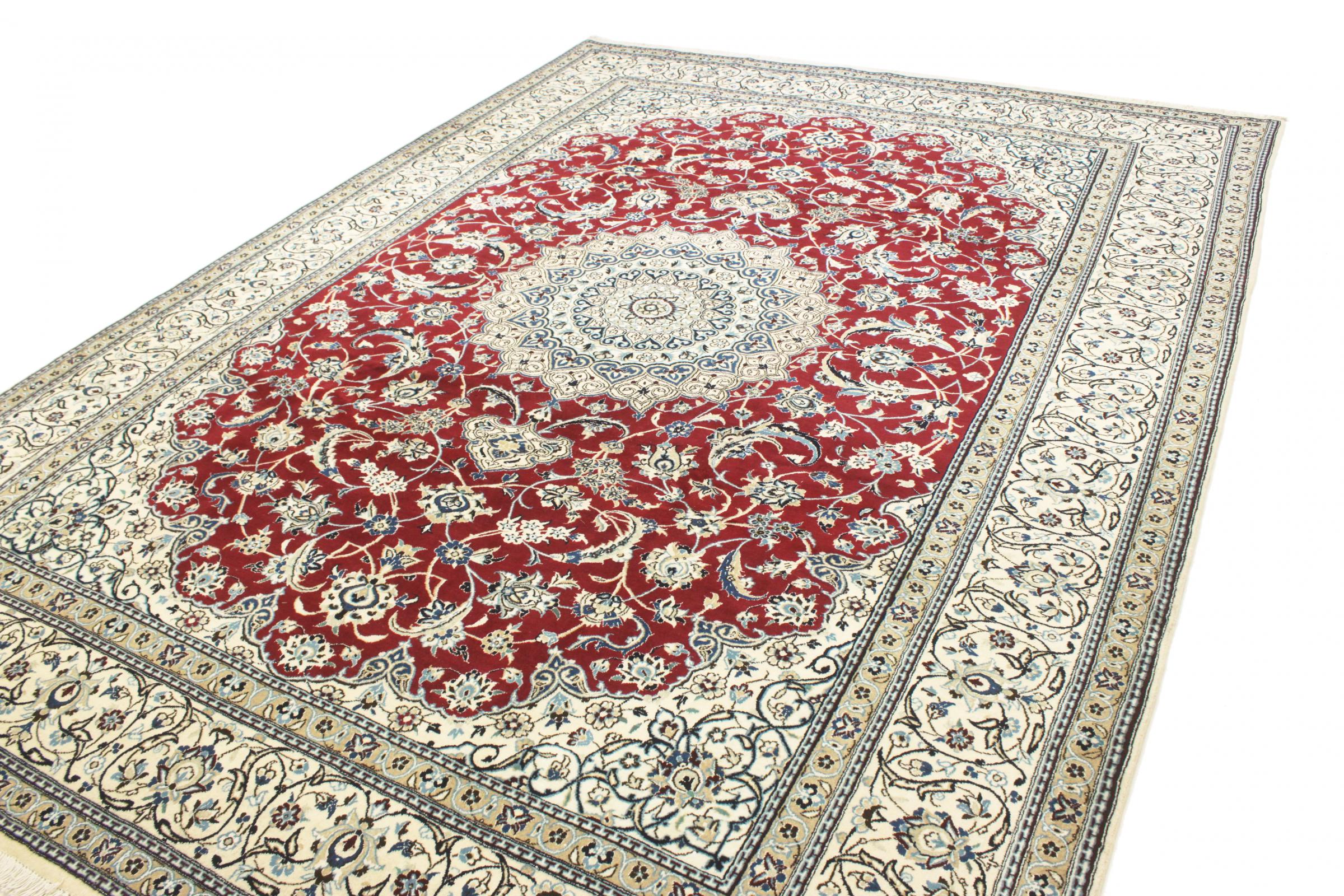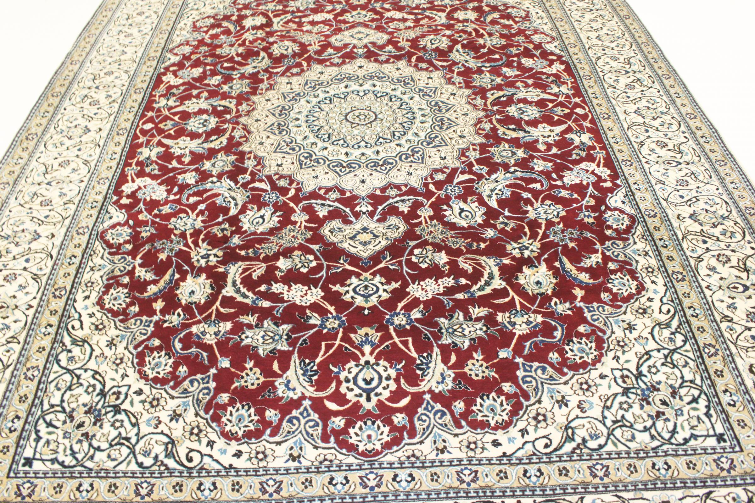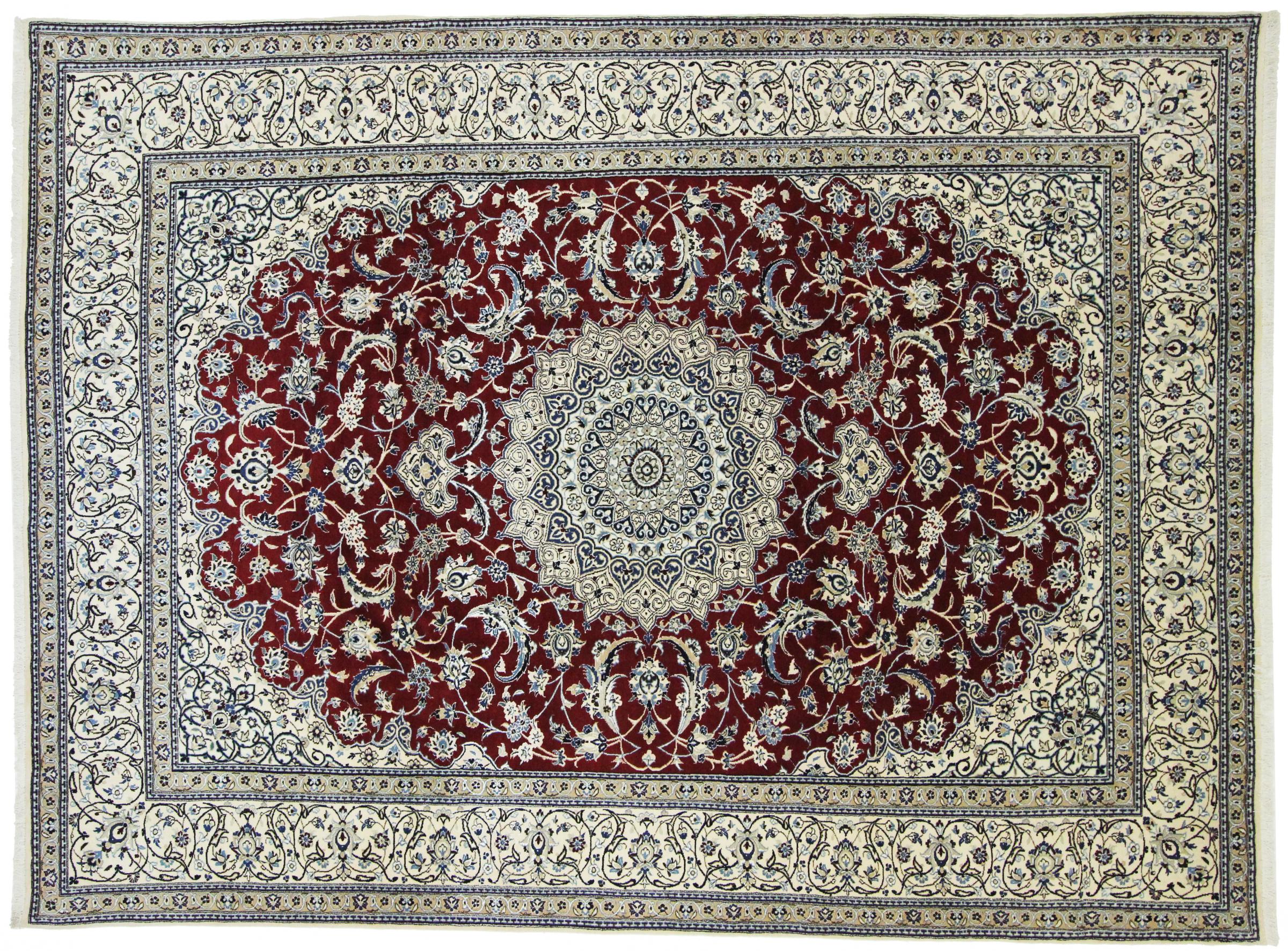 Este tapete Nain é classificado como 9La. A excelente qualidade e o belo desenho oriental com os seus padrões curvilíneos farão as delícias de qualquer comprador. Este tapete persa foi feito à mão na cidade de Nain, que fica na extremidade ocidental do deserto de Dasht-e-Kavir, a partir de lã de alta qualidade e seda natural. 9La Nain são claramente mais finos do que um 12La e já mostram belos detalhes.
