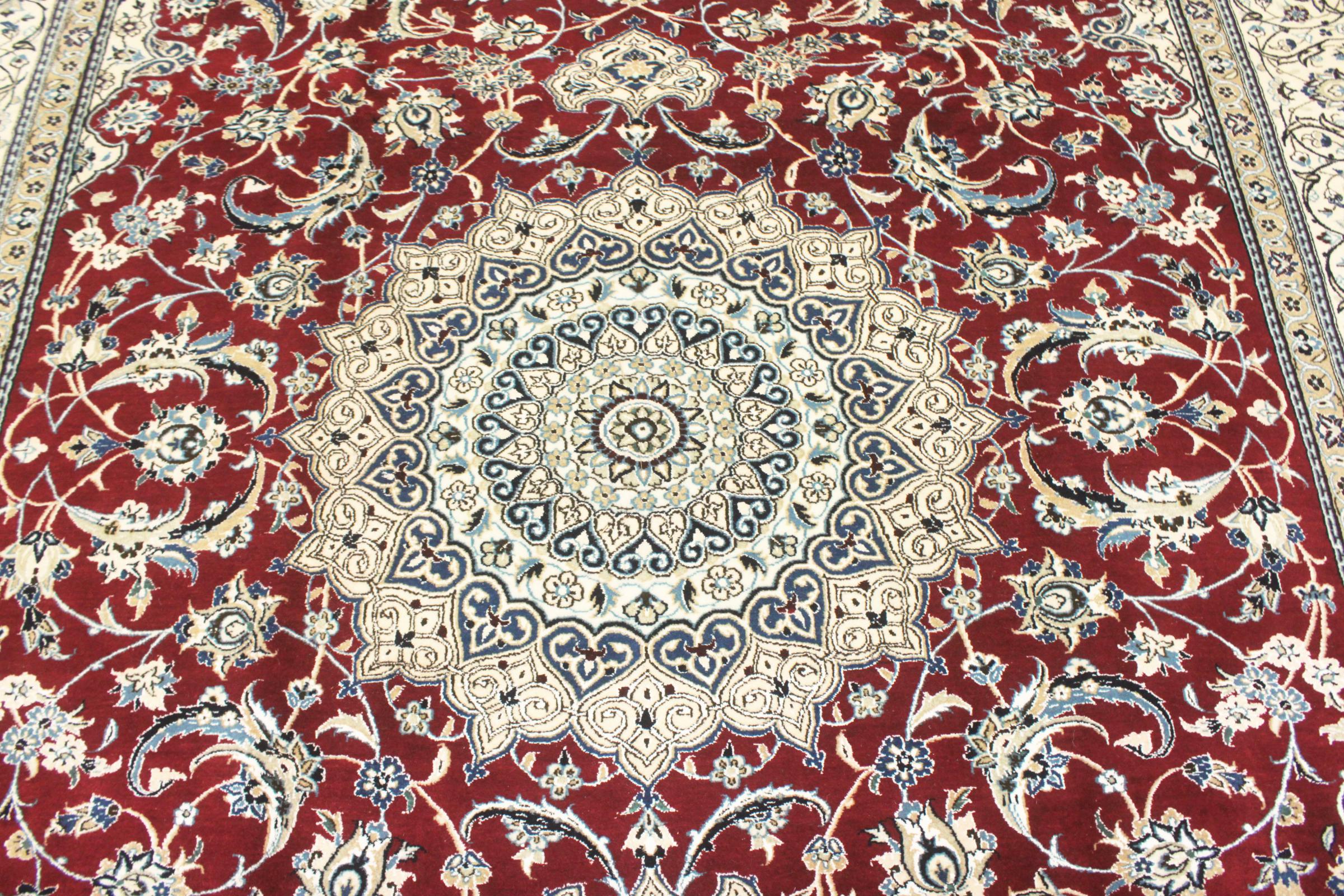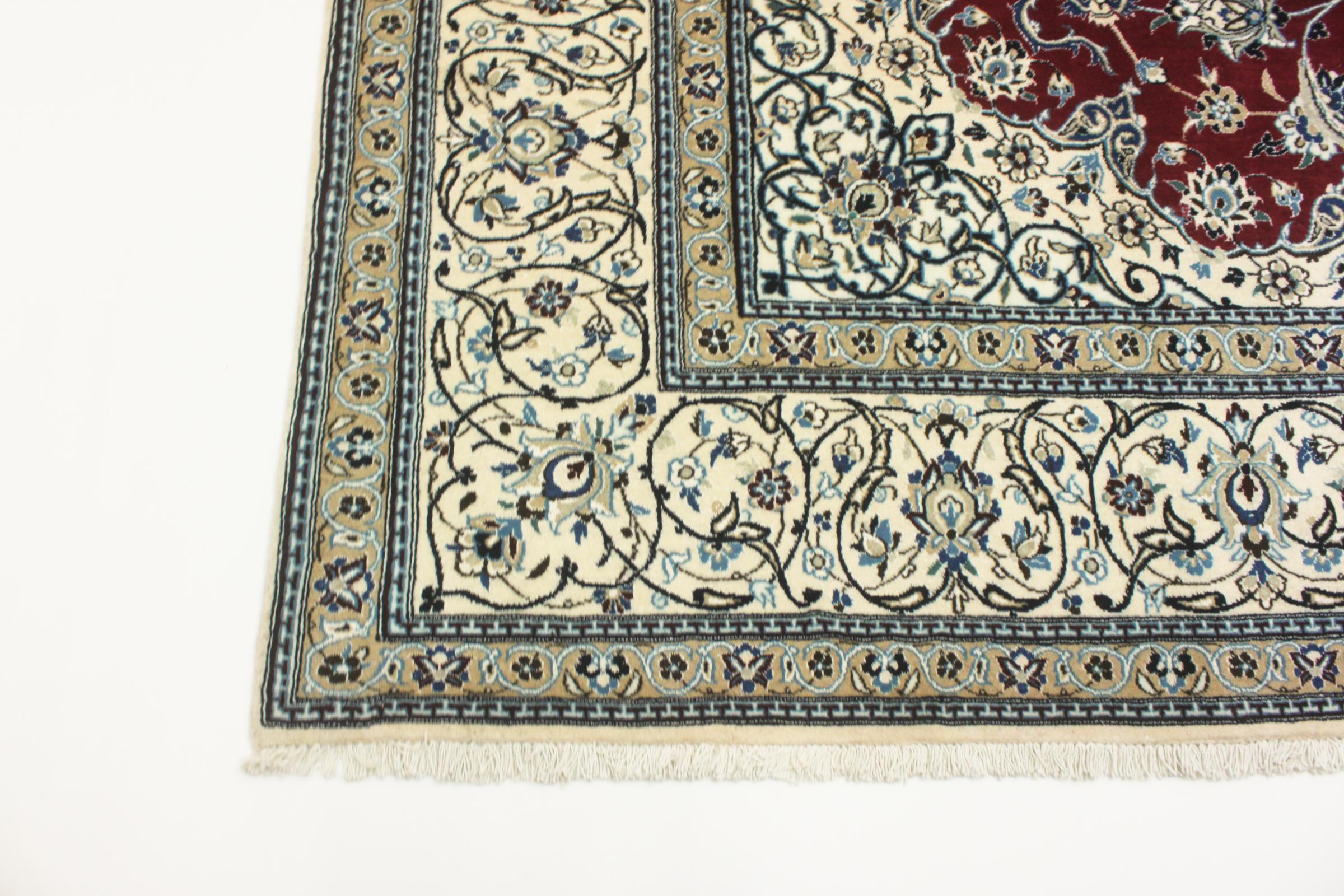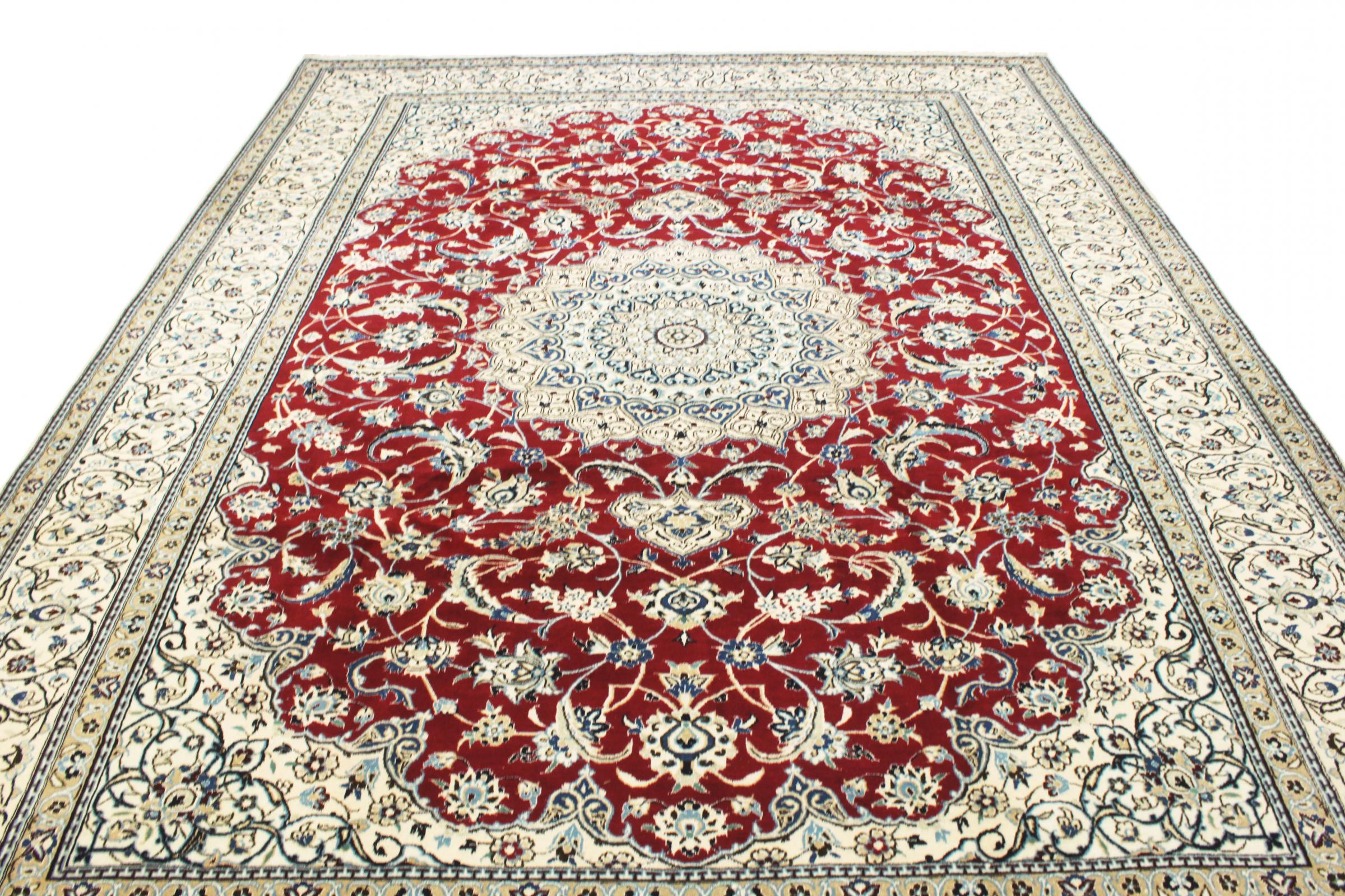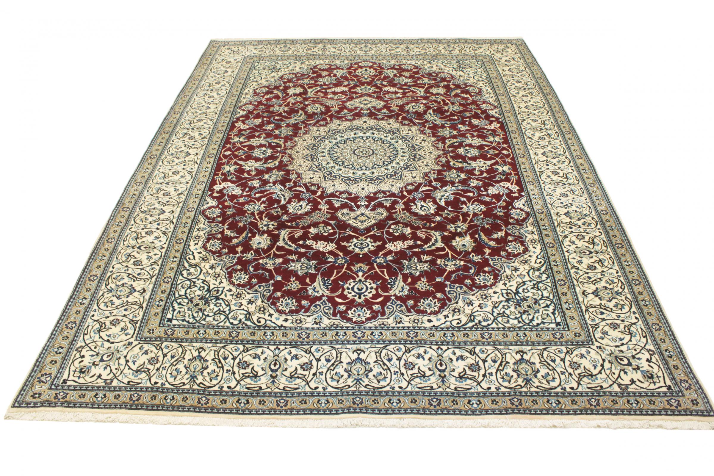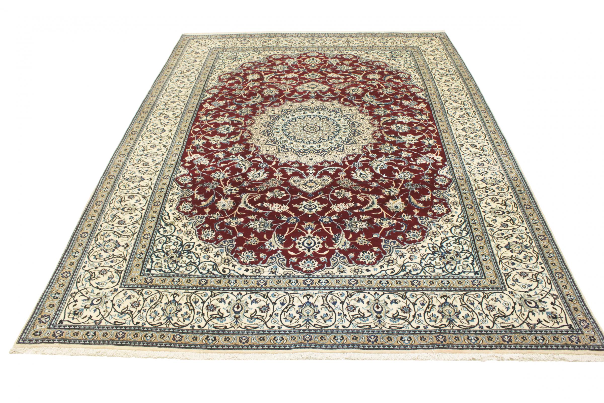 Este tapete Nain é classificado como 9La. A excelente qualidade e o belo desenho oriental com os seus padrões curvilíneos farão as delícias de qualquer comprador. Este tapete persa foi feito à mão na cidade de Nain, que fica na extremidade ocidental do deserto de Dasht-e-Kavir, a partir de lã de alta qualidade e seda natural. 9La Nain são claramente mais finos do que um 12La e já mostram belos detalhes.
