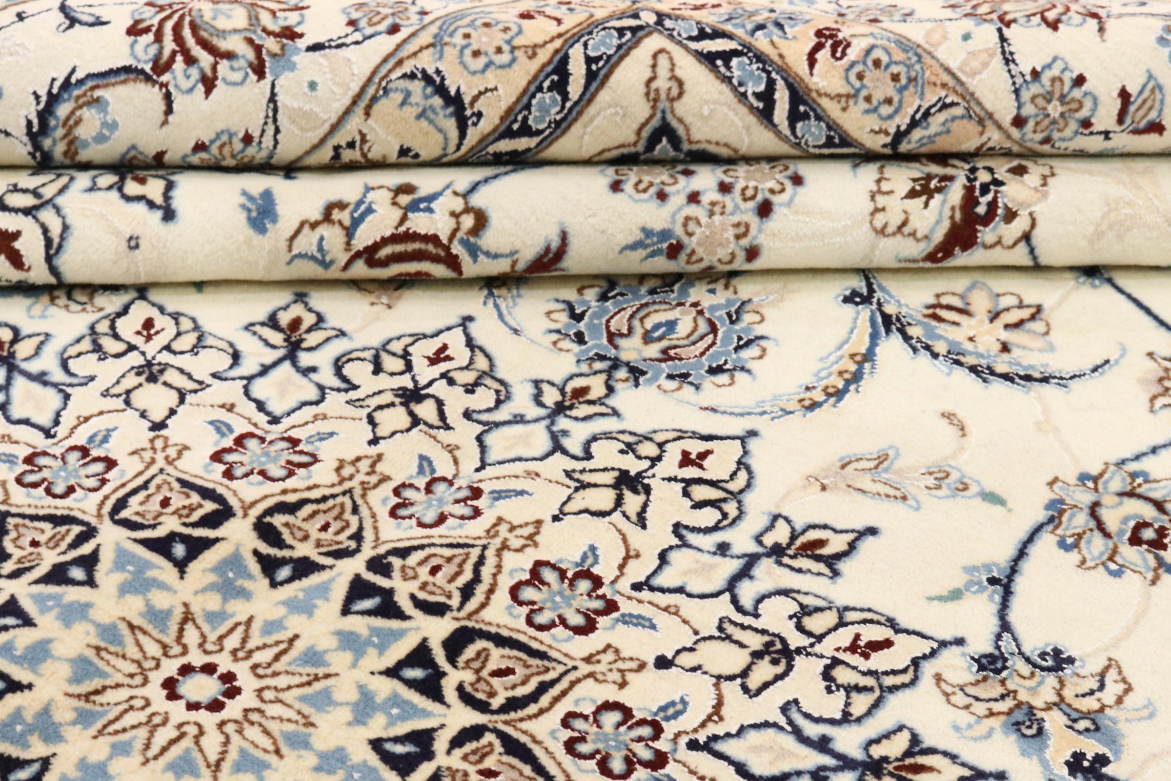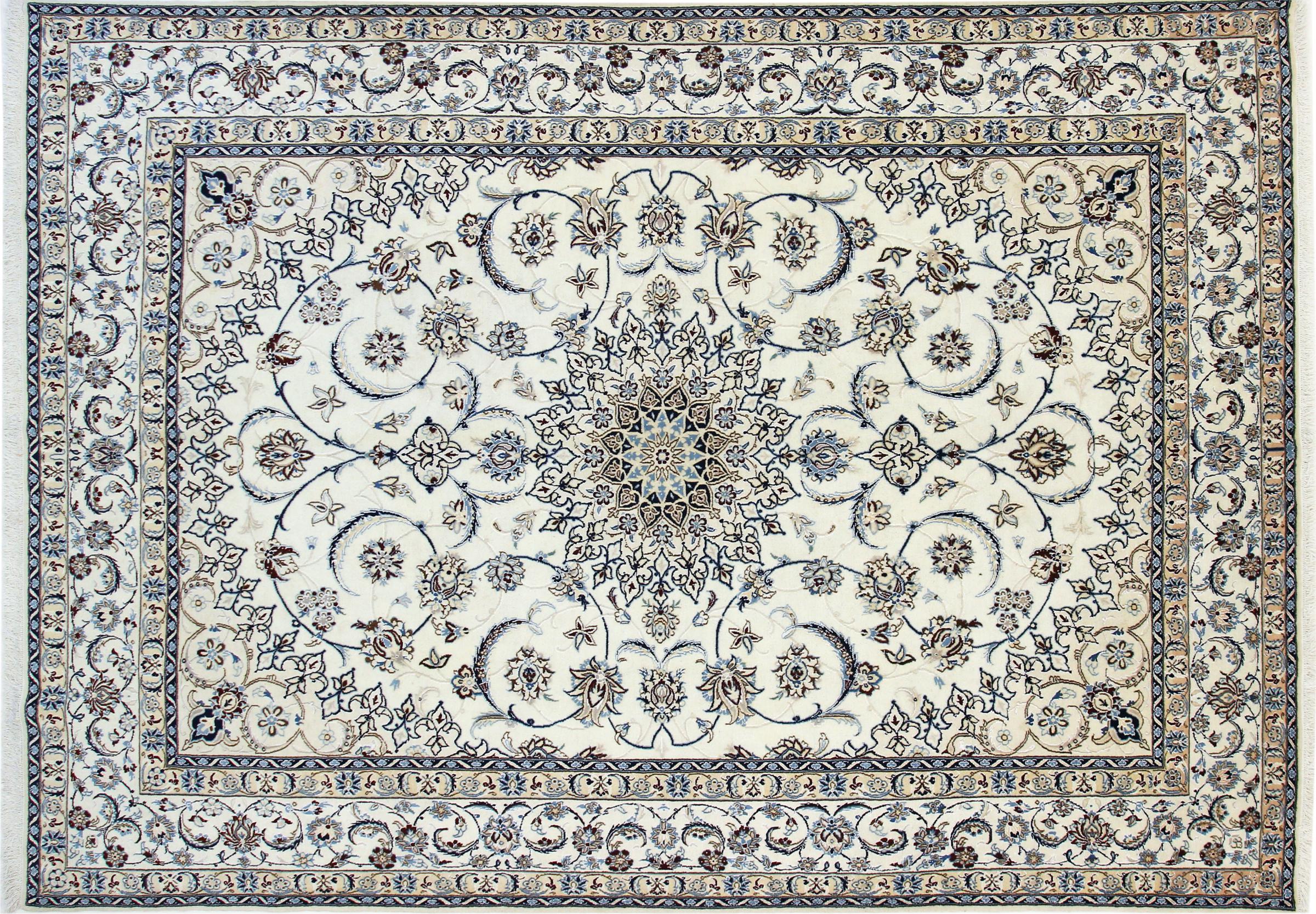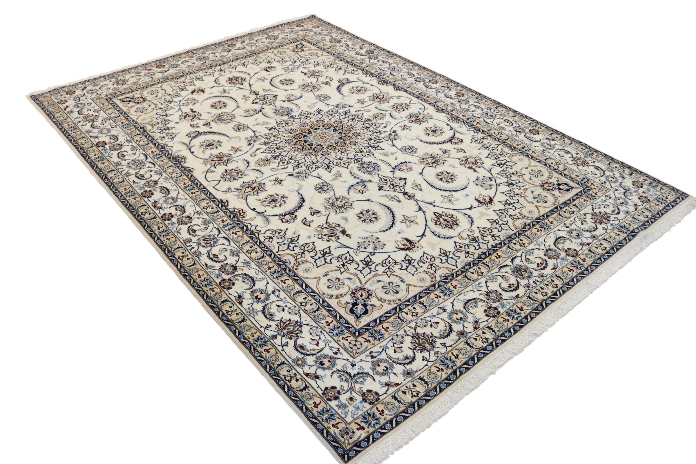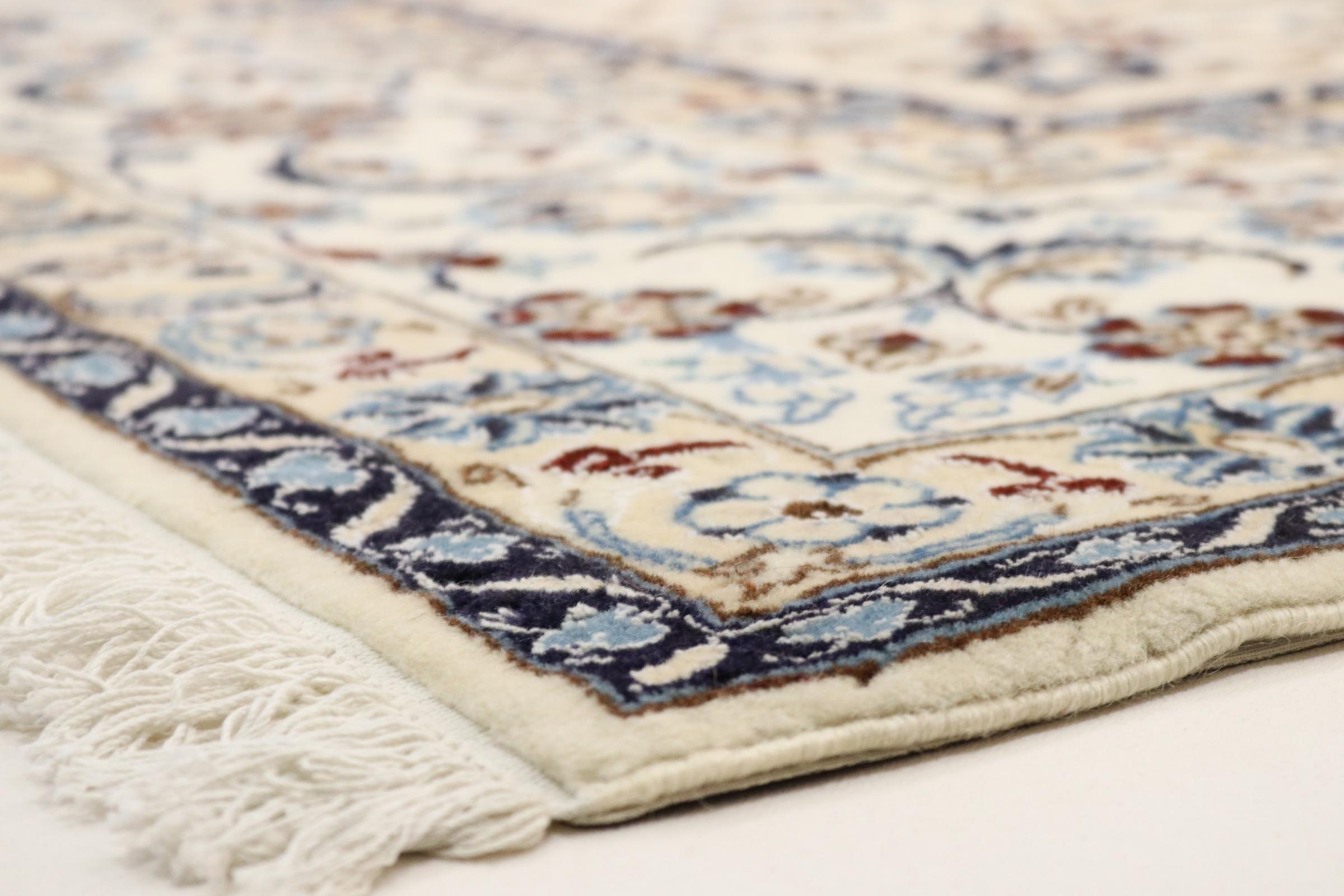 Este tapete Nain é classificado como 9La. A excelente qualidade e o belo desenho oriental com os seus padrões curvilíneos farão as delícias de qualquer comprador. Este tapete persa foi feito à mão na cidade de Nain, que fica na extremidade ocidental do deserto de Dasht-e-Kavir, a partir de lã de alta qualidade e seda natural. 9La Nain são claramente mais finos do que um 12La e já mostram belos detalhes.