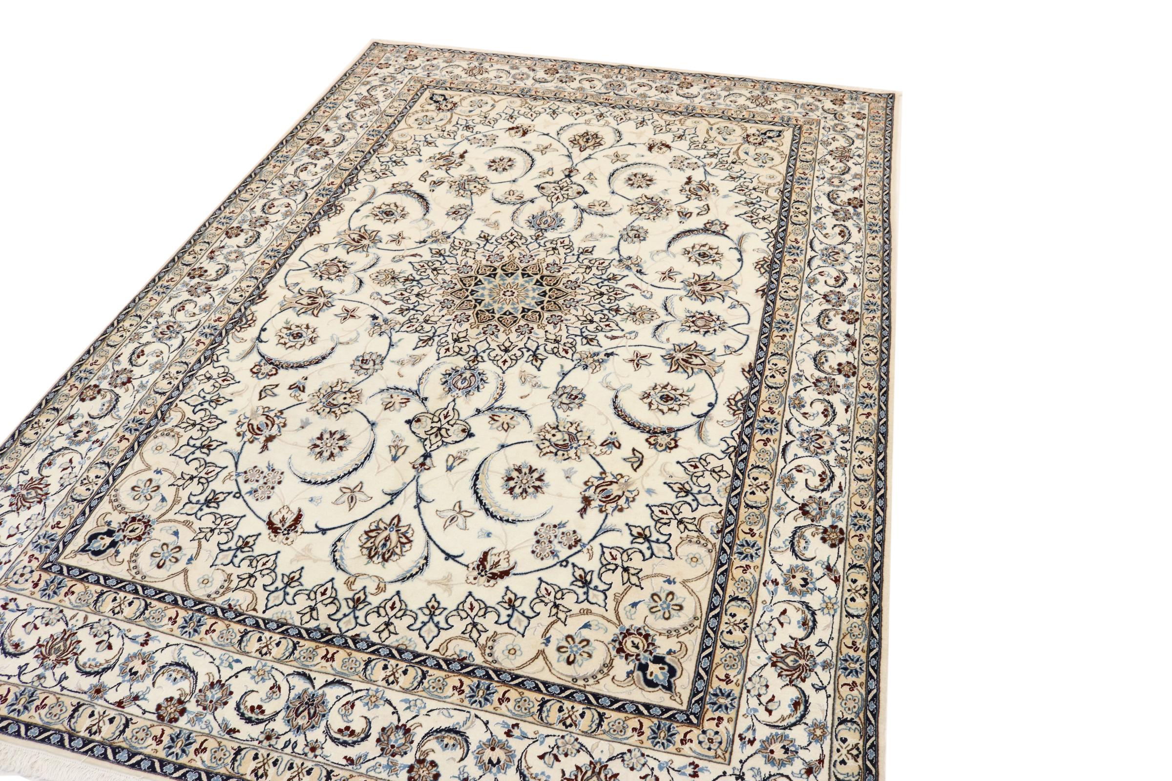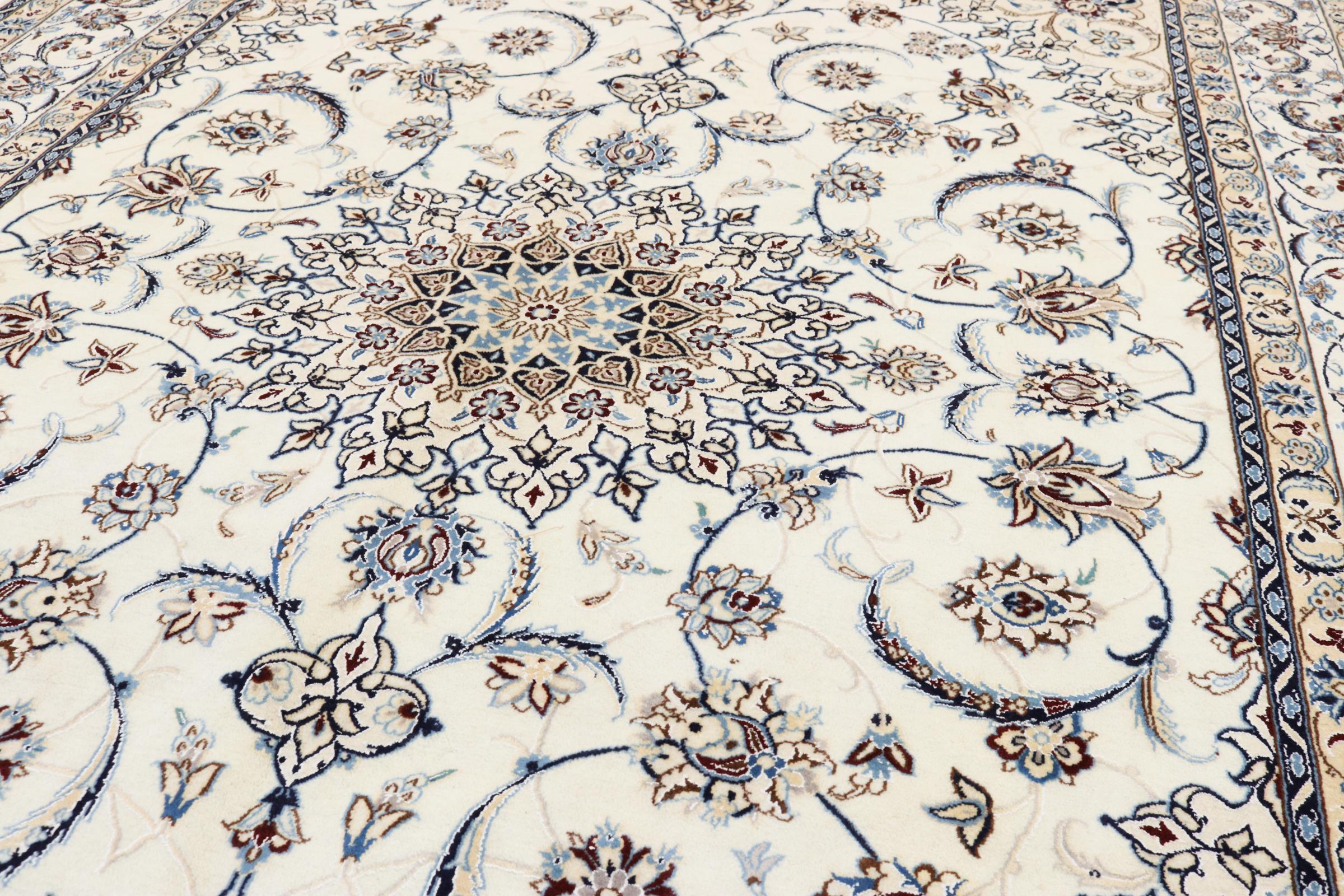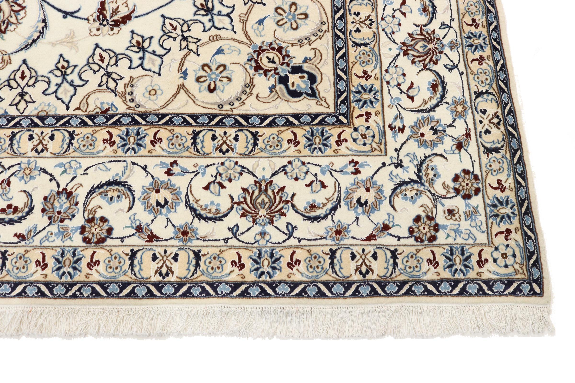 Este tapete Nain é classificado como 9La. A excelente qualidade e o belo desenho oriental com os seus padrões curvilíneos farão as delícias de qualquer comprador. Este tapete persa foi feito à mão na cidade de Nain, que fica na extremidade ocidental do deserto de Dasht-e-Kavir, a partir de lã de alta qualidade e seda natural. 9La Nain são claramente mais finos do que um 12La e já mostram belos detalhes.