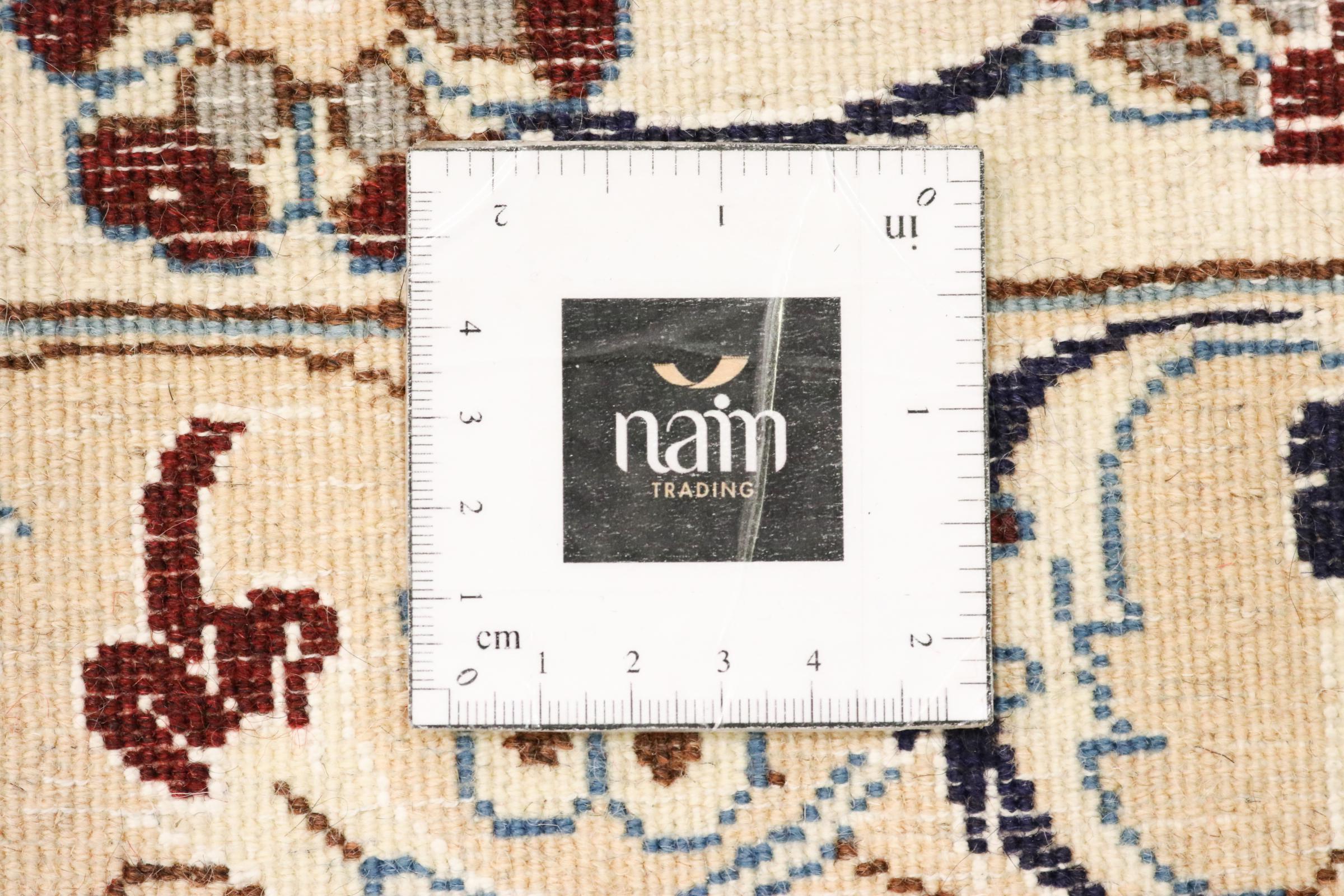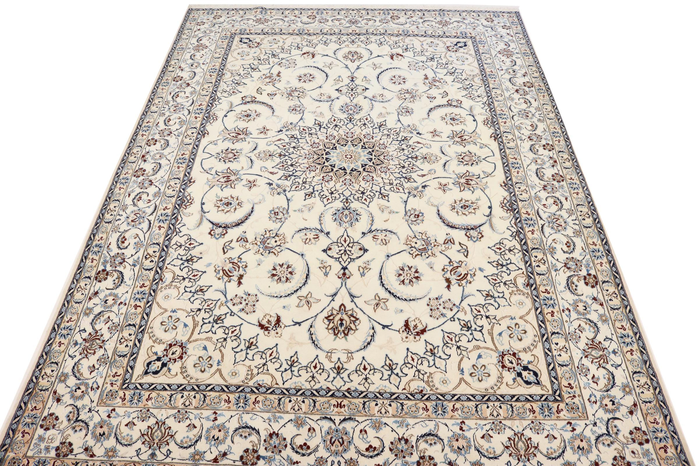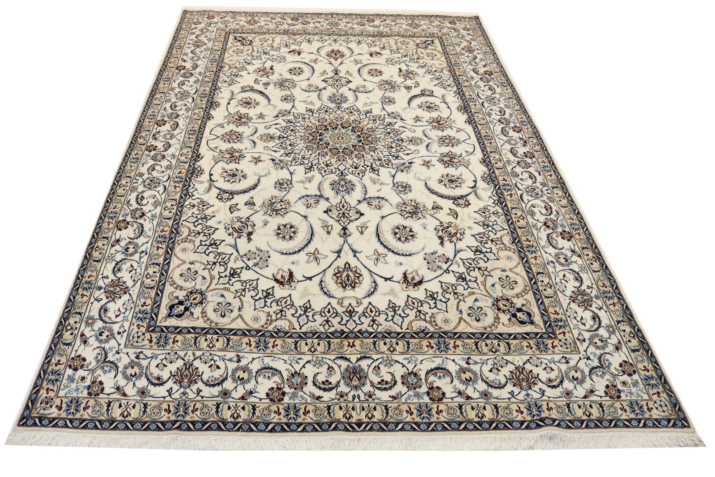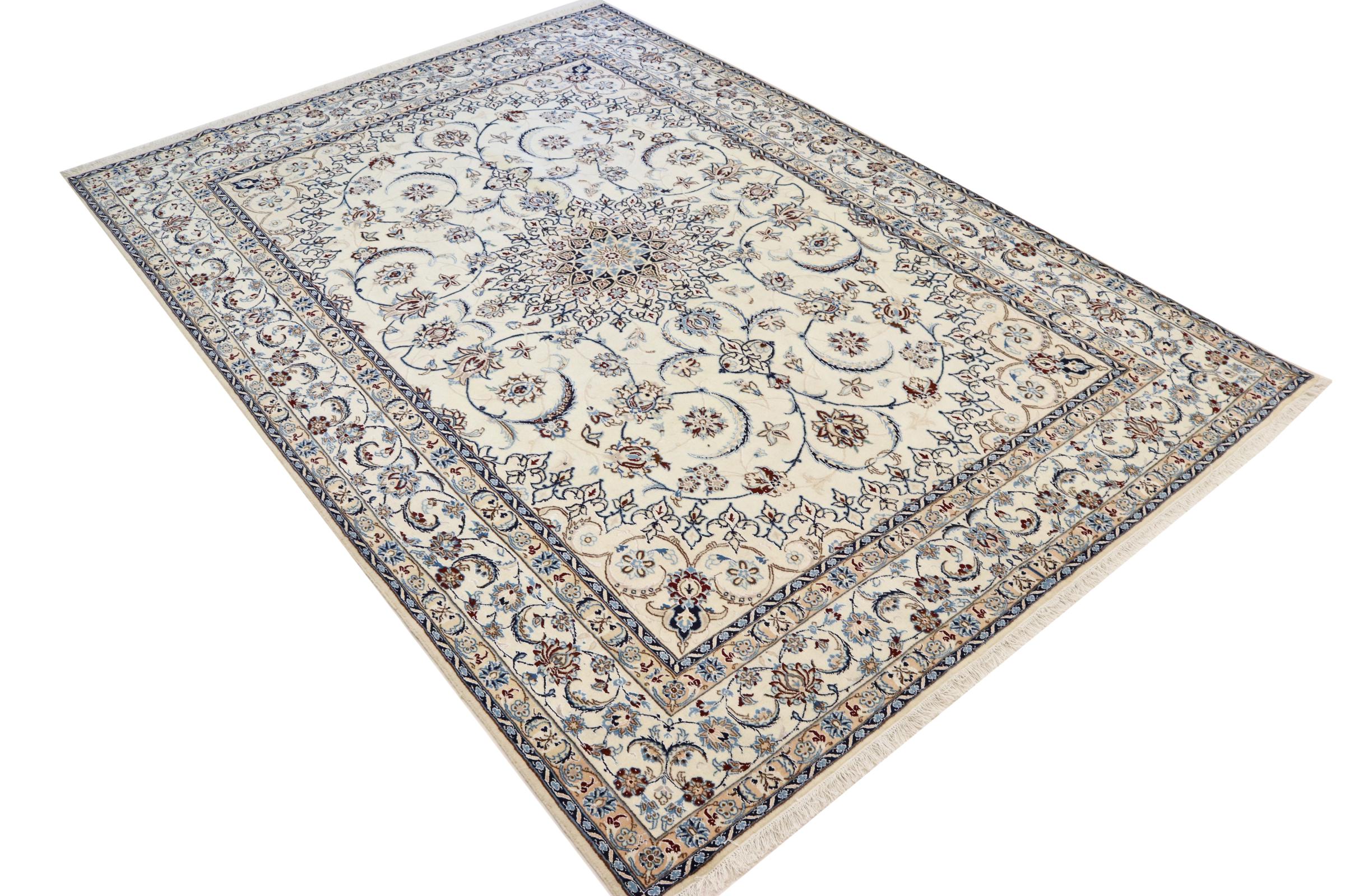 Este tapete Nain é classificado como 9La. A excelente qualidade e o belo desenho oriental com os seus padrões curvilíneos farão as delícias de qualquer comprador. Este tapete persa foi feito à mão na cidade de Nain, que fica na extremidade ocidental do deserto de Dasht-e-Kavir, a partir de lã de alta qualidade e seda natural. 9La Nain são claramente mais finos do que um 12La e já mostram belos detalhes.