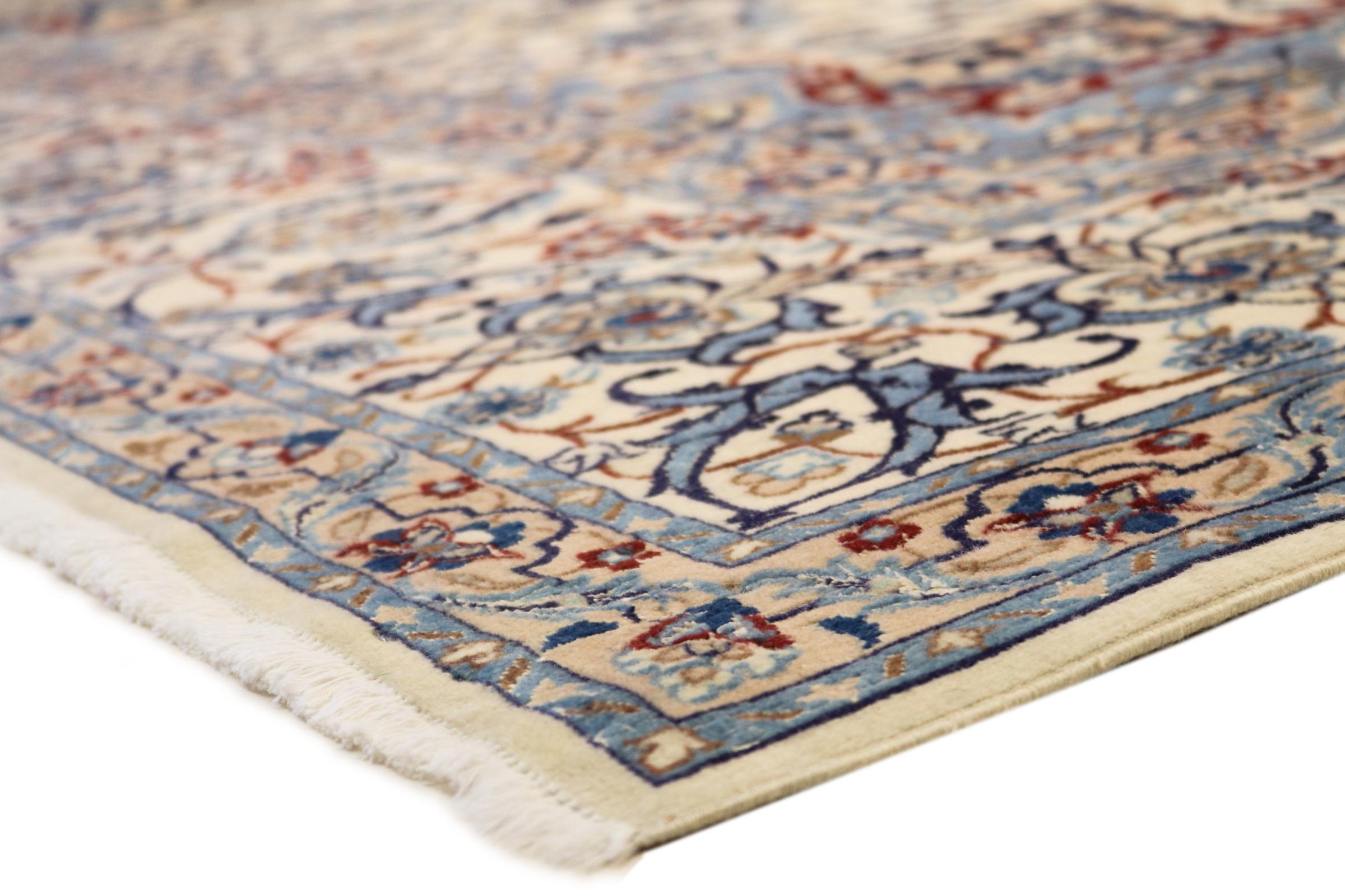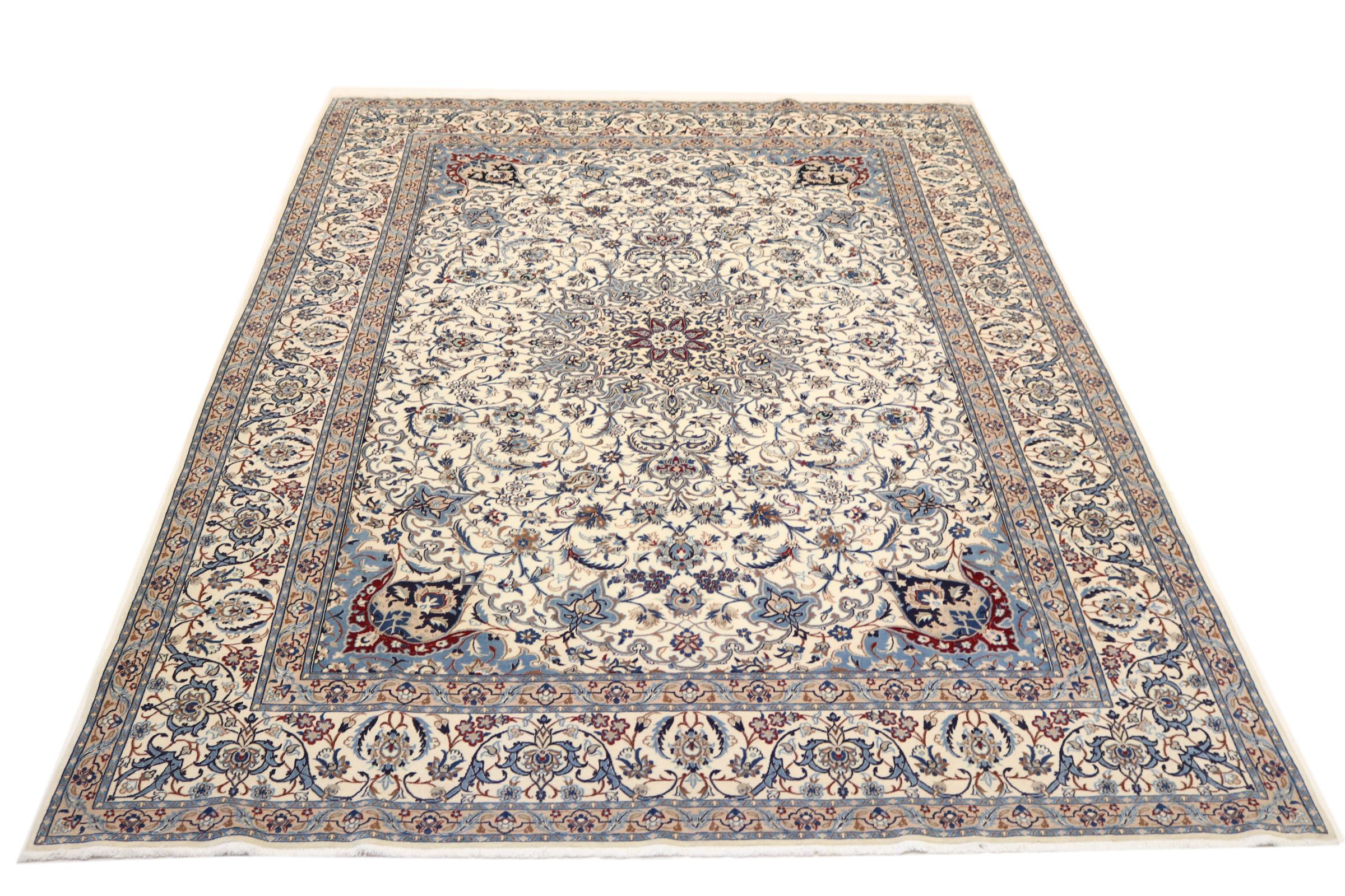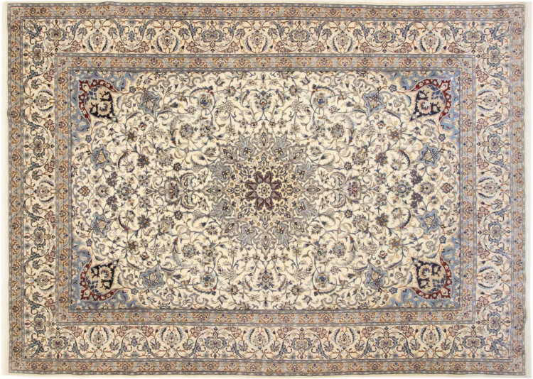 Este tapete Nain é classificado como 12La. Apresenta um aspecto elegante e requintado com a sua coloração típica Naín. Este tapete persa foi feito à mão na cidade de Nain, localizada no extremo oeste do deserto Dasht-e-Kavir, com lã de alta qualidade e seda natural. Com tamanho 12La, não é tão detalhado com ornamentação quanto 9La ou 6La Nain.