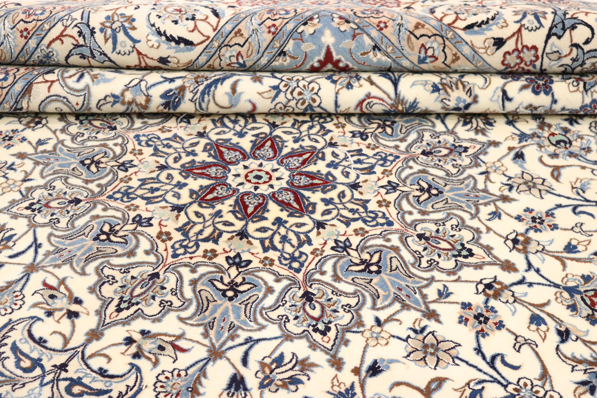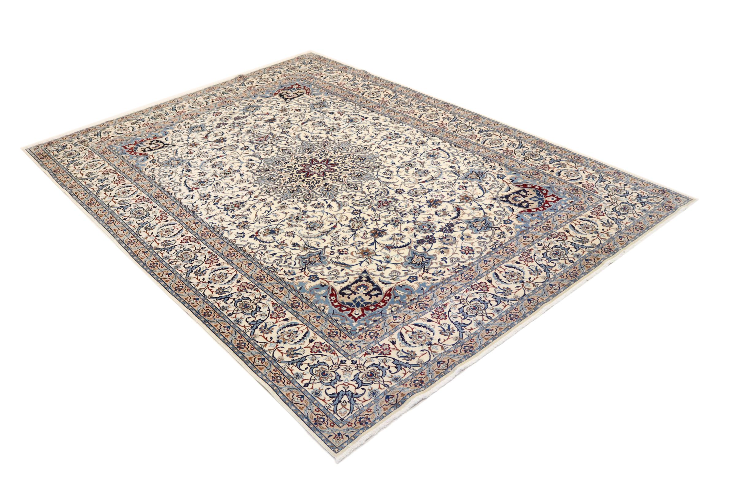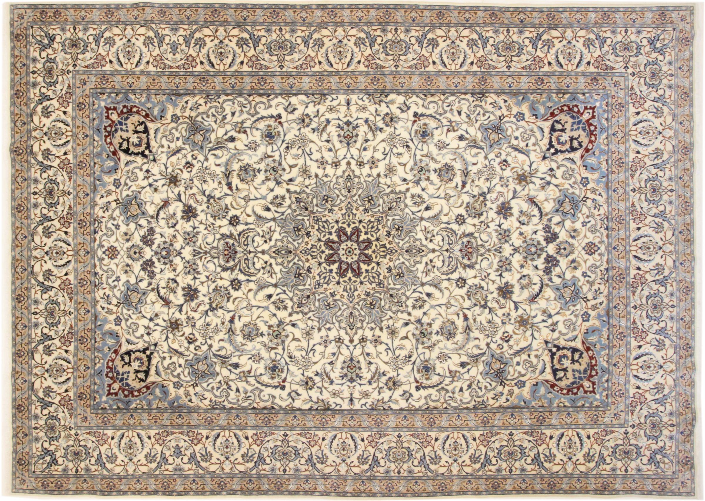 Este tapete Nain é classificado como 12La. Apresenta um aspecto elegante e requintado com a sua coloração típica Naín. Este tapete persa foi feito à mão na cidade de Nain, localizada no extremo oeste do deserto Dasht-e-Kavir, com lã de alta qualidade e seda natural. Com tamanho 12La, não é tão detalhado com ornamentação quanto 9La ou 6La Nain.