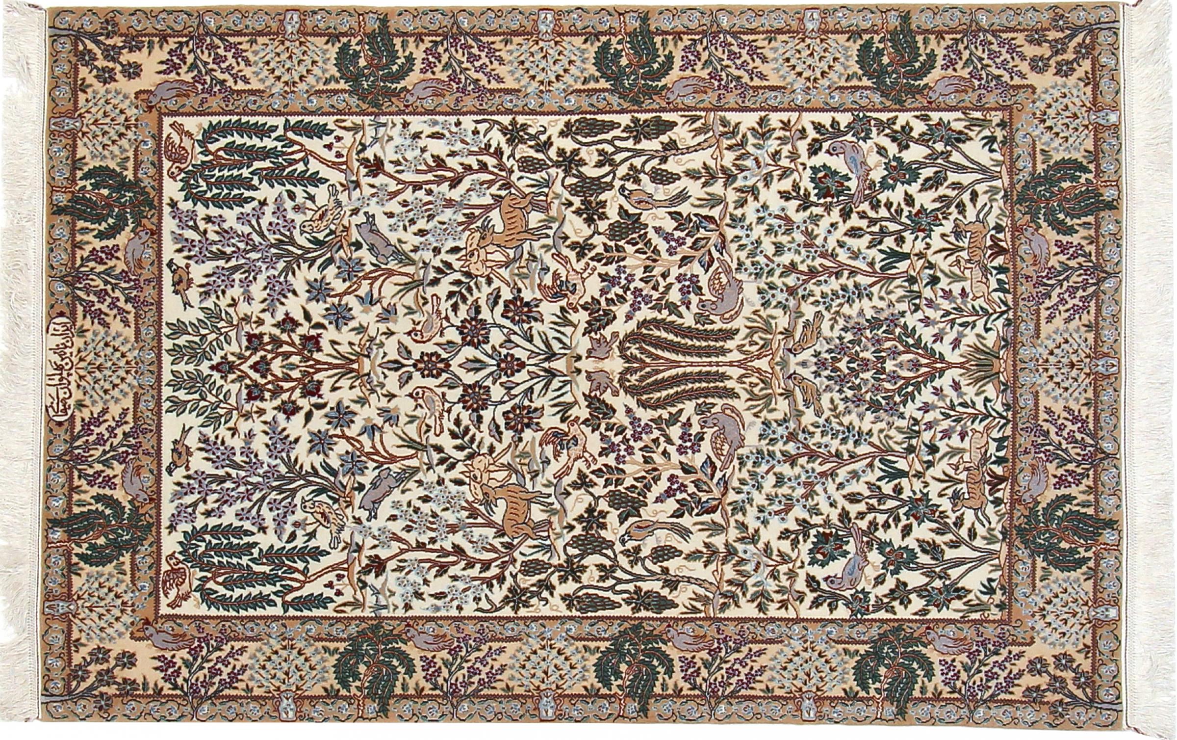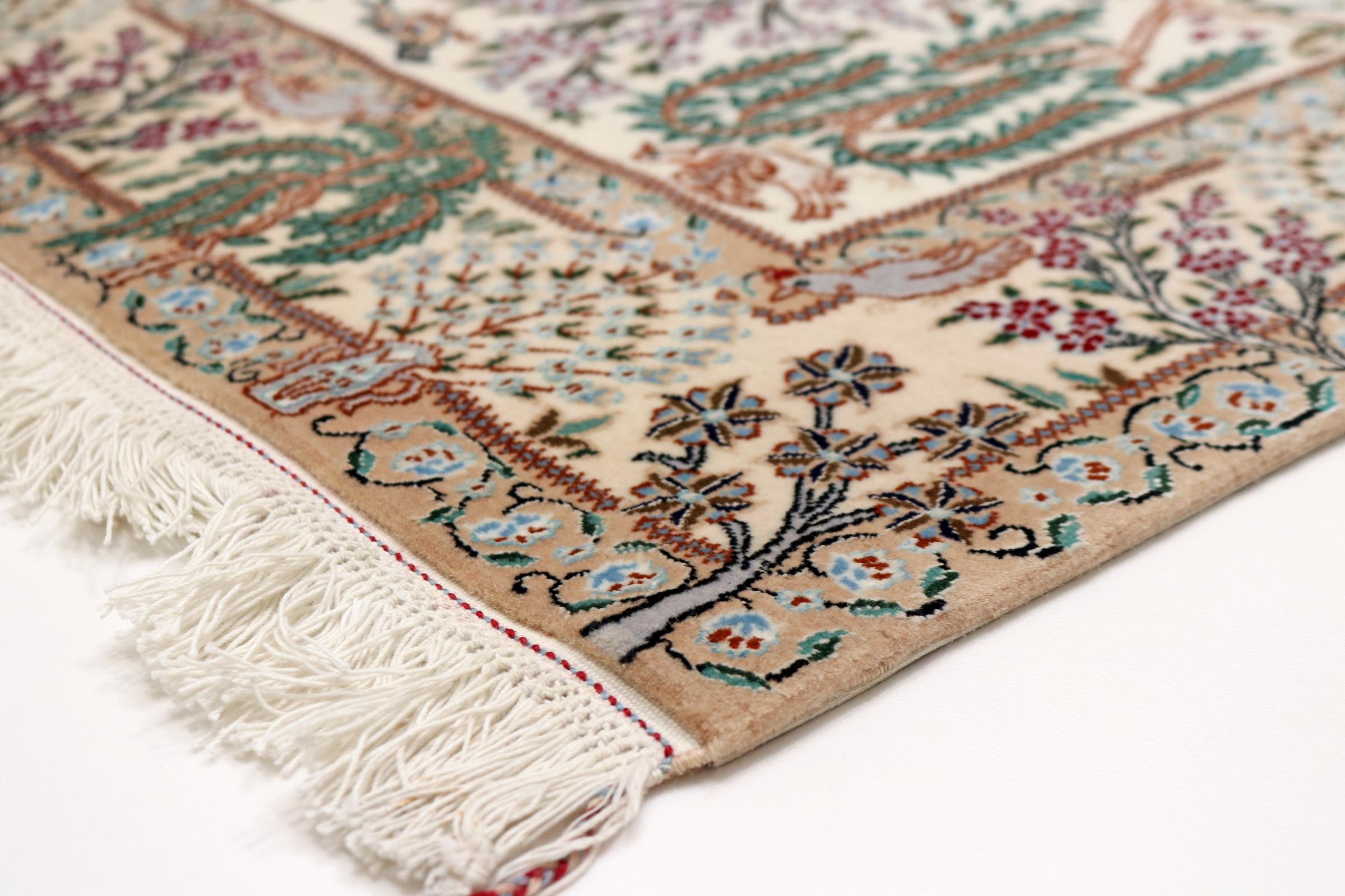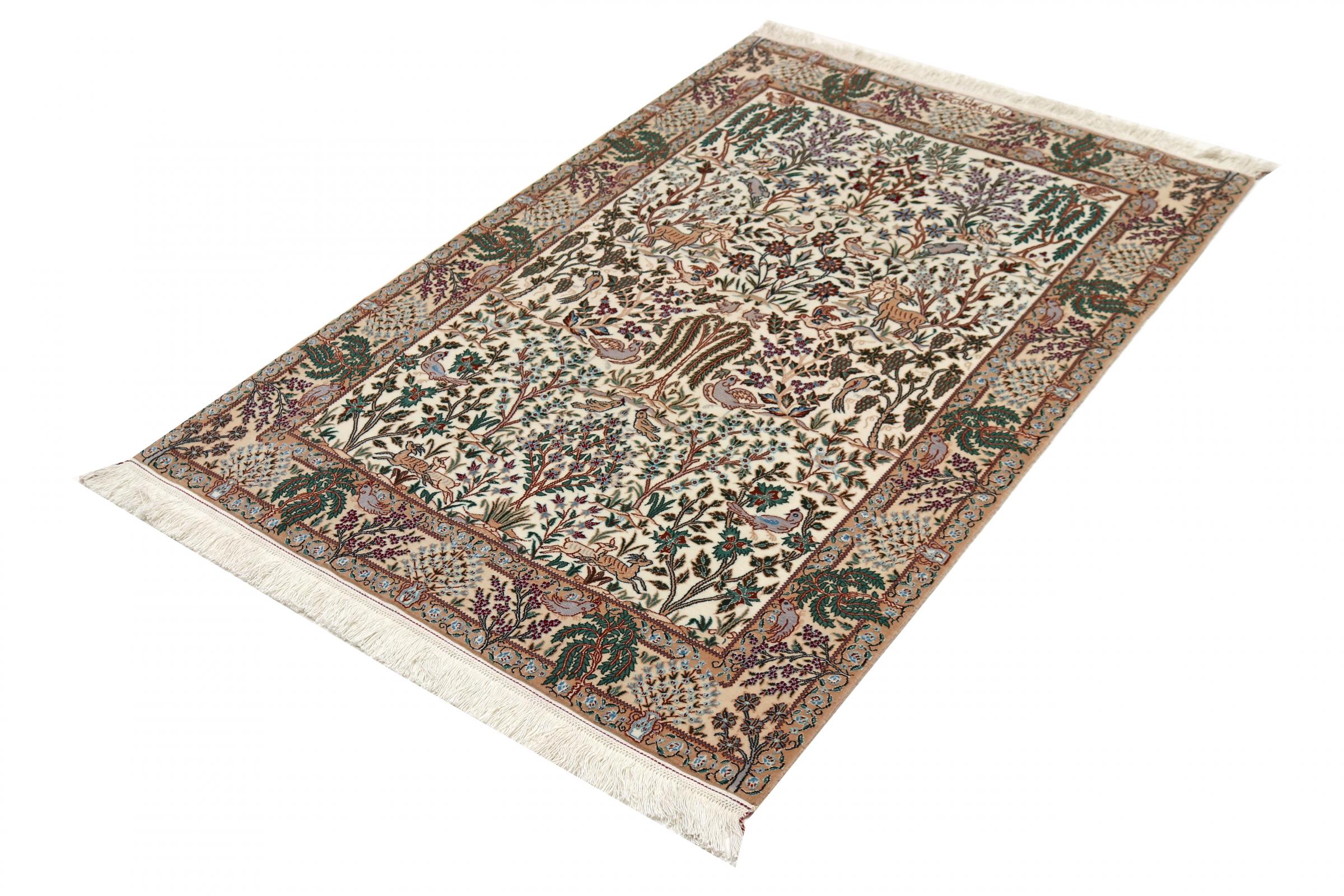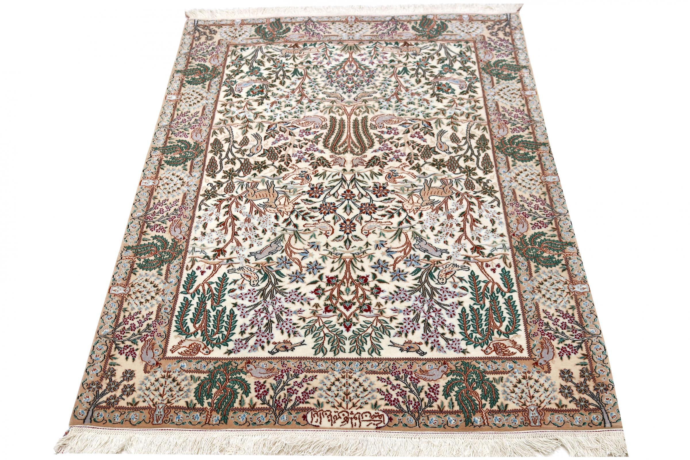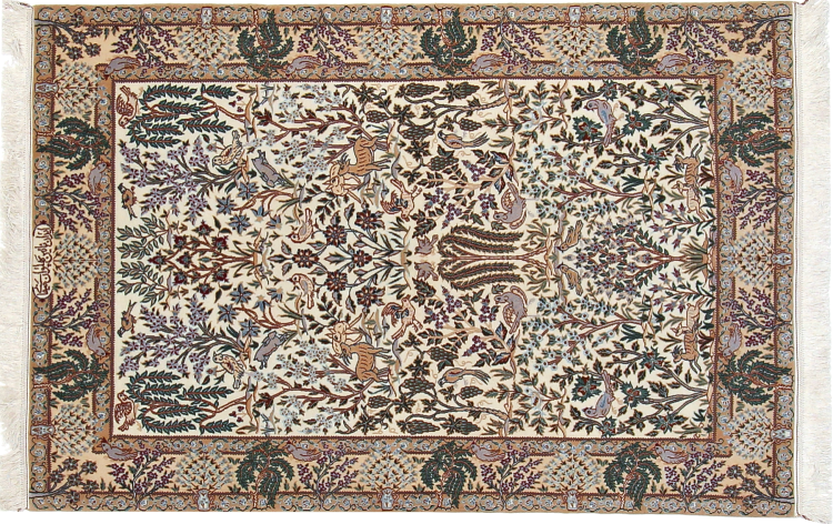 Nº do Tapete: 105930008123992 Tamanho: 149x99 cm Espessura: aproximadamente 6 mm Nós: 720 000 - 900 000 / m² Processamento: Atado à mão Veludo: Lã com seda Urdidura: Algodão Origem: Pérsia / Iran Idade: Novo Peso: aproximadamente 4 kg Em armazém: Único - Apenas 1 em stock