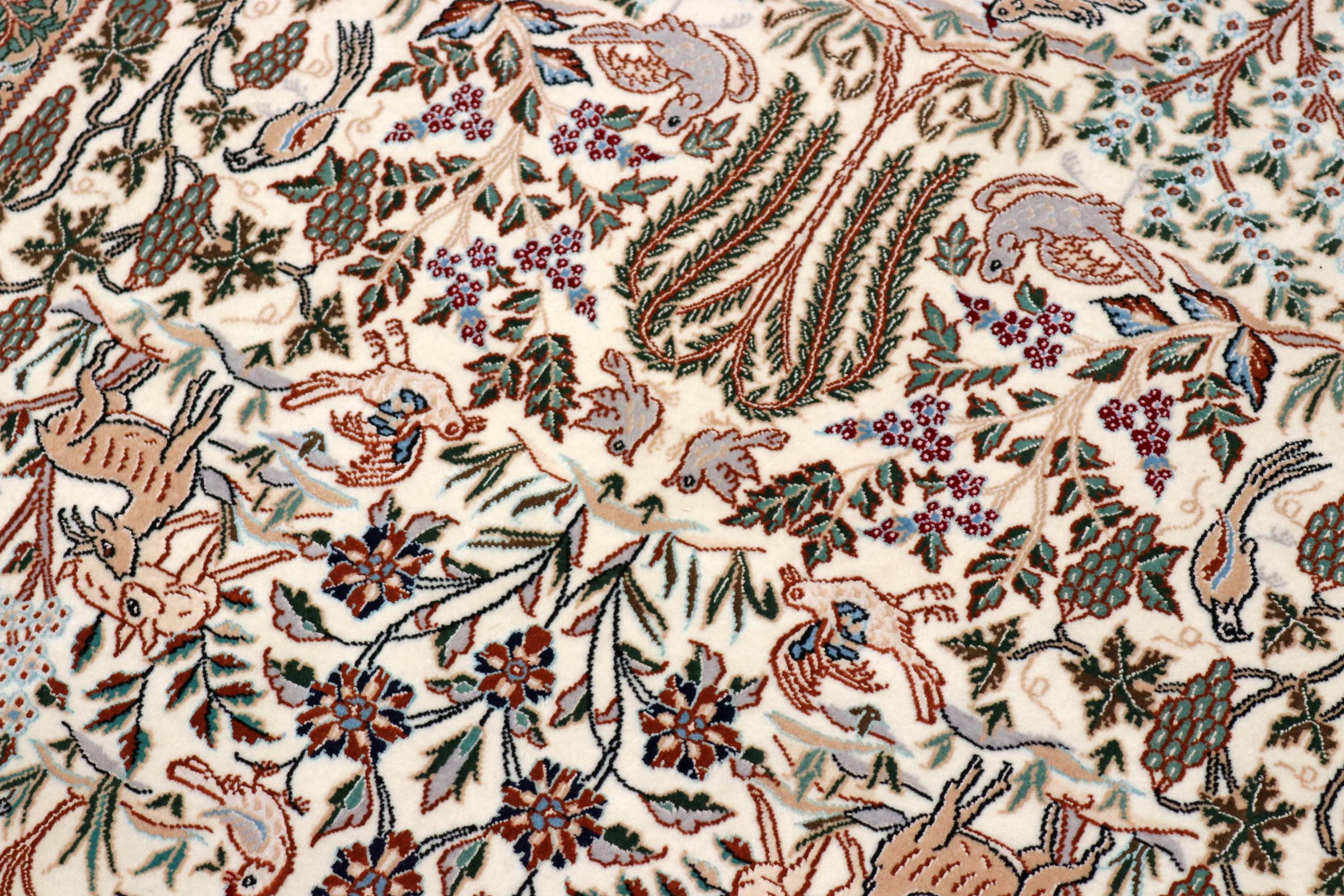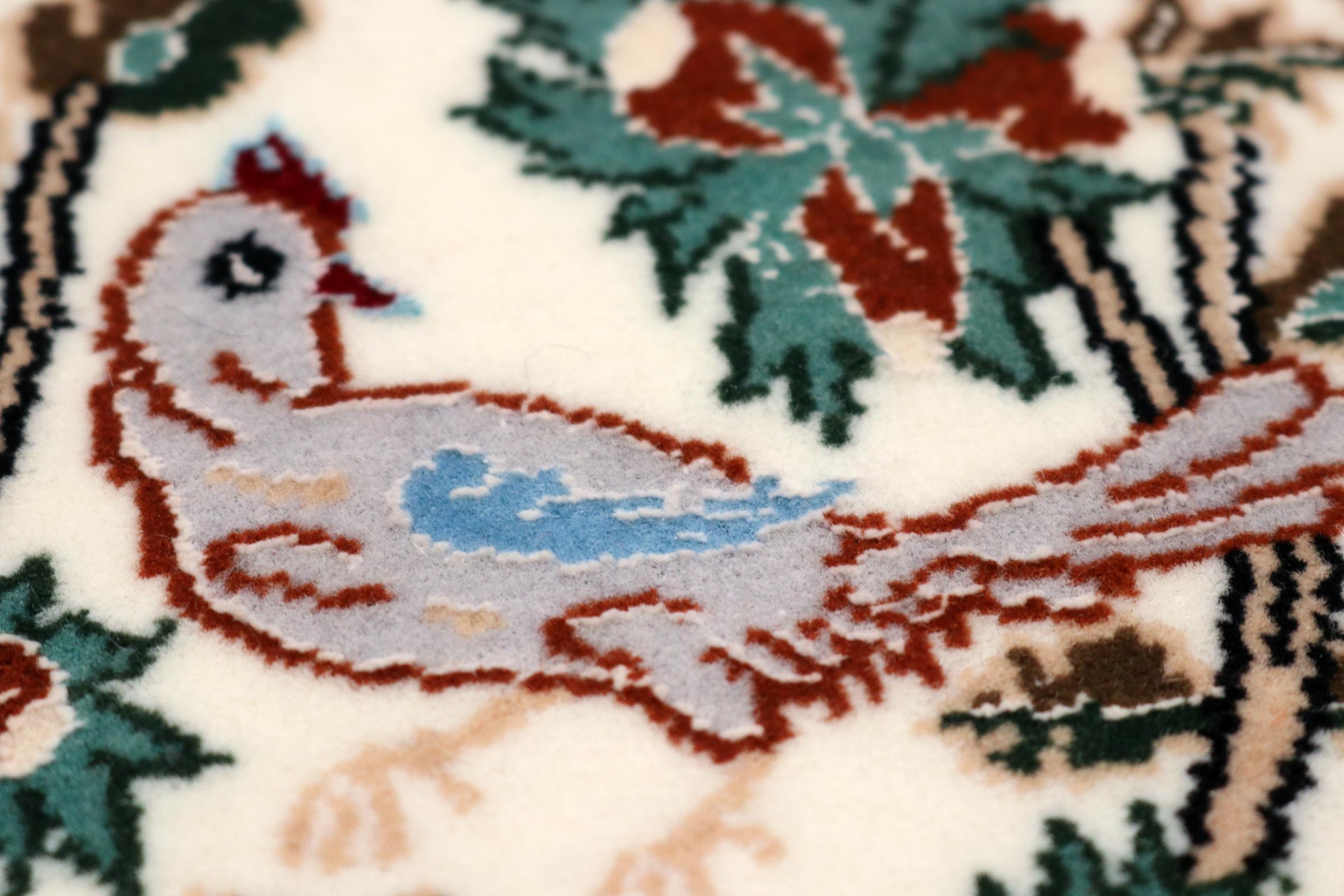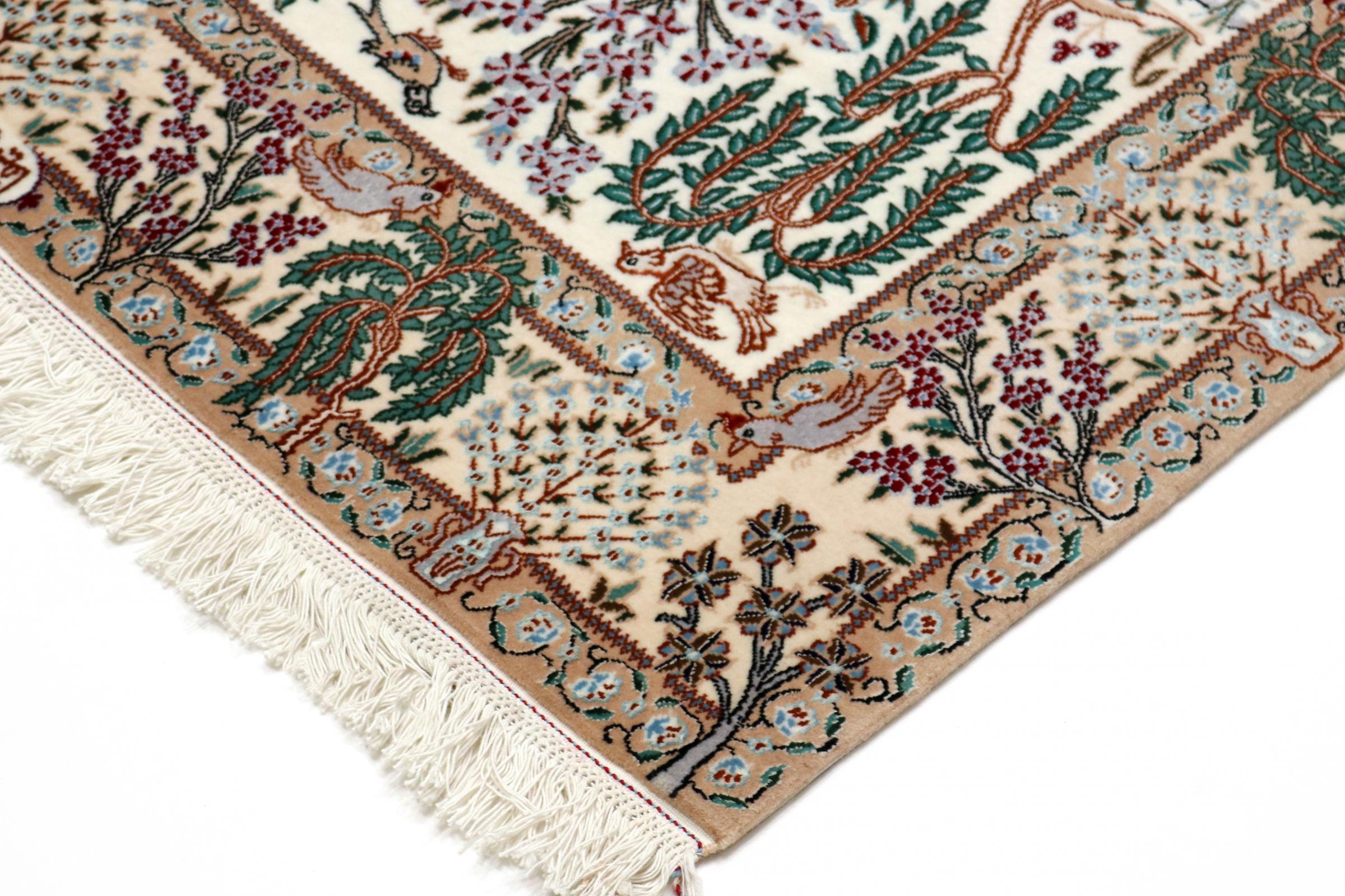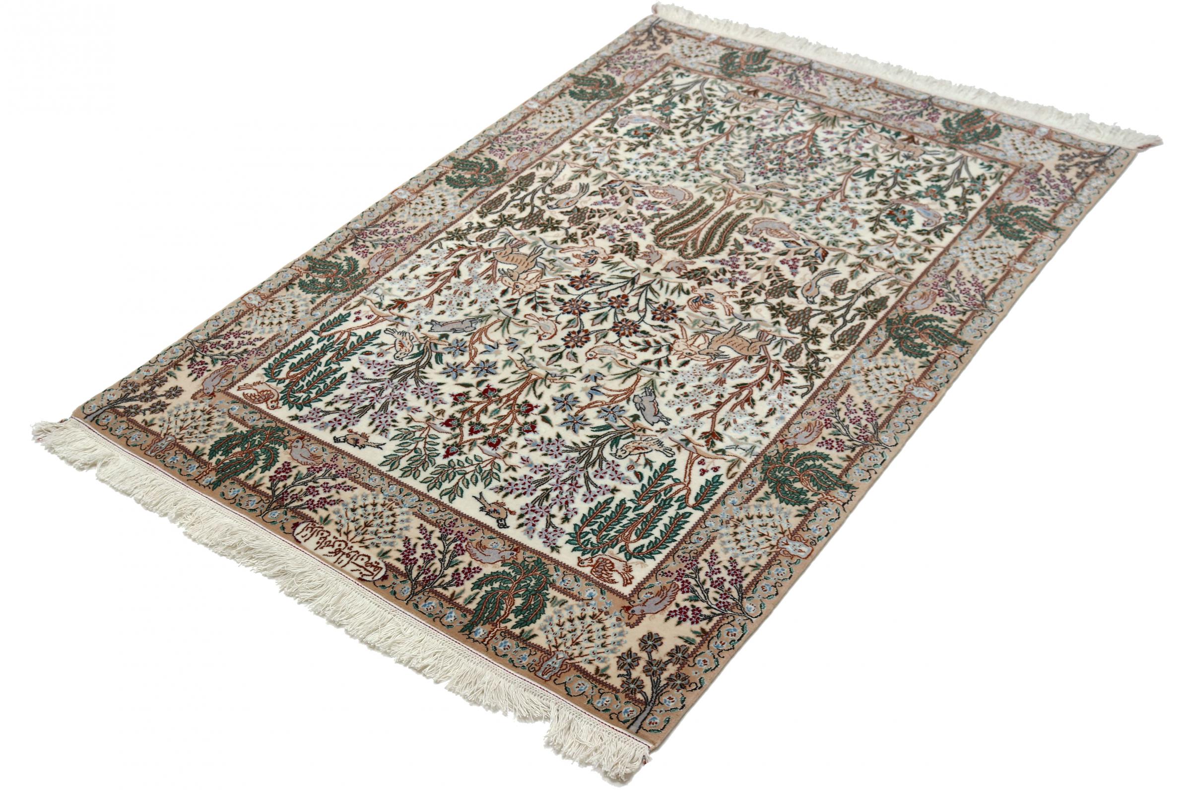 Nº do Tapete: 105930008123992 Tamanho: 149x99 cm Espessura: aproximadamente 6 mm Nós: 720 000 - 900 000 / m² Processamento: Atado à mão Veludo: Lã com seda Urdidura: Algodão Origem: Pérsia / Iran Idade: Novo Peso: aproximadamente 4 kg Em armazém: Único - Apenas 1 em stock