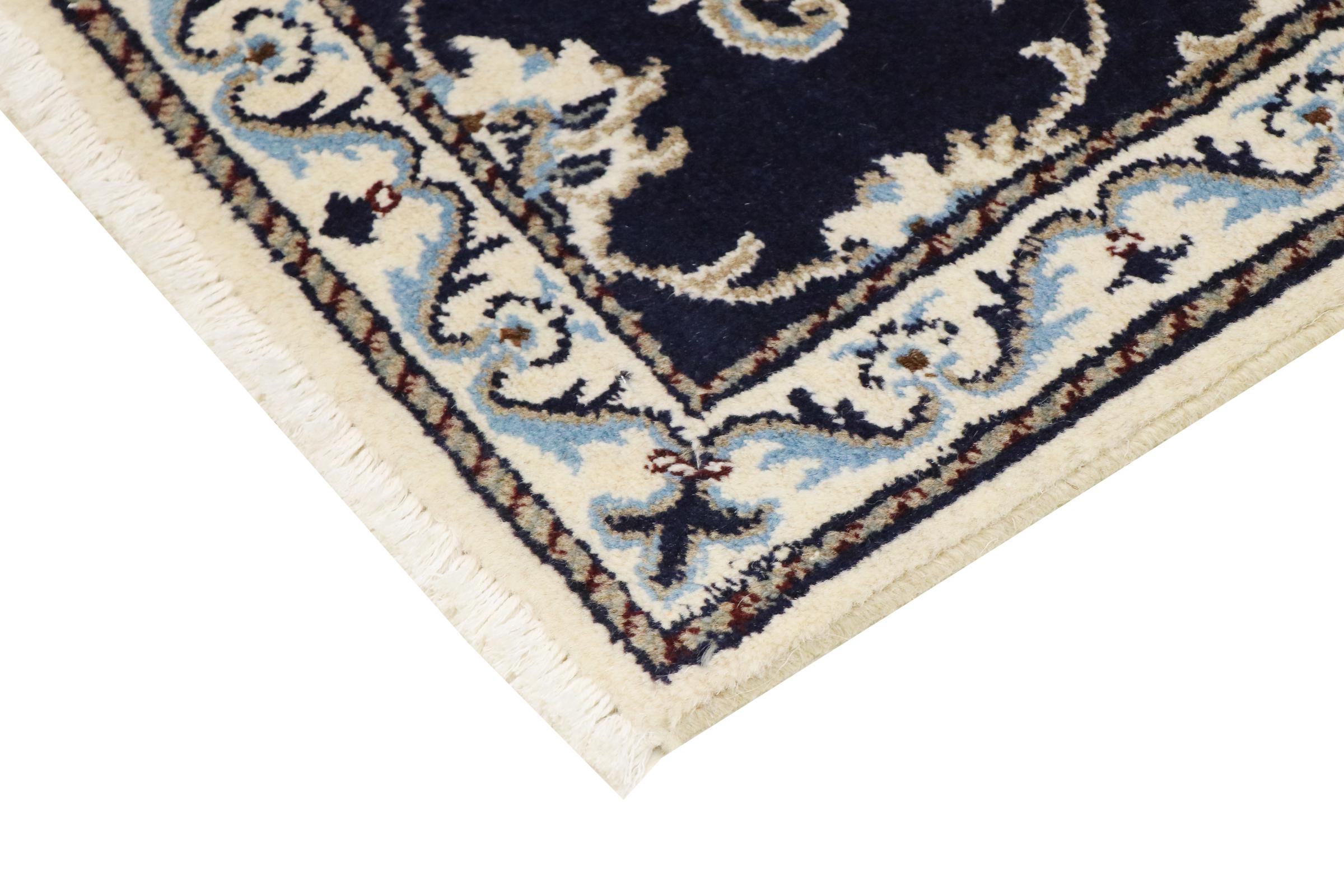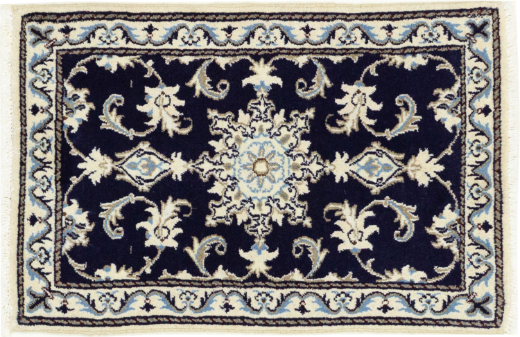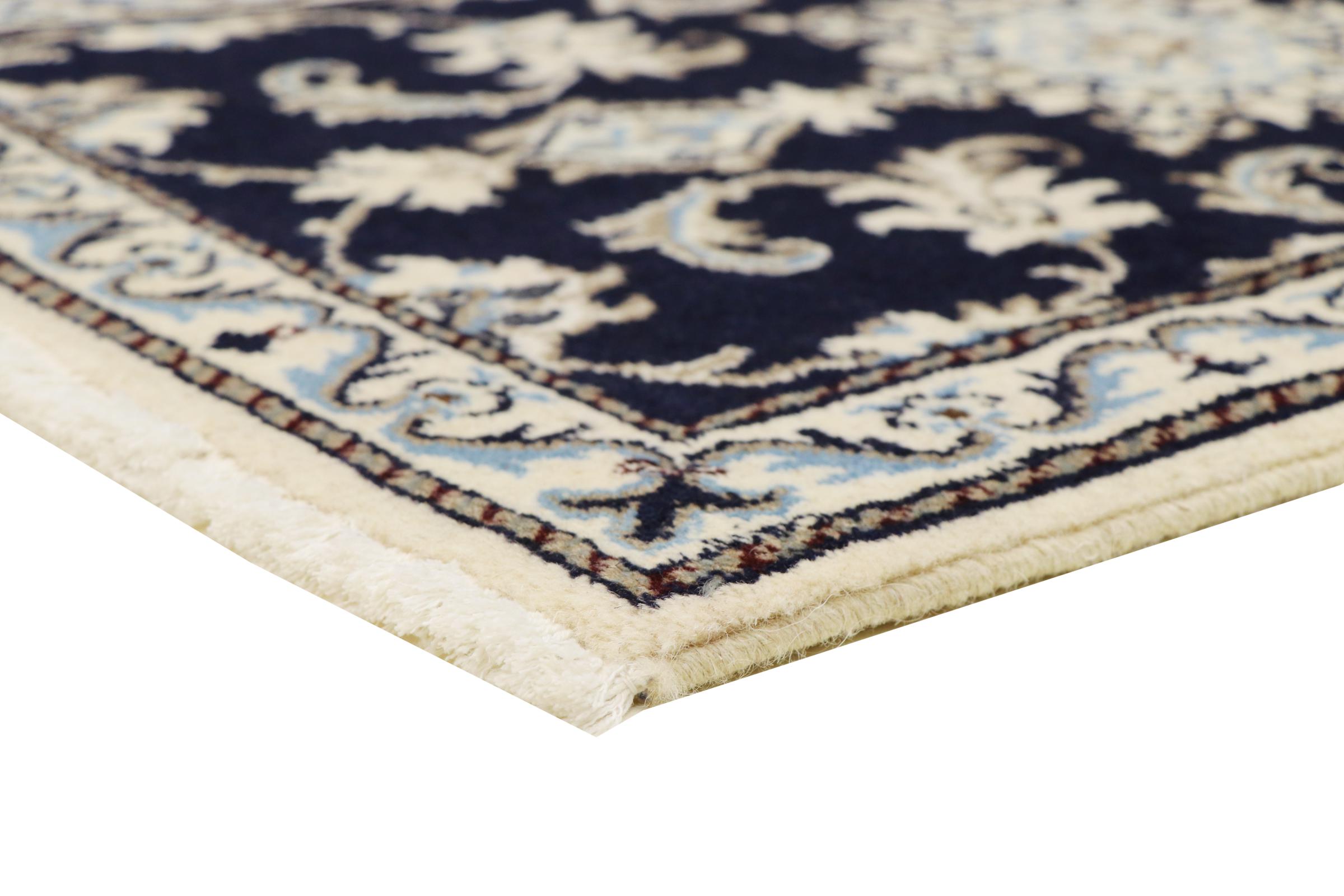 Este tapete Nain é classificado como 12La. Apresenta um aspecto elegante e requintado com a sua coloração típica Naín. Este tapete persa foi feito à mão na cidade de Nain, localizada no extremo oeste do deserto Dasht-e-Kavir, com lã de alta qualidade e seda natural. Com tamanho 12La, não é tão detalhado com ornamentação quanto 9La ou 6La Nain.