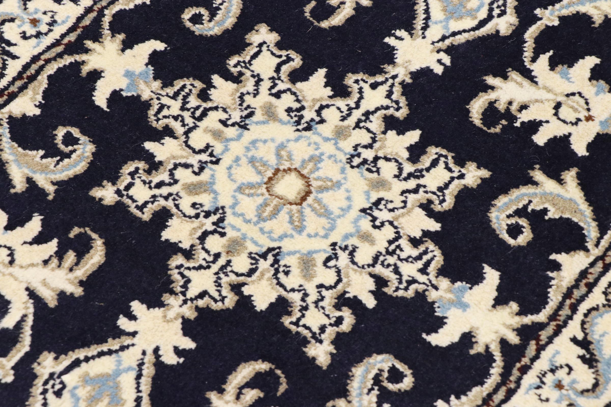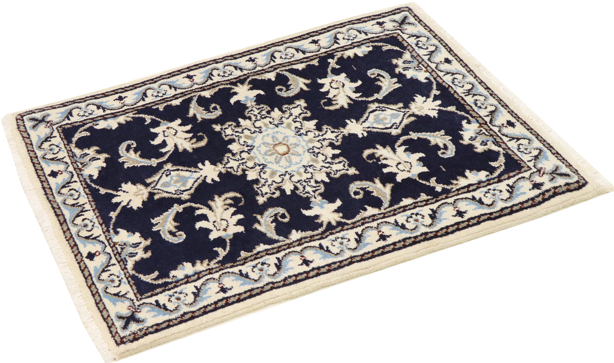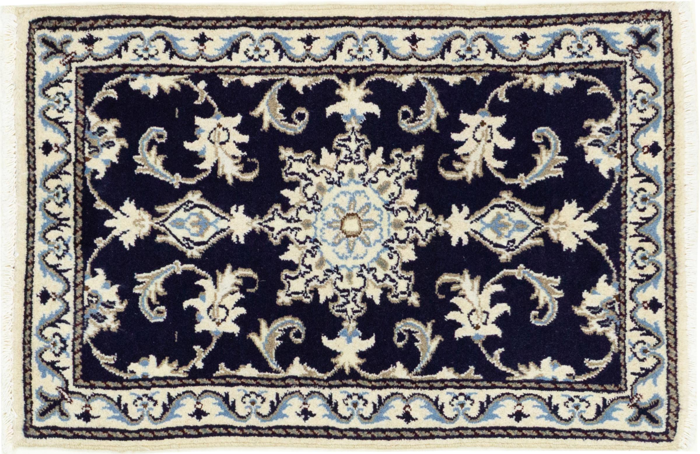 Este tapete Nain é classificado como 12La. Apresenta um aspecto elegante e requintado com a sua coloração típica Naín. Este tapete persa foi feito à mão na cidade de Nain, localizada no extremo oeste do deserto Dasht-e-Kavir, com lã de alta qualidade e seda natural. Com tamanho 12La, não é tão detalhado com ornamentação quanto 9La ou 6La Nain.