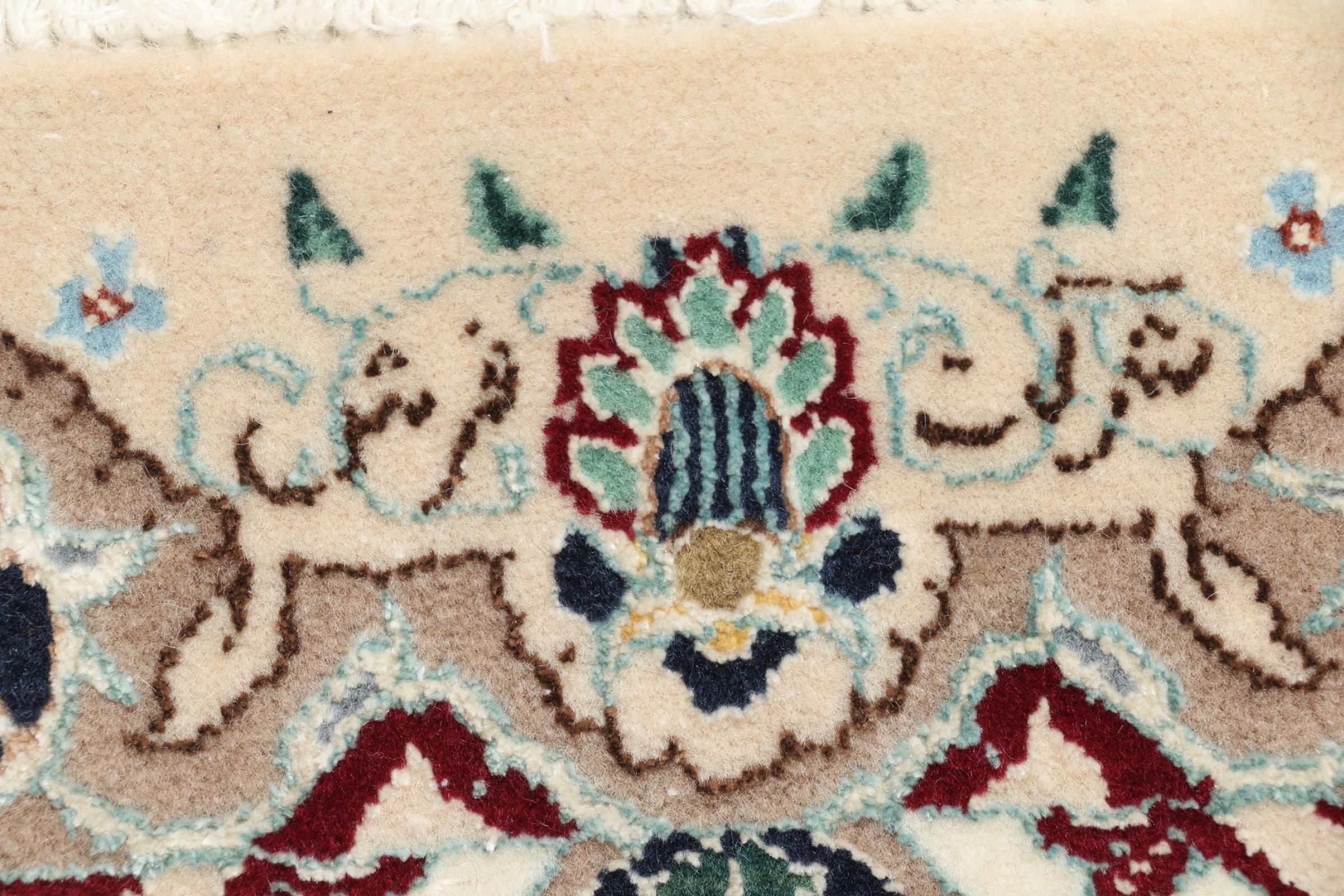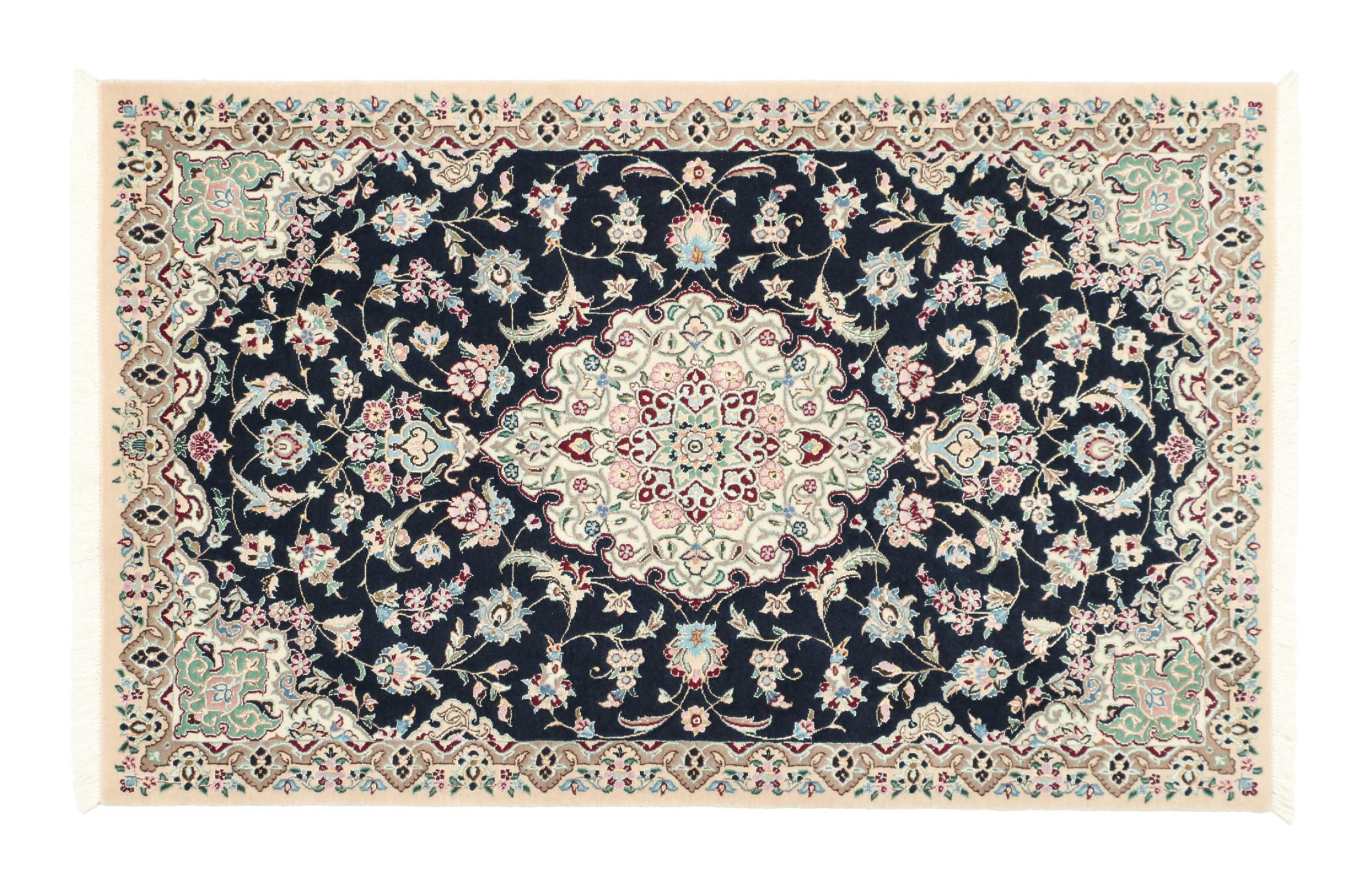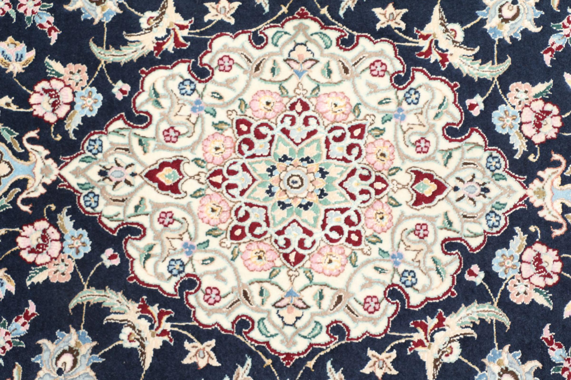 Este tapete Nain é classificado como 9La. A excelente qualidade e o belo desenho oriental com os seus padrões curvilíneos farão as delícias de qualquer comprador. Este tapete persa foi feito à mão na cidade de Nain, que fica na extremidade ocidental do deserto de Dasht-e-Kavir, a partir de lã de alta qualidade e seda natural. 9La Nain são claramente mais finos do que um 12La e já mostram belos detalhes.