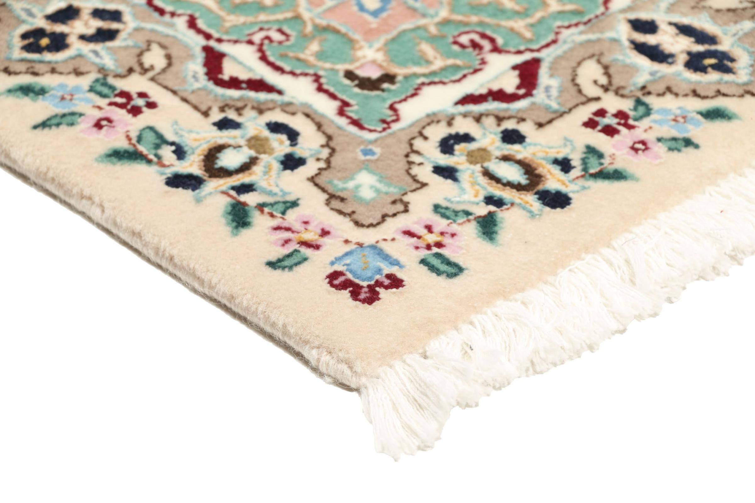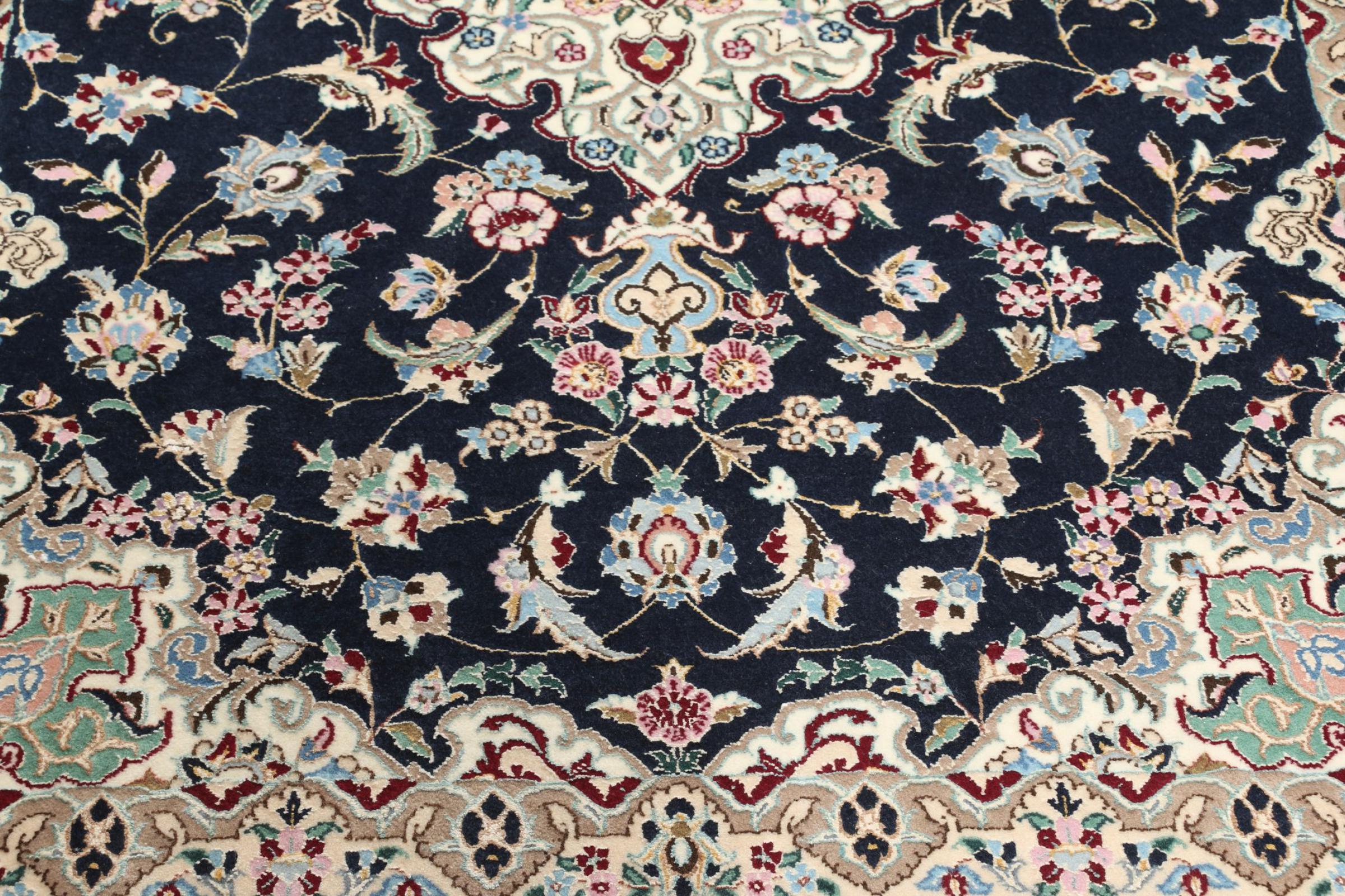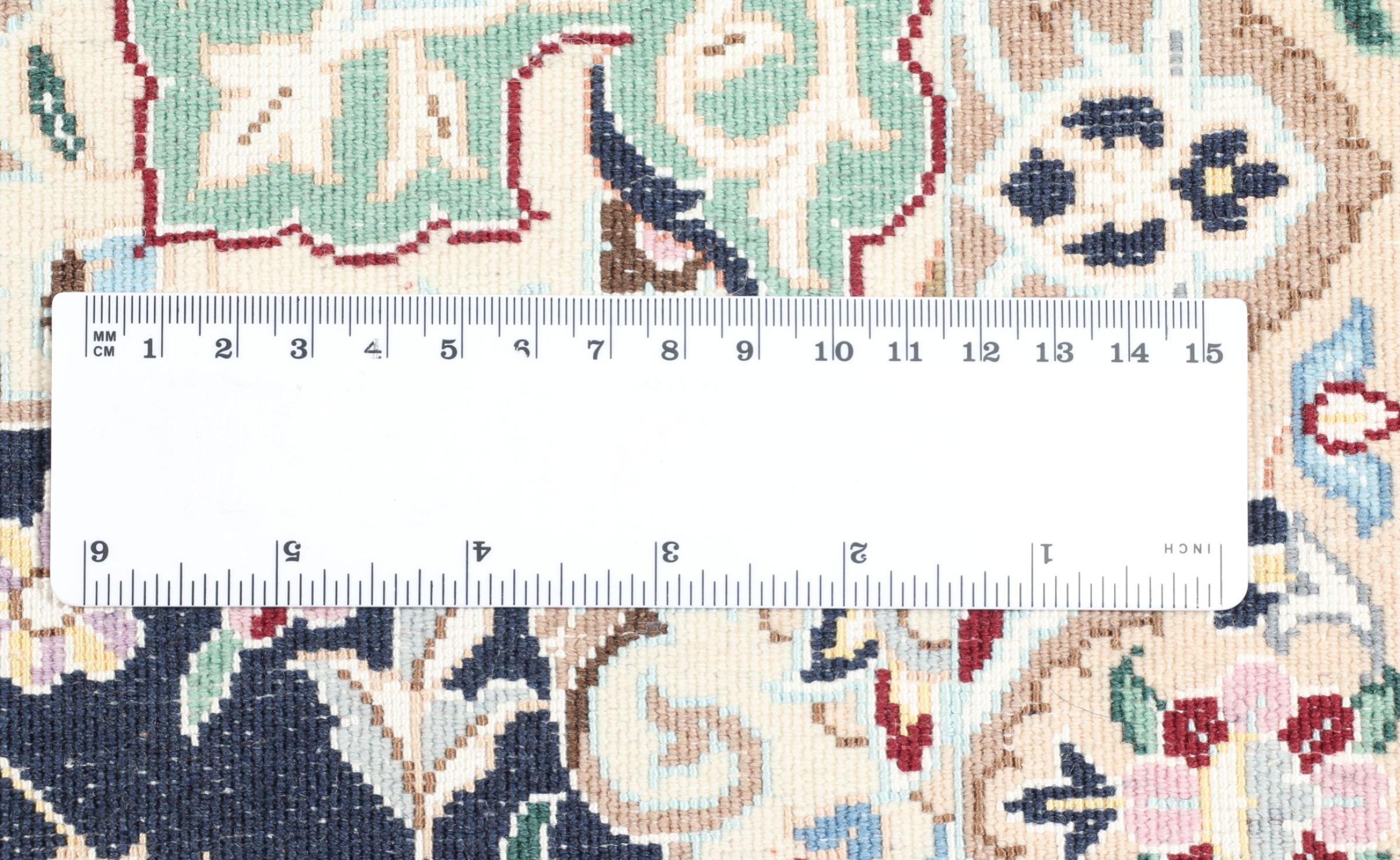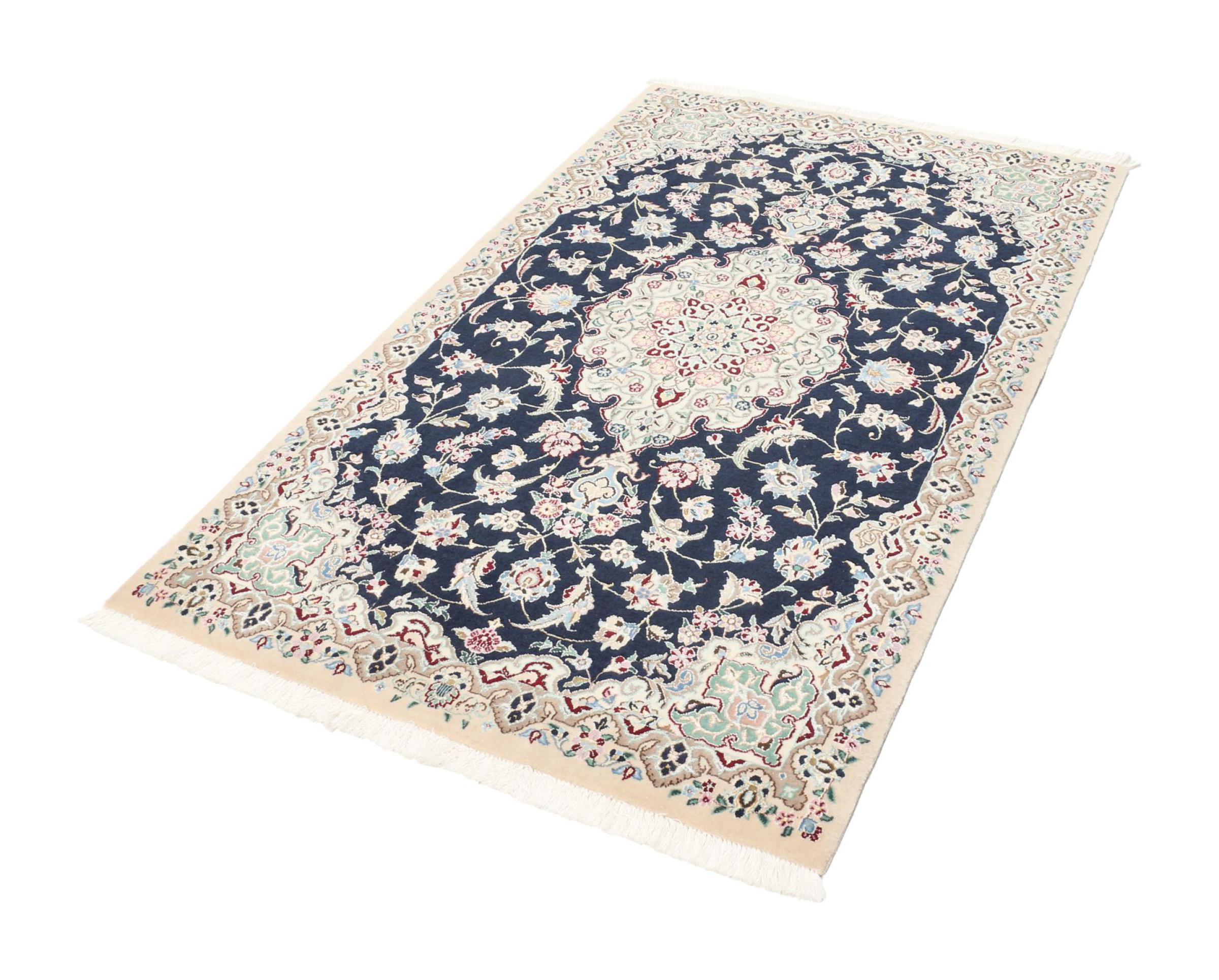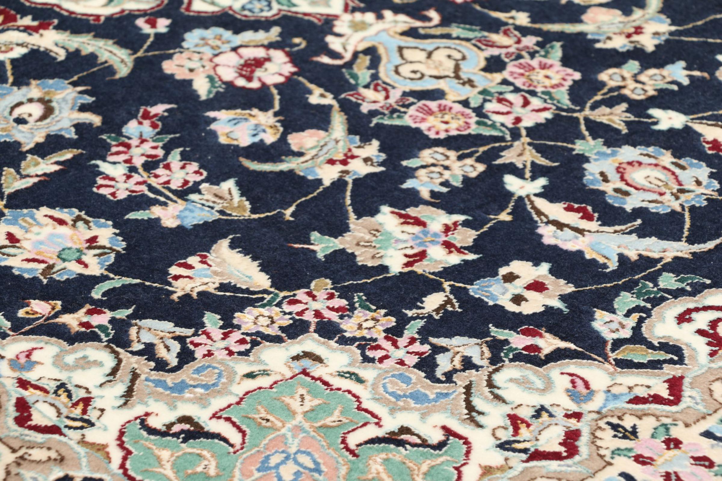 Este tapete Nain é classificado como 9La. A excelente qualidade e o belo desenho oriental com os seus padrões curvilíneos farão as delícias de qualquer comprador. Este tapete persa foi feito à mão na cidade de Nain, que fica na extremidade ocidental do deserto de Dasht-e-Kavir, a partir de lã de alta qualidade e seda natural. 9La Nain são claramente mais finos do que um 12La e já mostram belos detalhes.