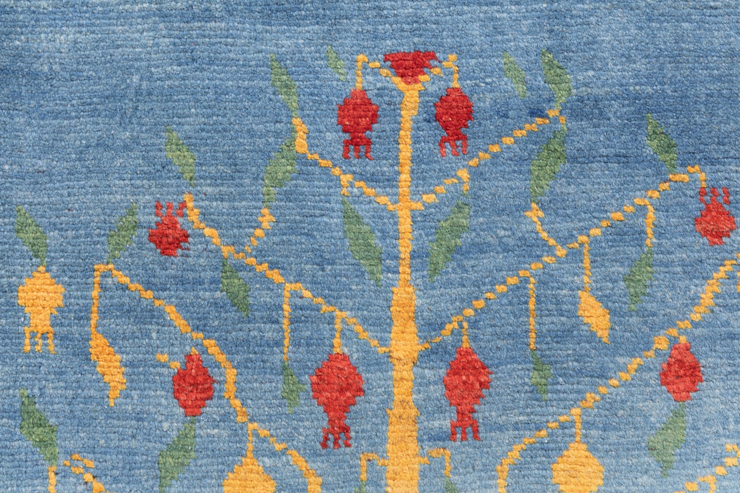 Este tapete é feito de lã de ovelha fiada à mão, da mais alta qualidade. Especialmente no Irão (antiga Pérsia), Afeganistão e Paquistão, a lã ainda é fiada à mão antes do início do nó do tapete. A lã tem provado ser um material natural e extremamente resistente ao longo dos séculos. Entre outras coisas, tem propriedades repelentes de impurezas e isolantes térmicos. Ao mesmo tempo, a lã é incomparavelmente macia e tem um brilho natural.