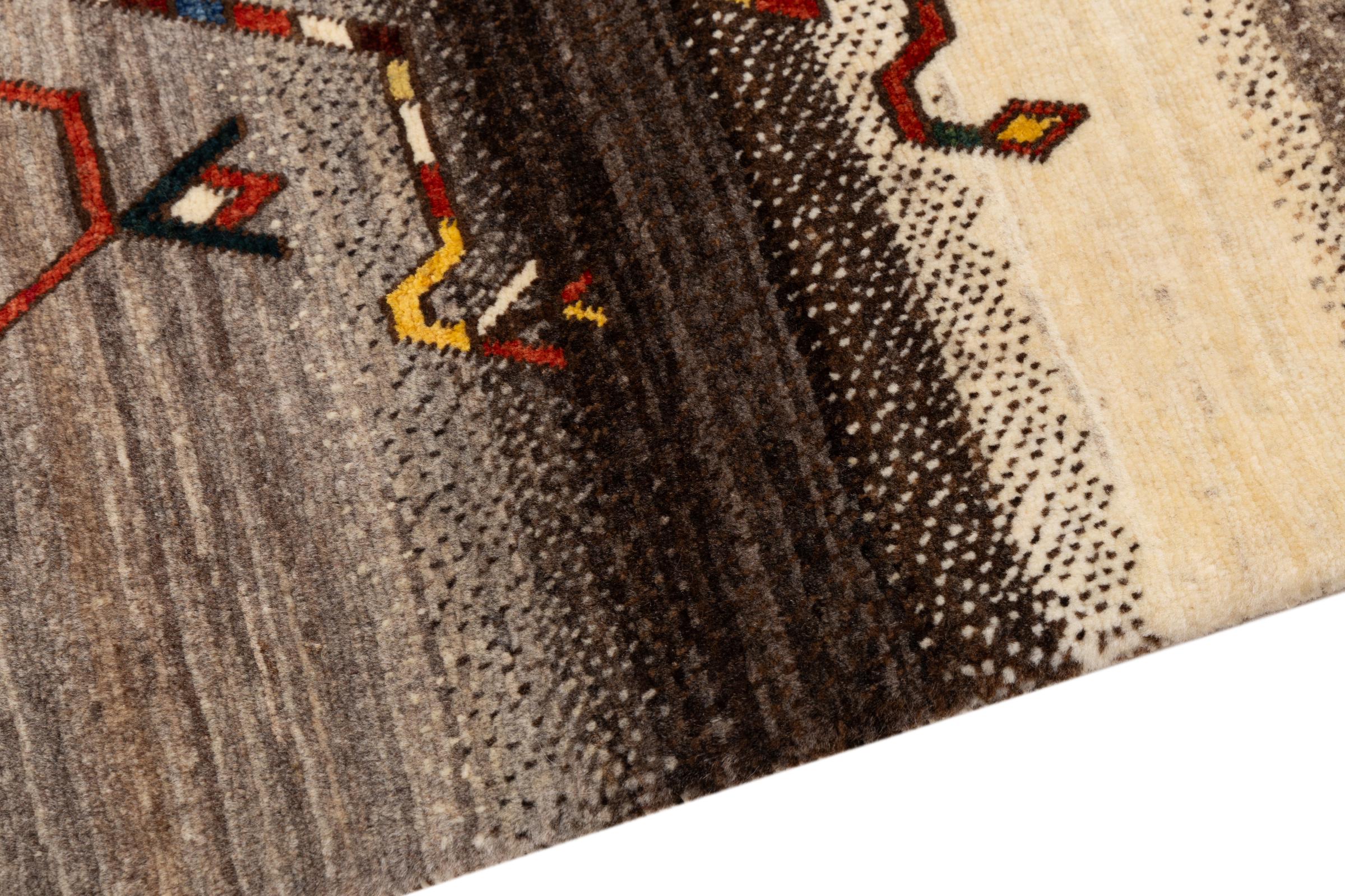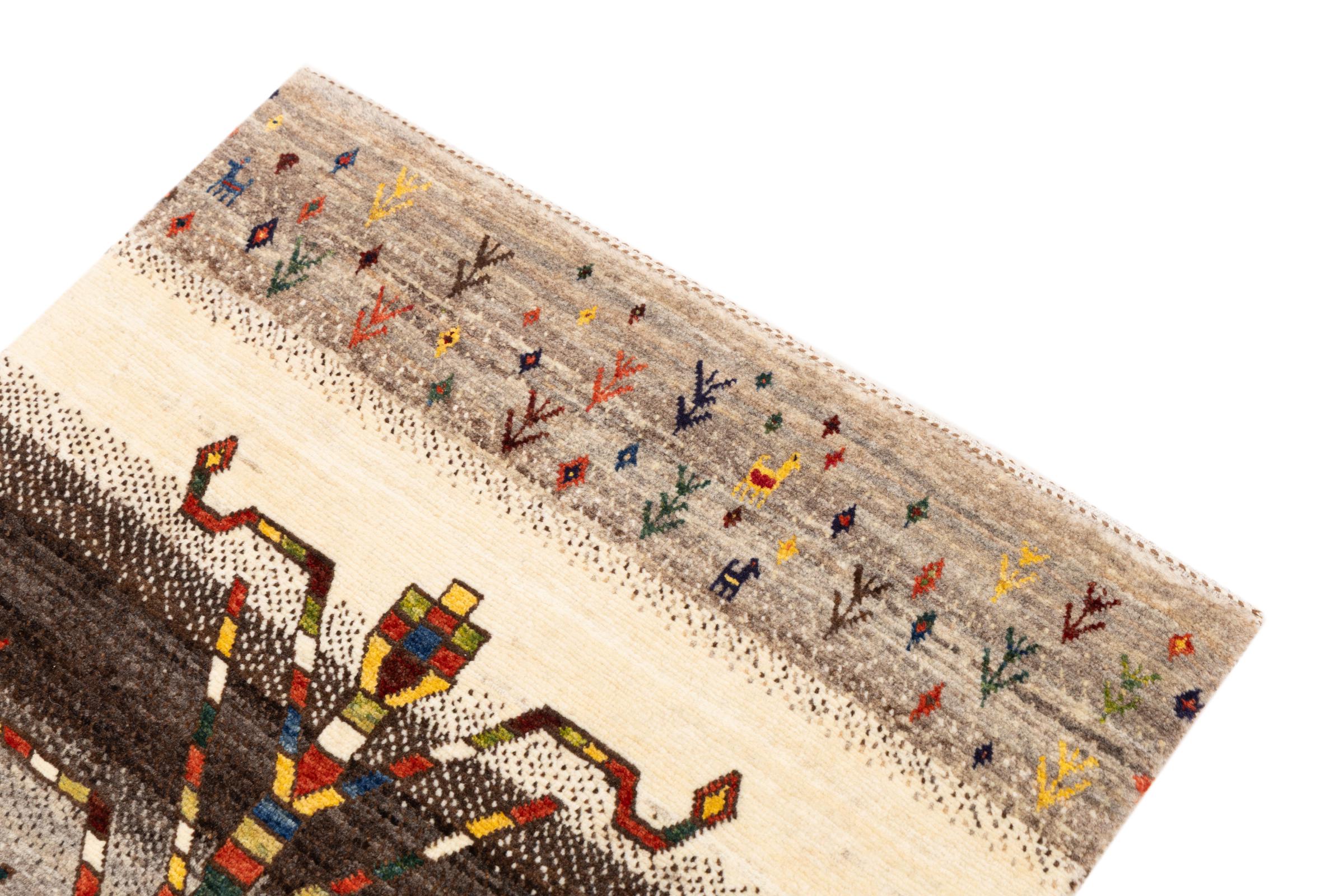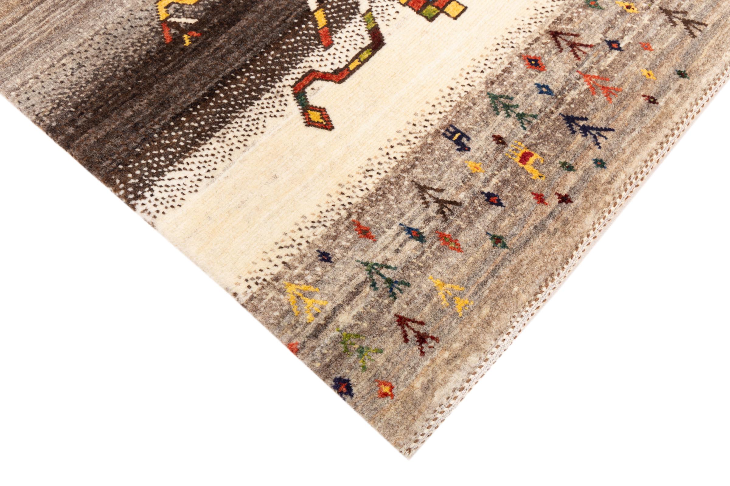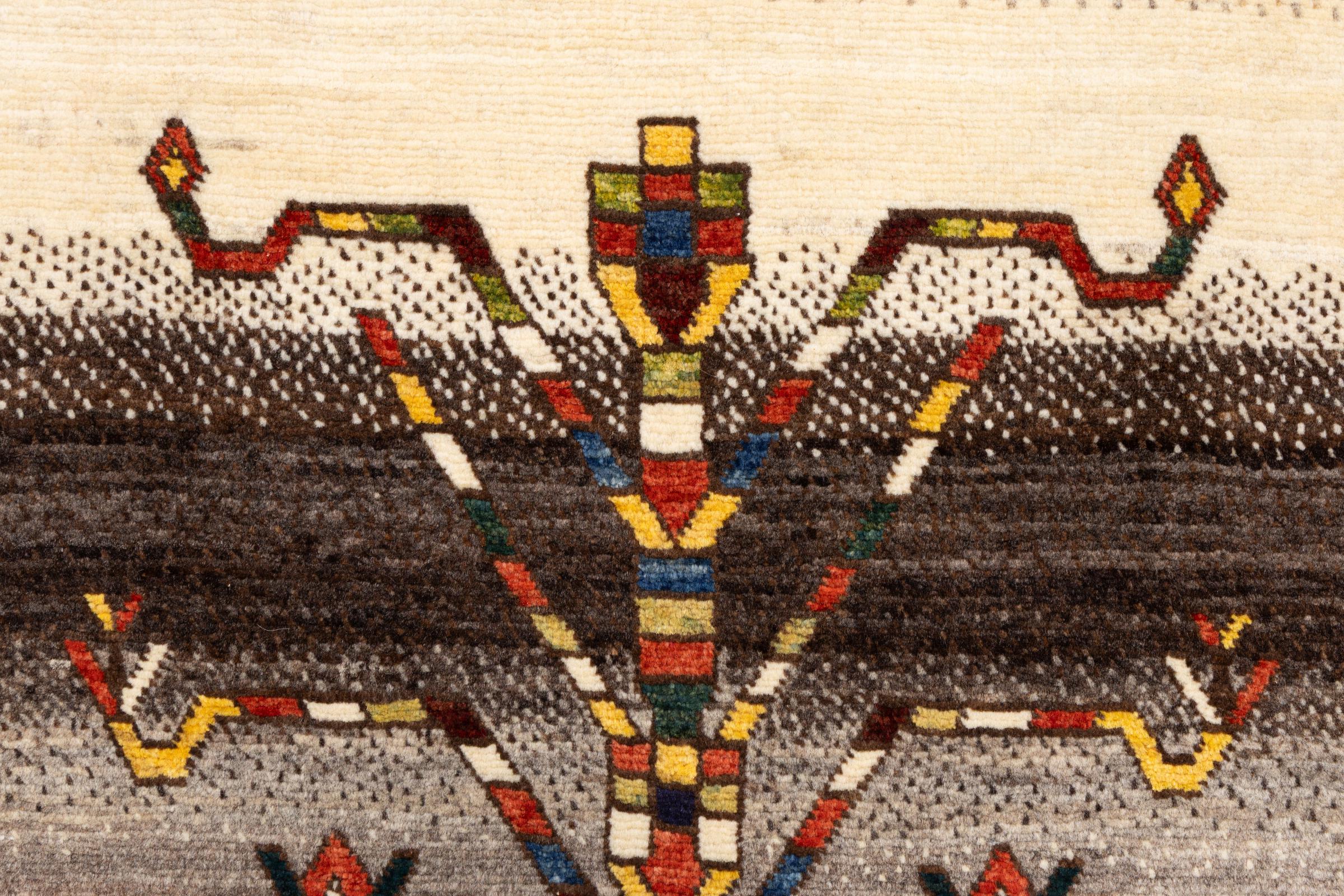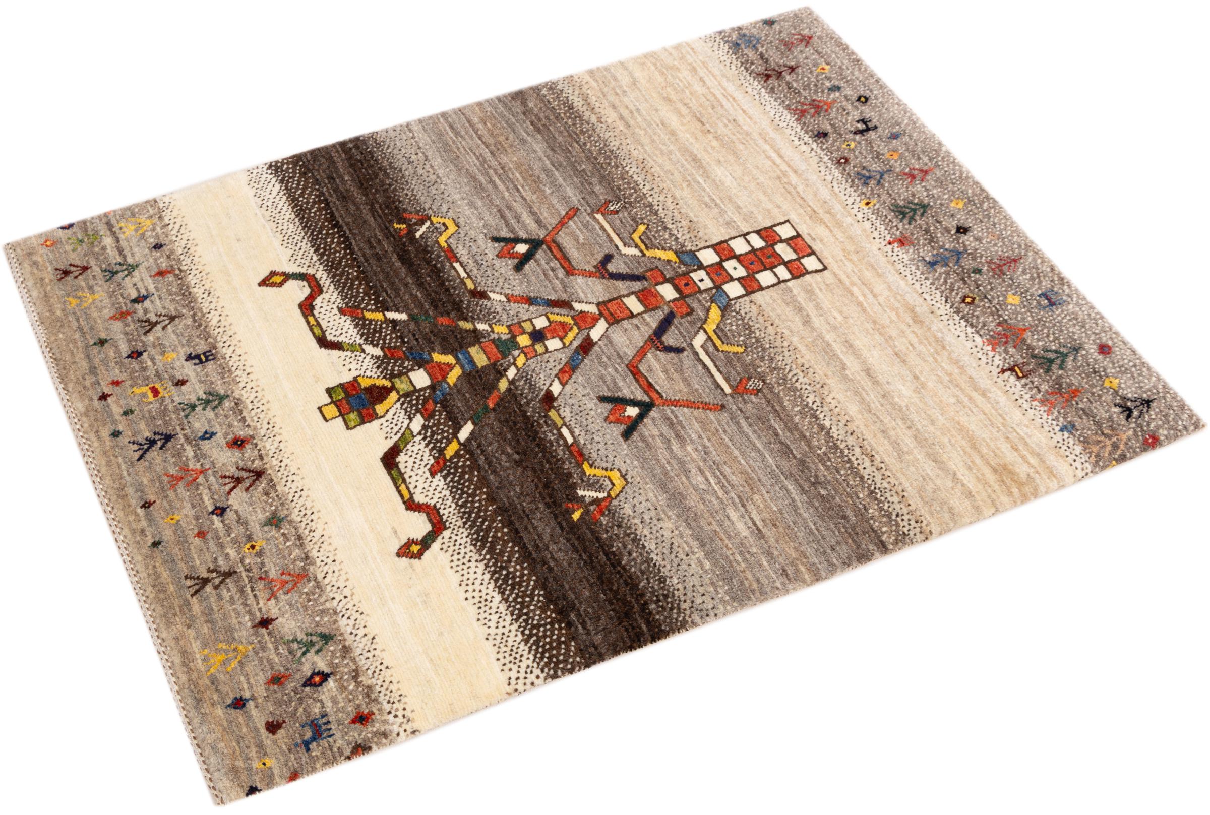 Este Gabbeh Kashkuli foi feito à mão por semi-nómadas no sudoeste do Irão. Graças à tradição persa, oferece uma excelente qualidade. Os motivos deste tipo são geralmente mantidos simples e não parecem demasiado sobrecarregados.