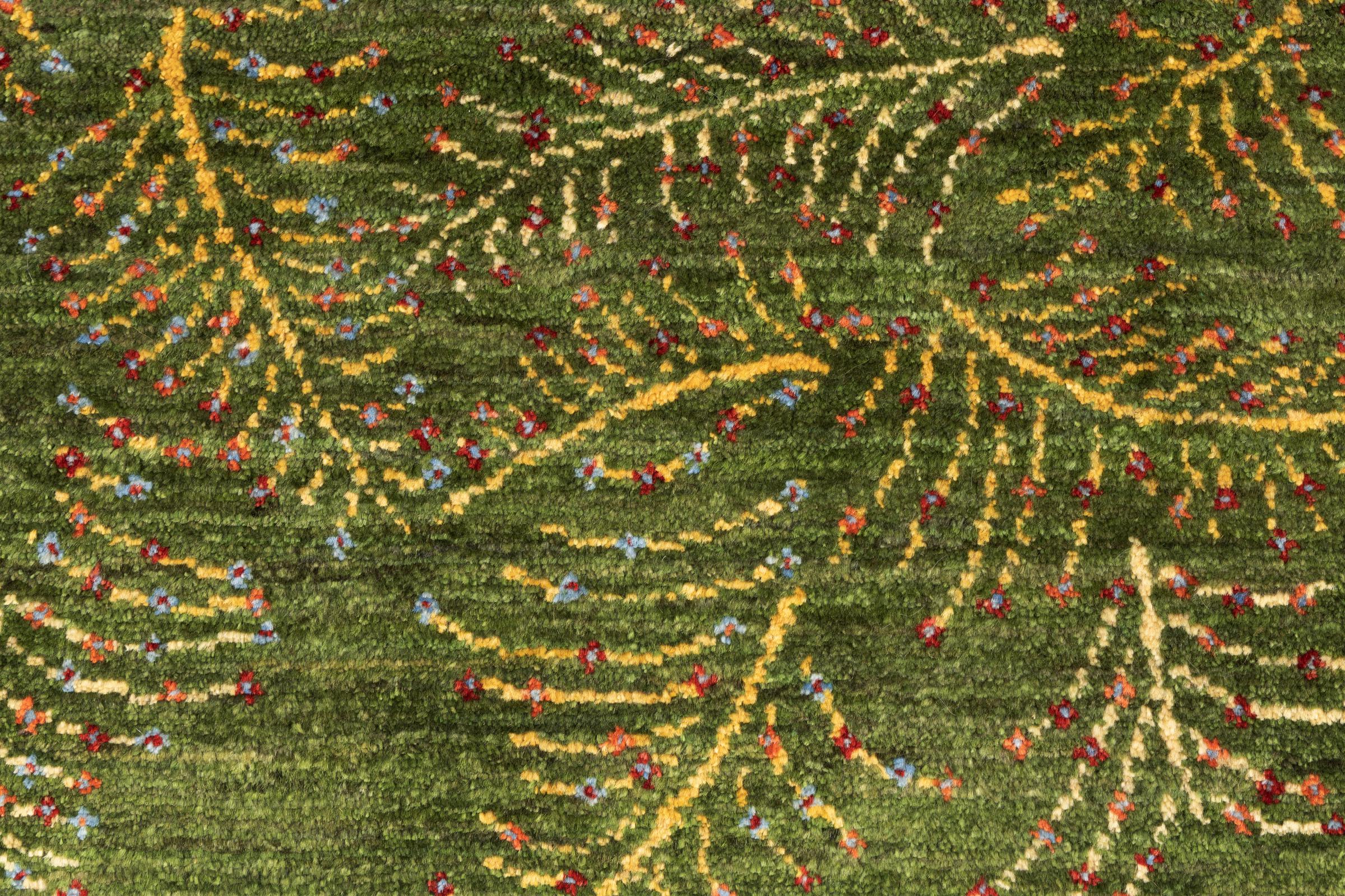 Este tapete é feito de lã de ovelha fiada à mão, da mais alta qualidade. Especialmente no Irão (antiga Pérsia), Afeganistão e Paquistão, a lã ainda é fiada à mão antes do início do nó do tapete. A lã tem provado ser um material natural e extremamente resistente ao longo dos séculos. Entre outras coisas, tem propriedades repelentes de impurezas e isolantes térmicos. Ao mesmo tempo, a lã é incomparavelmente macia e tem um brilho natural.