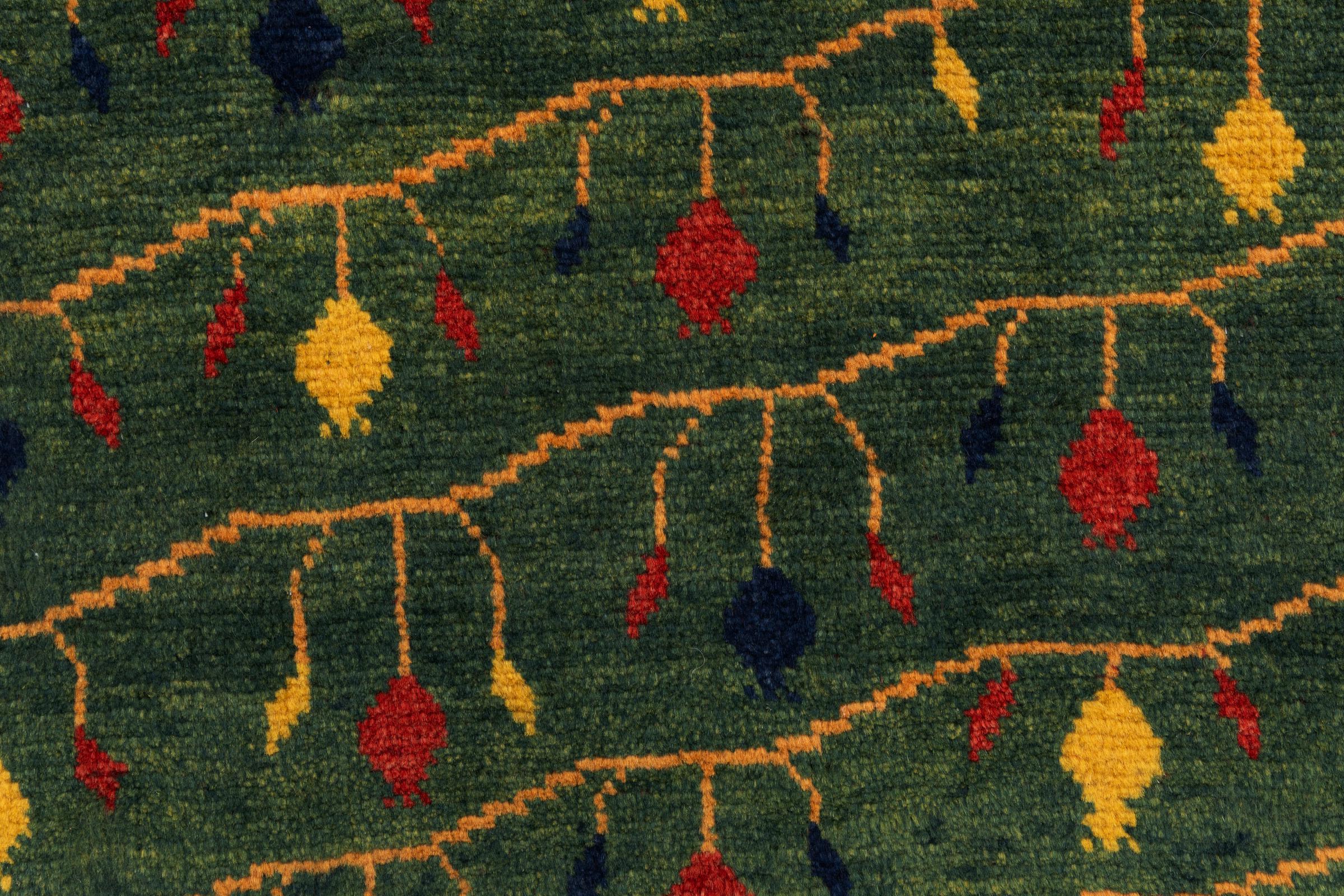 Este belo tapete é um Gabbeh persa e por isso pertence aos tapetes Gabbeh da mais alta qualidade. Os tapetes são atados por nómadas ou semi-nómadas no Irão, de acordo com o artesanato tradicional. Os simples motivos e padrões são, na sua maioria, inspirados pelo ambiente imediato dos nómadas. Por exemplo, camelos, árvores ou arbustos podem ser encontrados nos tapetes tradicionais. Os tapetes Gabbeh persa são feitos de lã proveniente de rebanhos de ovinos criados localmente. Por conseguinte, a lã ainda é, na sua maioria, fiada à mão. Assim, cada um destes tapetes orientais corporiza um carácter único de cultura secular.