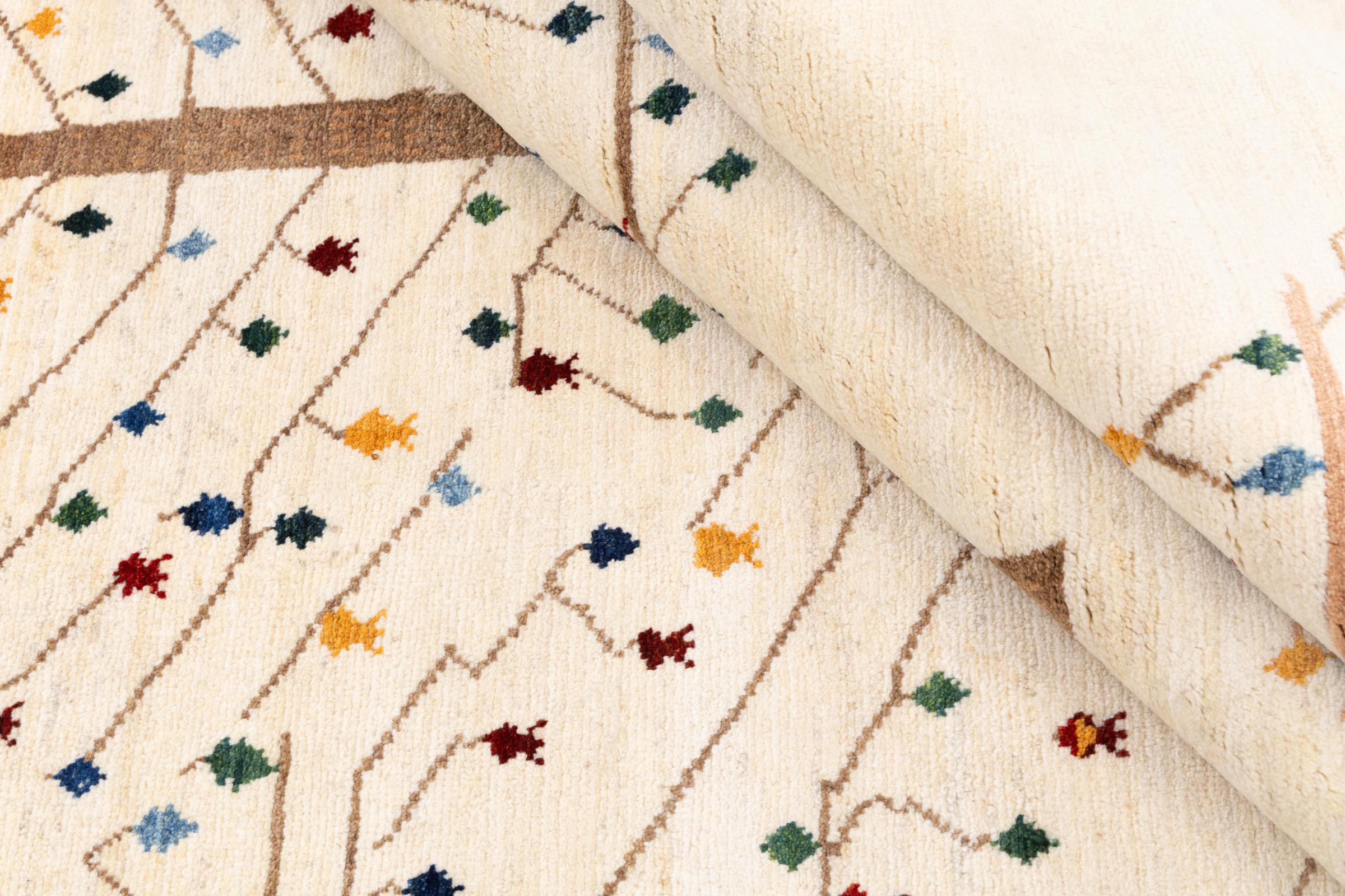Este belo tapete é um Gabbeh persa e por isso pertence aos tapetes Gabbeh da mais alta qualidade. Os tapetes são atados por nómadas ou semi-nómadas no Irão, de acordo com o artesanato tradicional. Os simples motivos e padrões são, na sua maioria, inspirados pelo ambiente imediato dos nómadas. Por exemplo, camelos, árvores ou arbustos podem ser encontrados nos tapetes tradicionais. Os tapetes Gabbeh persa são feitos de lã proveniente de rebanhos de ovinos criados localmente. Por conseguinte, a lã ainda é, na sua maioria, fiada à mão. Assim, cada um destes tapetes orientais corporiza um carácter único de cultura secular.