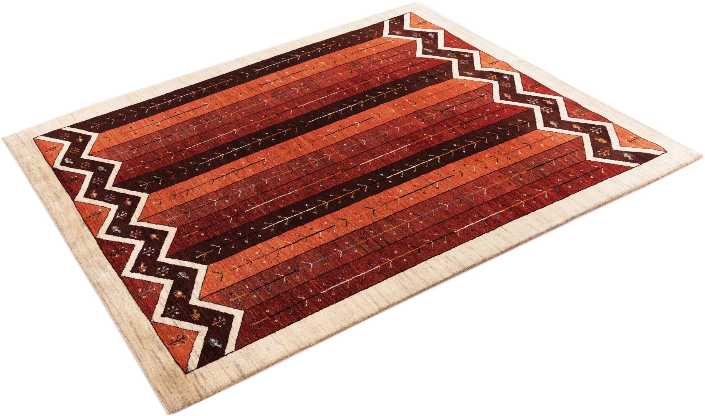 Este belo tapete é um Gabbeh persa e por isso pertence aos tapetes Gabbeh da mais alta qualidade. Os tapetes são atados por nómadas ou semi-nómadas no Irão, de acordo com o artesanato tradicional. Os simples motivos e padrões são, na sua maioria, inspirados pelo ambiente imediato dos nómadas. Por exemplo, camelos, árvores ou arbustos podem ser encontrados nos tapetes tradicionais. Os tapetes Gabbeh persa são feitos de lã proveniente de rebanhos de ovinos criados localmente. Por conseguinte, a lã ainda é, na sua maioria, fiada à mão. Assim, cada um destes tapetes orientais corporiza um carácter único de cultura secular.