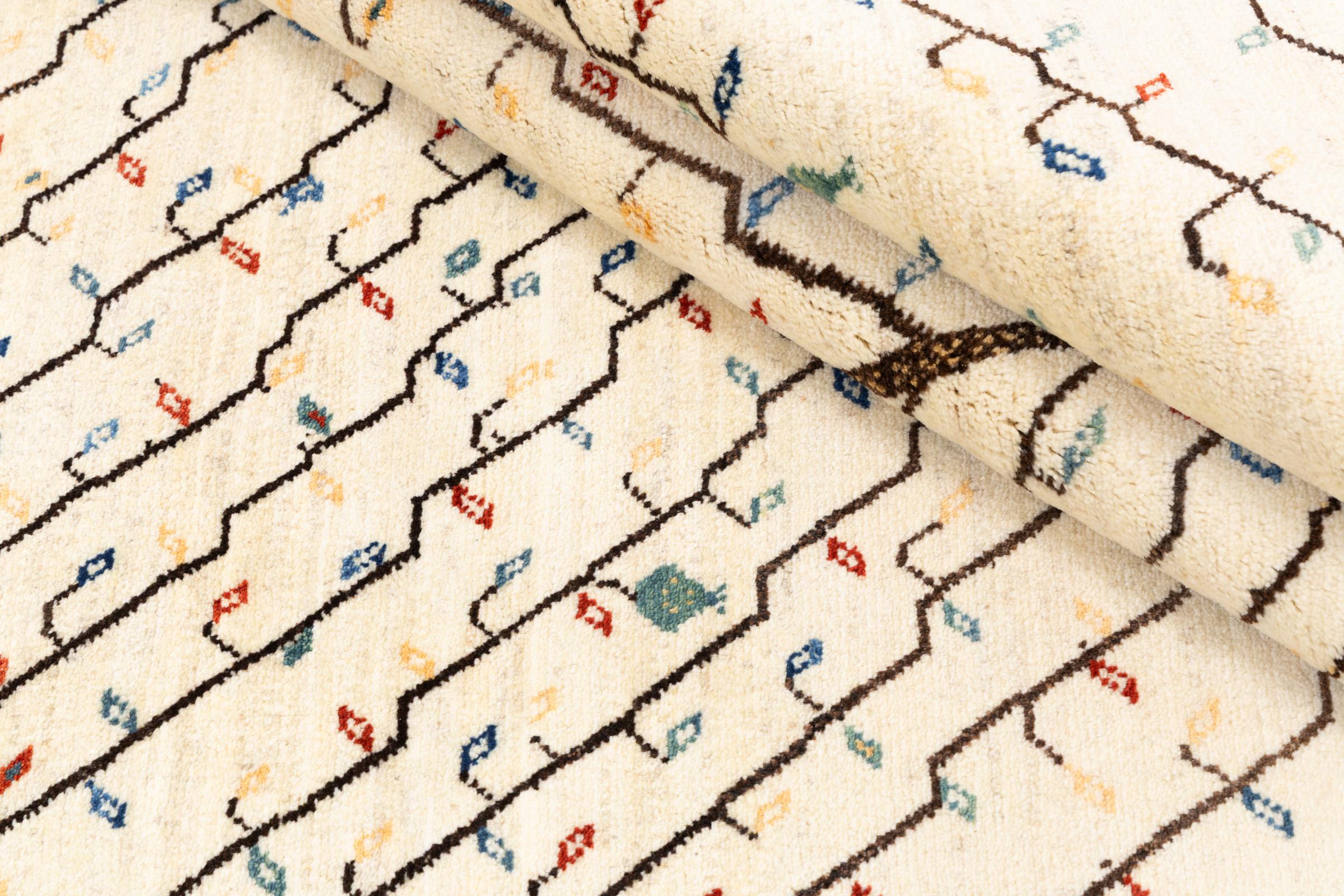 Este belo tapete é um Gabbeh persa e por isso pertence aos tapetes Gabbeh da mais alta qualidade. Os tapetes são atados por nómadas ou semi-nómadas no Irão, de acordo com o artesanato tradicional. Os simples motivos e padrões são, na sua maioria, inspirados pelo ambiente imediato dos nómadas. Por exemplo, camelos, árvores ou arbustos podem ser encontrados nos tapetes tradicionais. Os tapetes Gabbeh persa são feitos de lã proveniente de rebanhos de ovinos criados localmente. Por conseguinte, a lã ainda é, na sua maioria, fiada à mão. Assim, cada um destes tapetes orientais corporiza um carácter único de cultura secular.