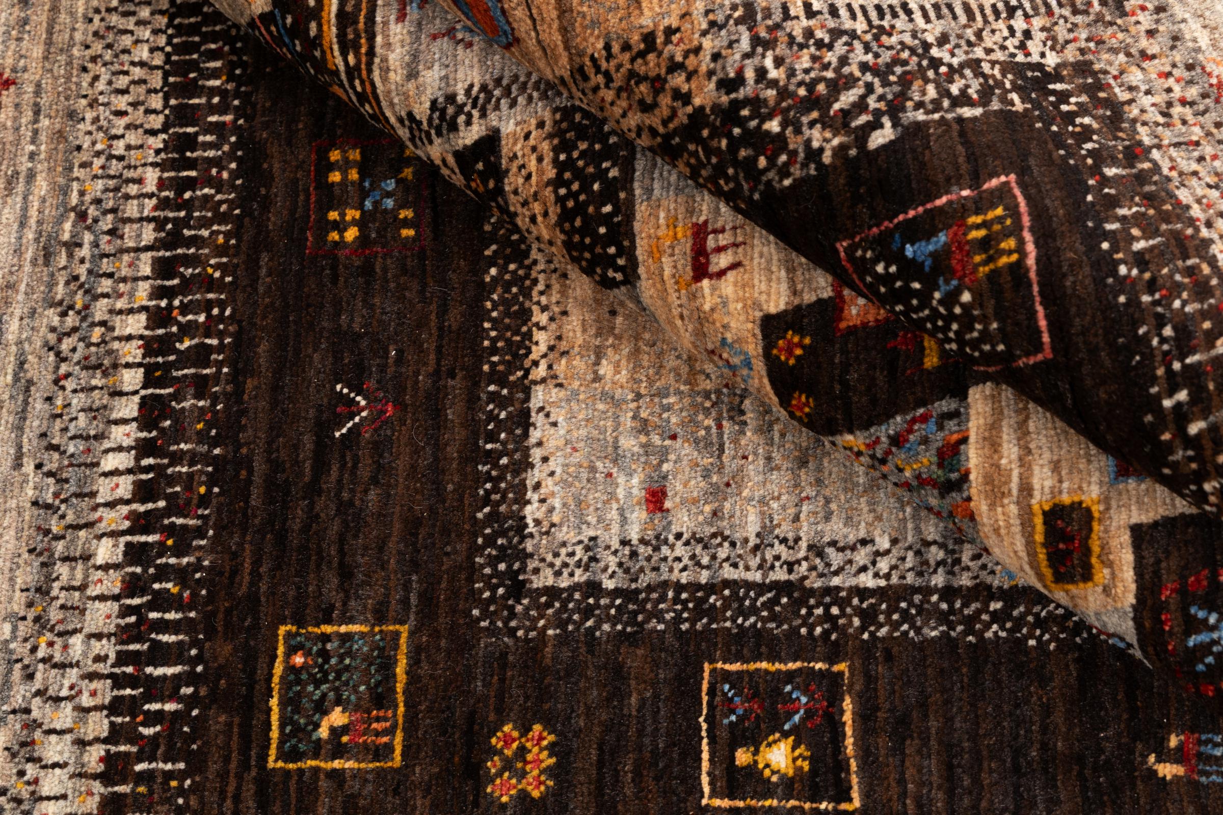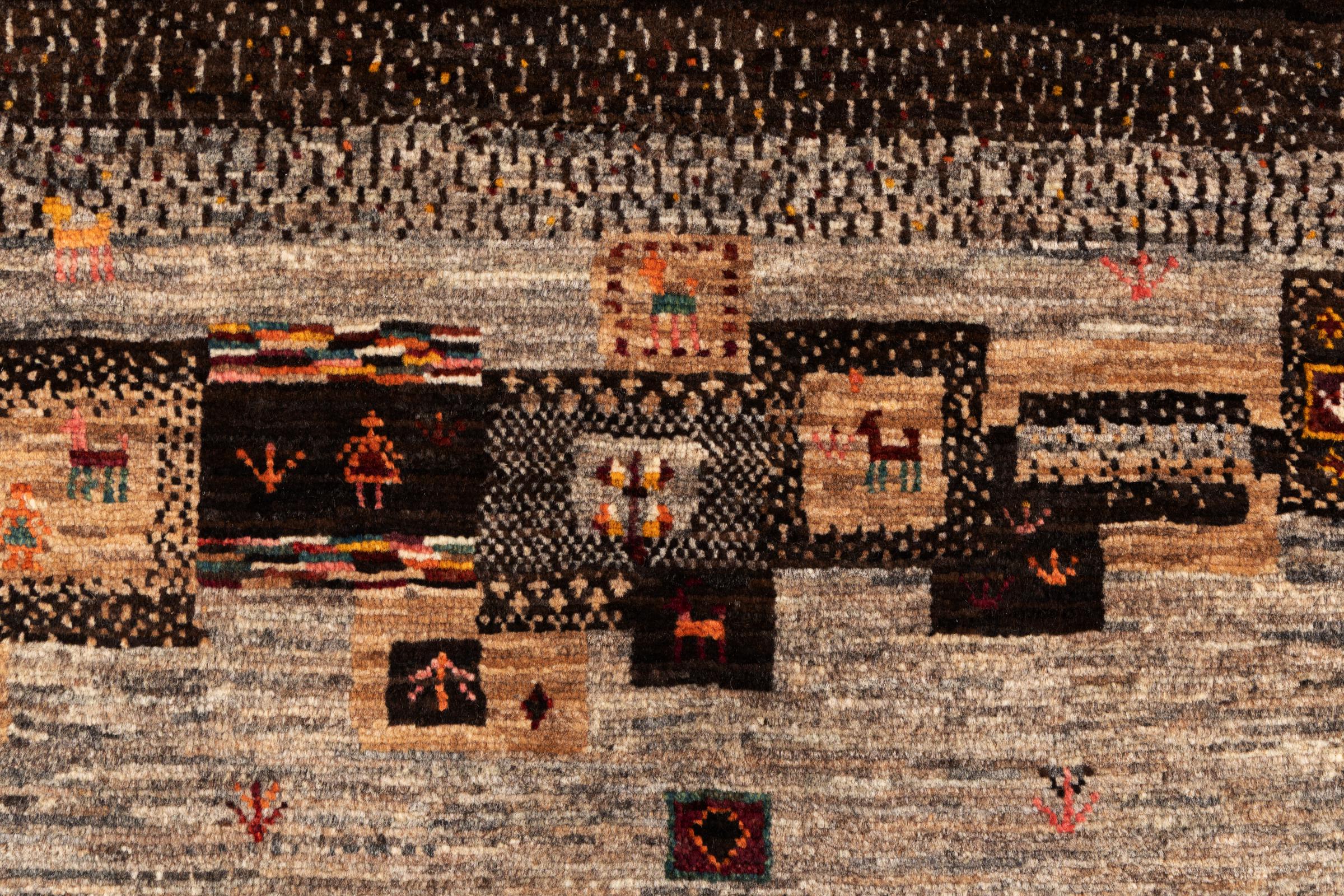 Este belo tapete é um Gabbeh persa e por isso pertence aos tapetes Gabbeh da mais alta qualidade. Os tapetes são atados por nómadas ou semi-nómadas no Irão, de acordo com o artesanato tradicional. Os simples motivos e padrões são, na sua maioria, inspirados pelo ambiente imediato dos nómadas. Por exemplo, camelos, árvores ou arbustos podem ser encontrados nos tapetes tradicionais. Os tapetes Gabbeh persa são feitos de lã proveniente de rebanhos de ovinos criados localmente. Por conseguinte, a lã ainda é, na sua maioria, fiada à mão. Assim, cada um destes tapetes orientais corporiza um carácter único de cultura secular.