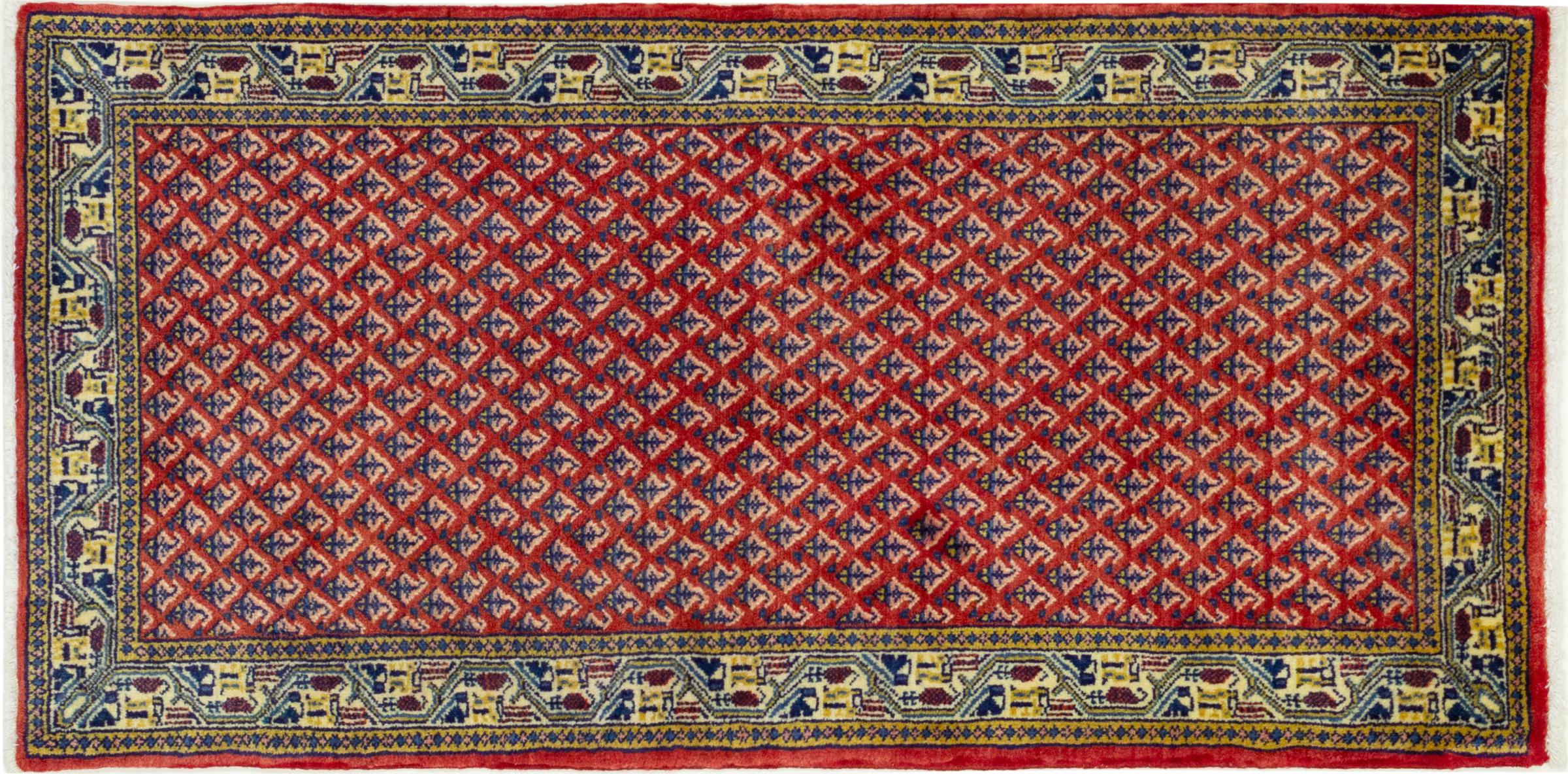 Este tapete Sarough Mir tem um padrão muito típico, também designado por desenho "all-over". É claro e evita deliberadamente ornamentos curvos. Desta forma, o tapete pode acalmar uma divisão e, ao mesmo tempo, dar-lhe um toque de cor viva.