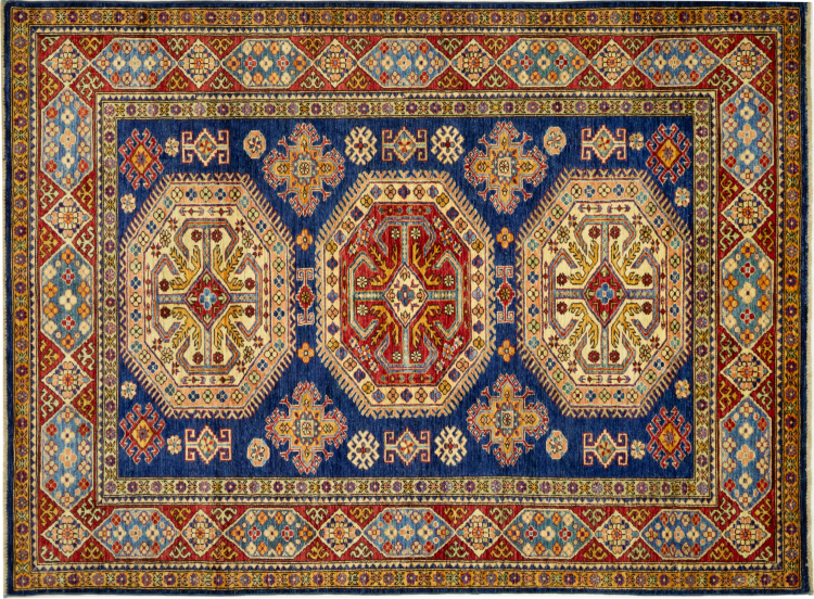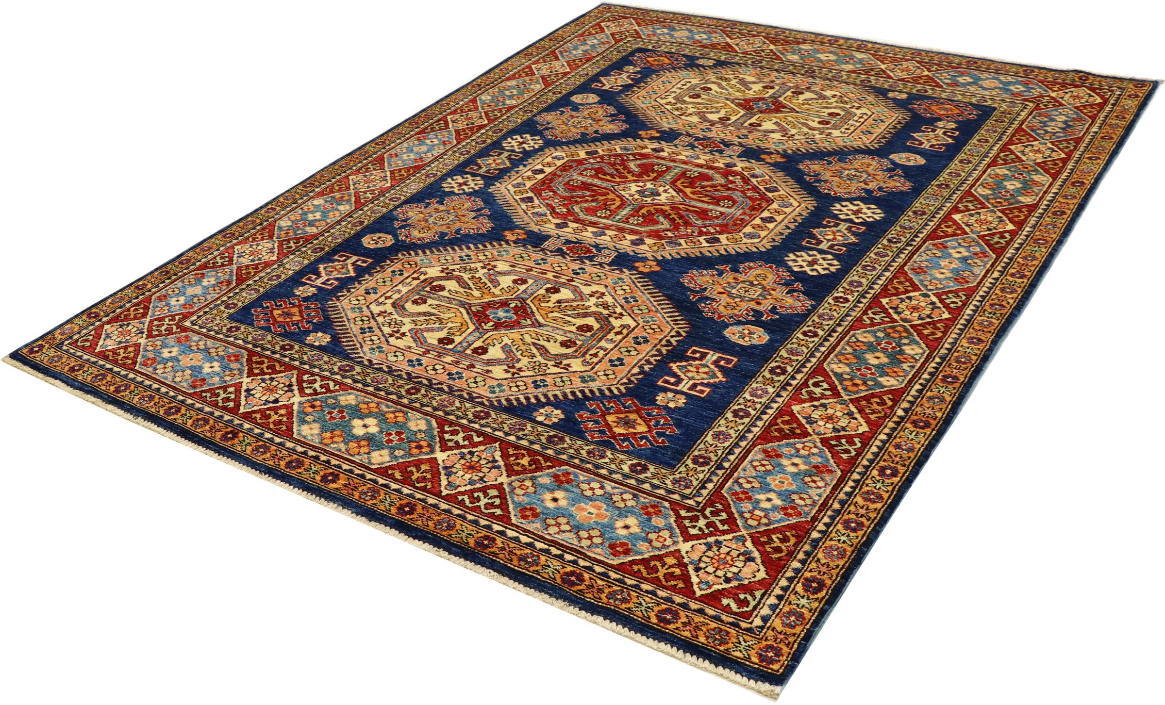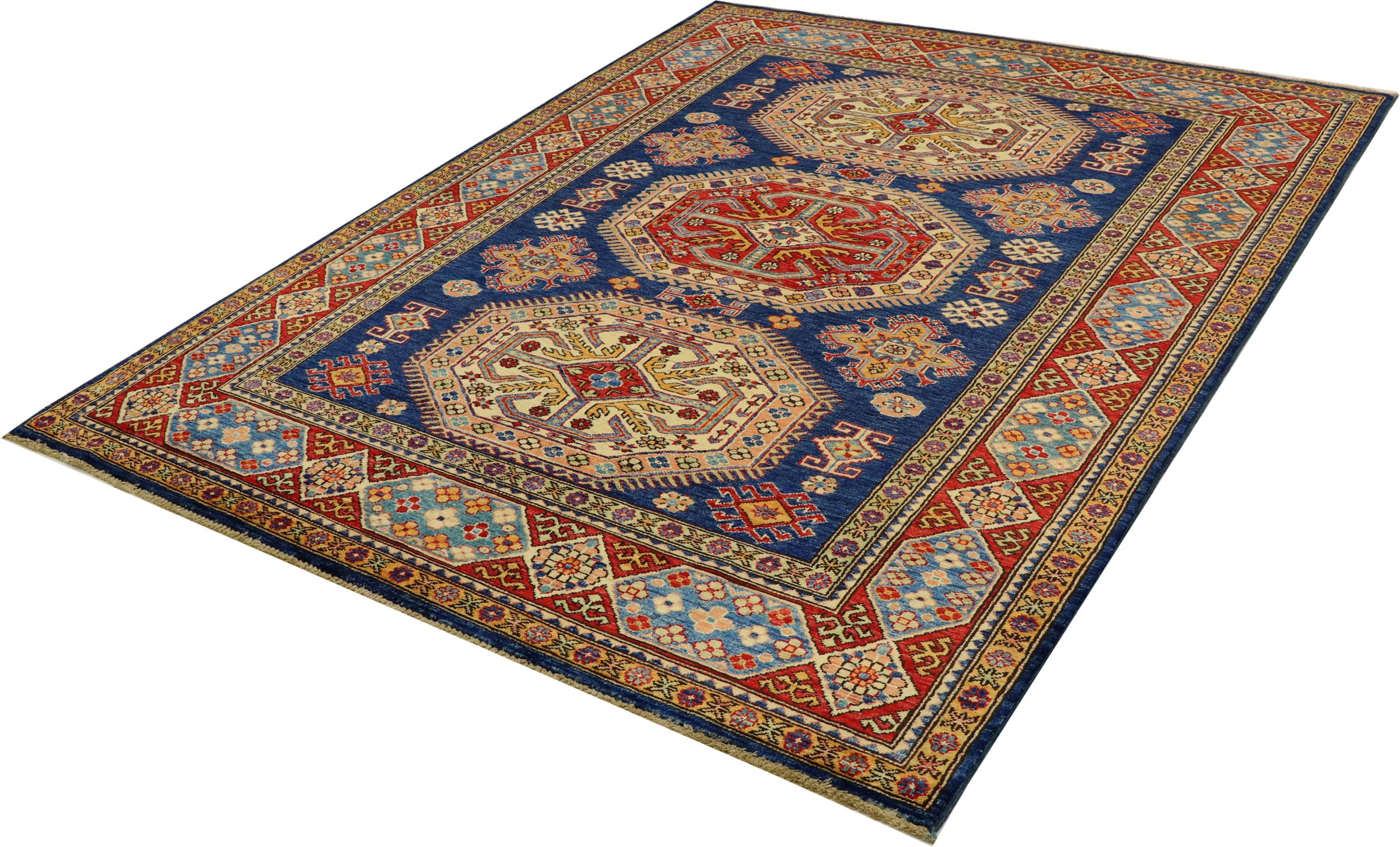 Os tapetes Kazak são originalmente tapetes caucasianos e são considerados os melhores de sua espécie. Eles são feitos à mão com lã de alta qualidade e são caracterizados por seu design com cores naturais quentes e formas geométricas retas.