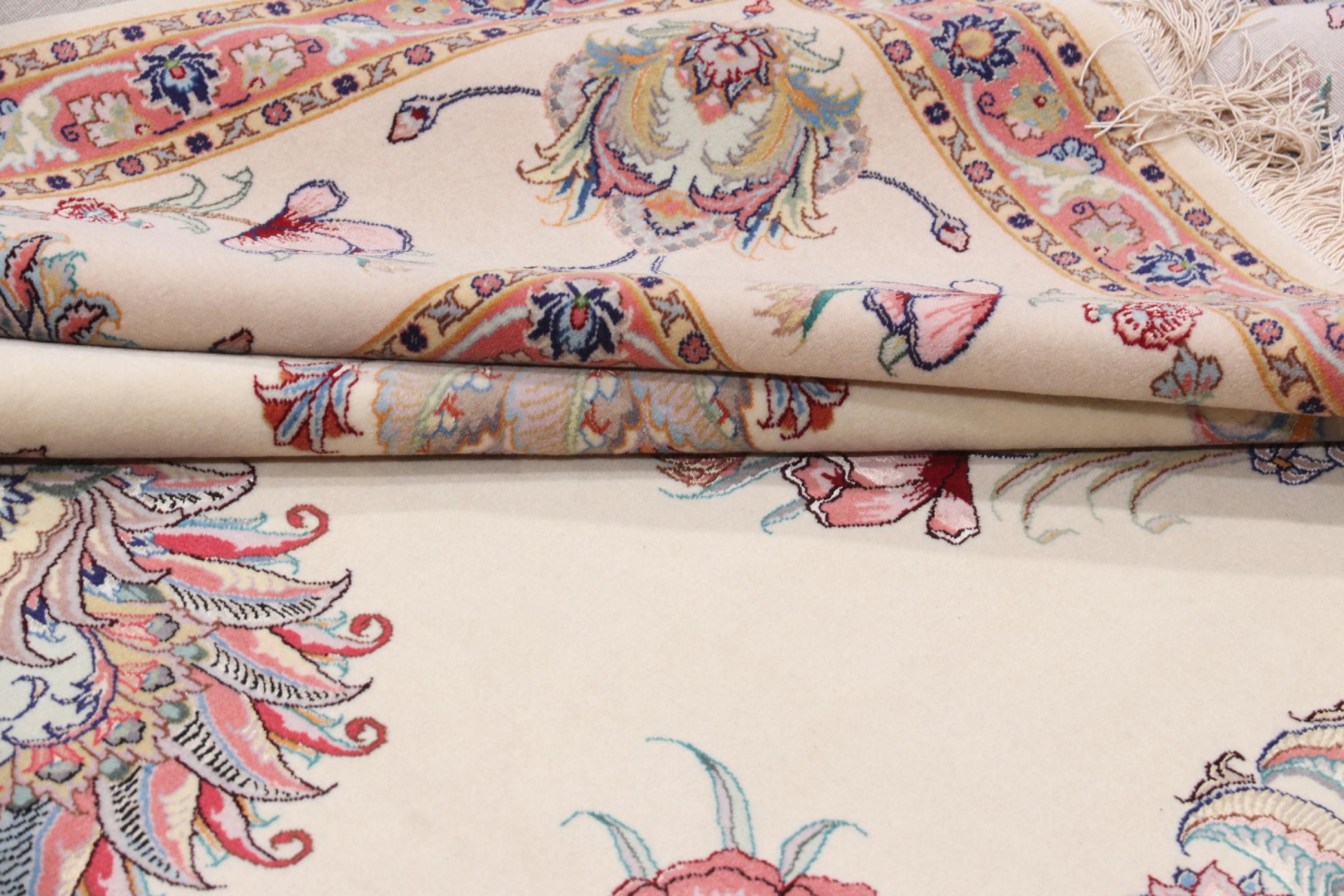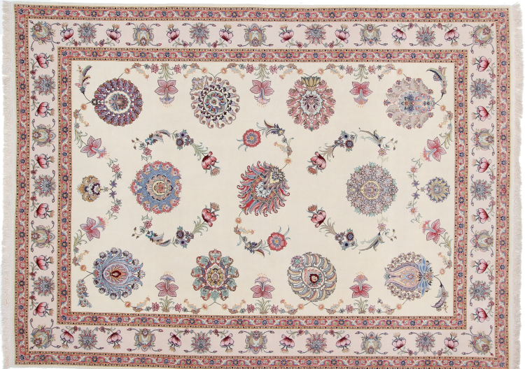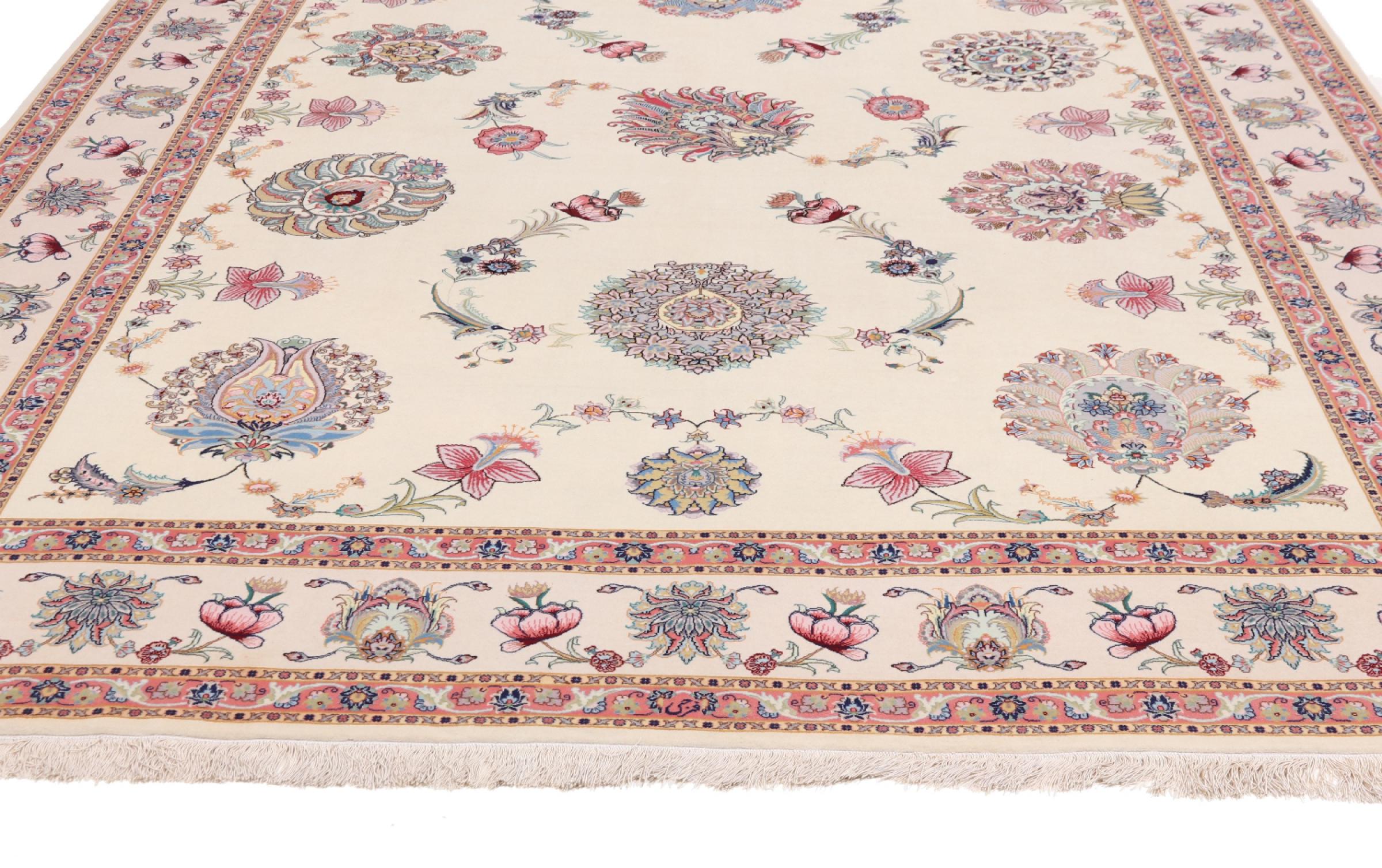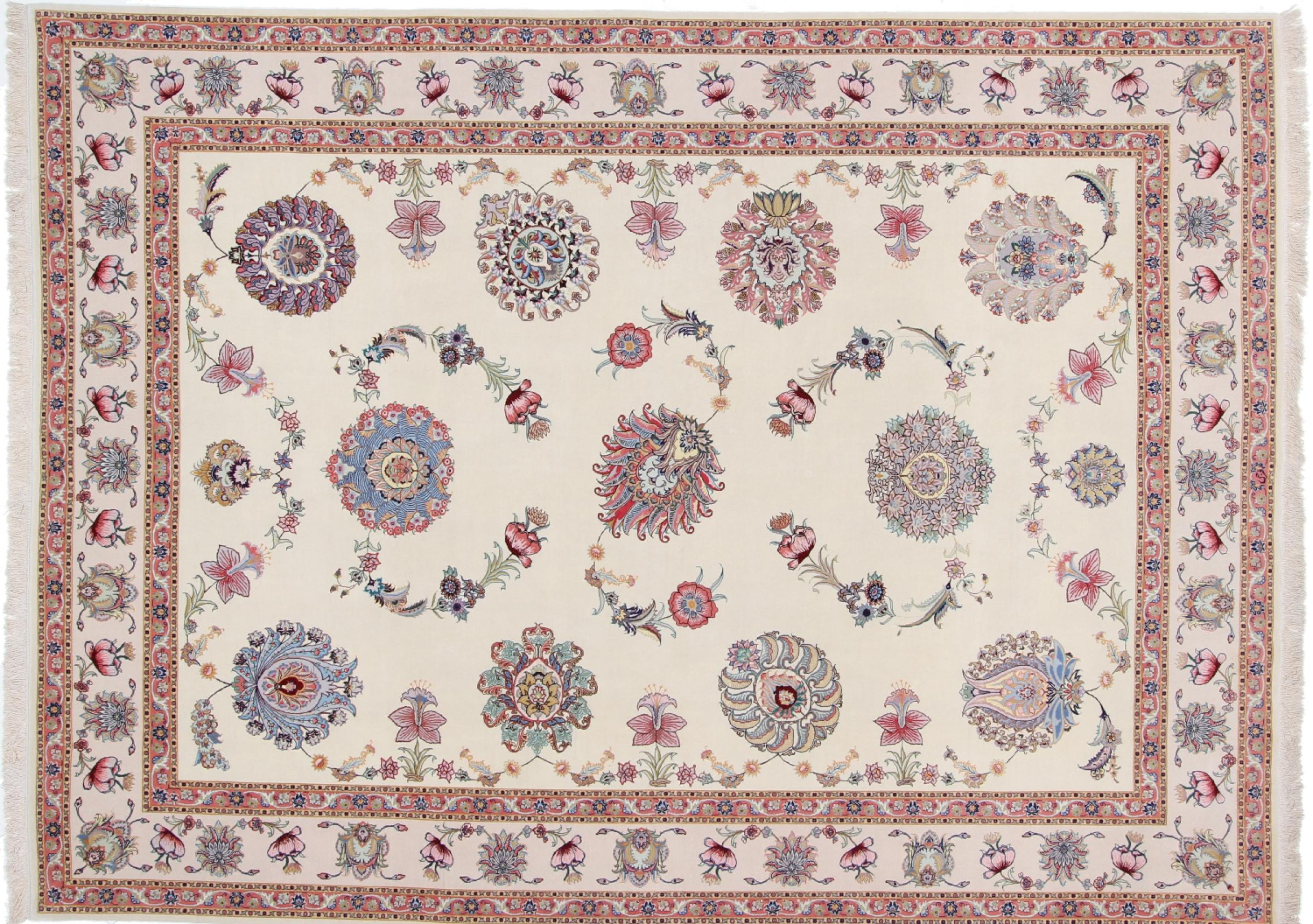 Nº do Tapete: 202140037144 Tamanho: 338x250 cm Espessura: aproximadamente 7 mm Nós: 450 000 - 500 000 / m² Processamento: Atado à mão Veludo: Lã com seda Urdidura: Algodão Origem: Pérsia / Iran Idade: Novo Peso: aproximadamente 25 kg Também conhecido como Tabriz, Tabris, Täbris, Tebriz, Tebris, 40Raj, 50Raj Em armazém: Único - Apenas 1 em stock