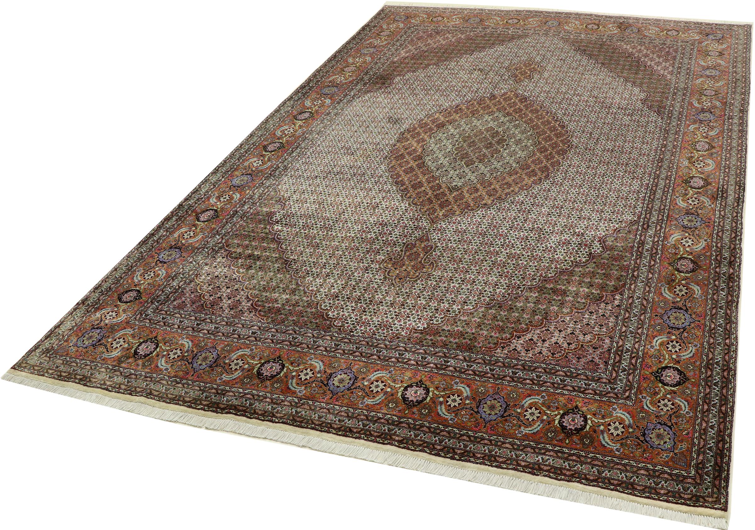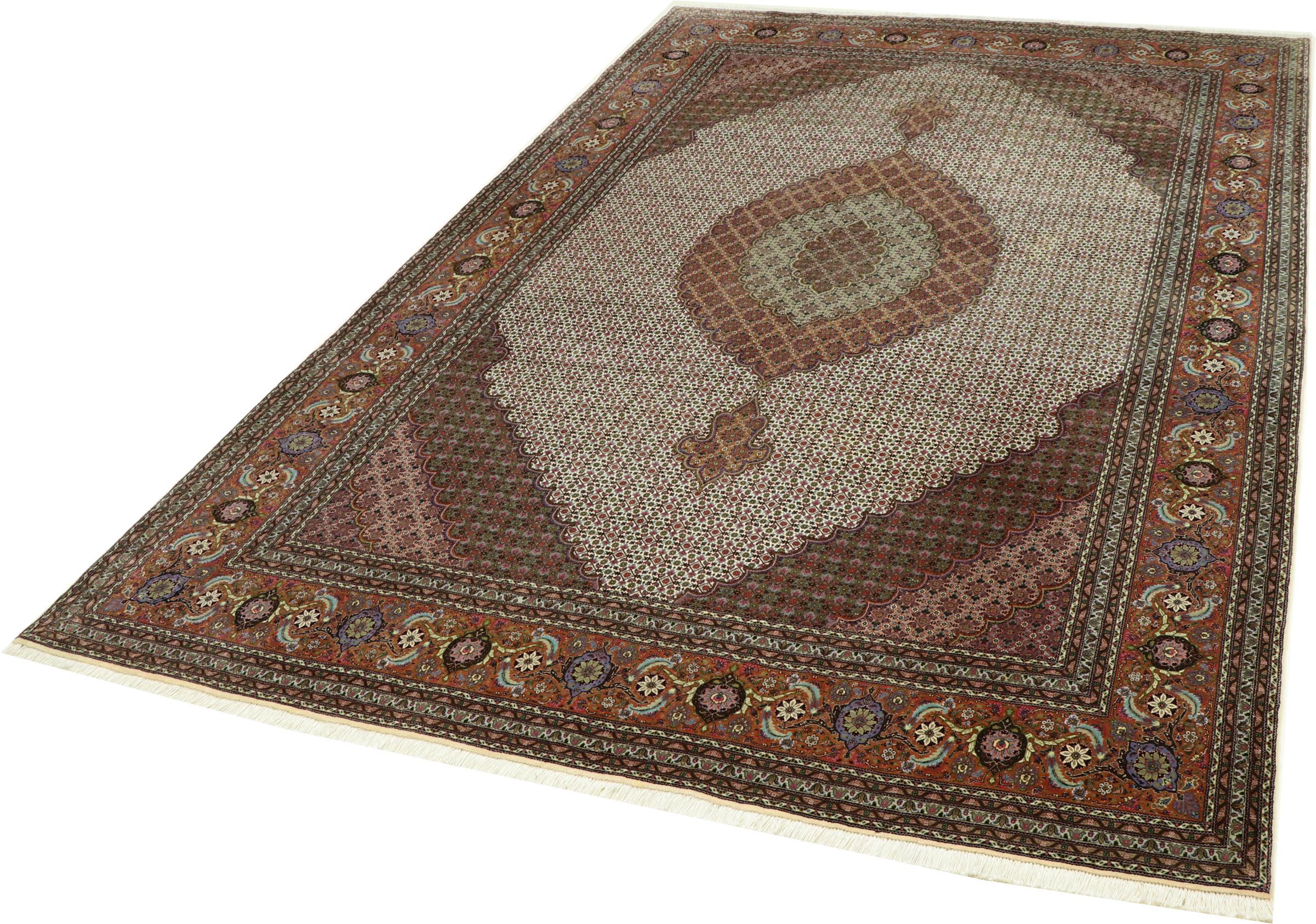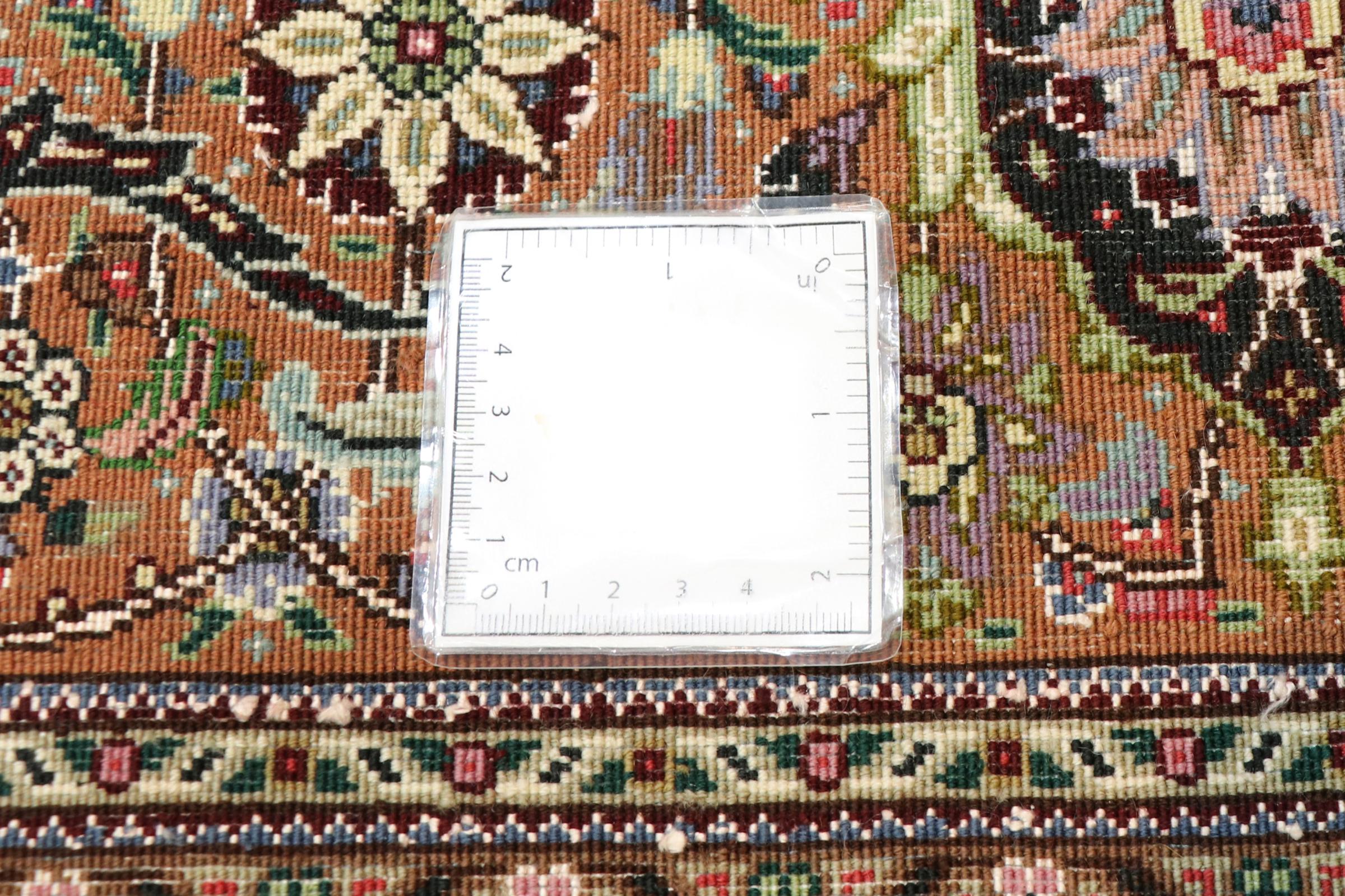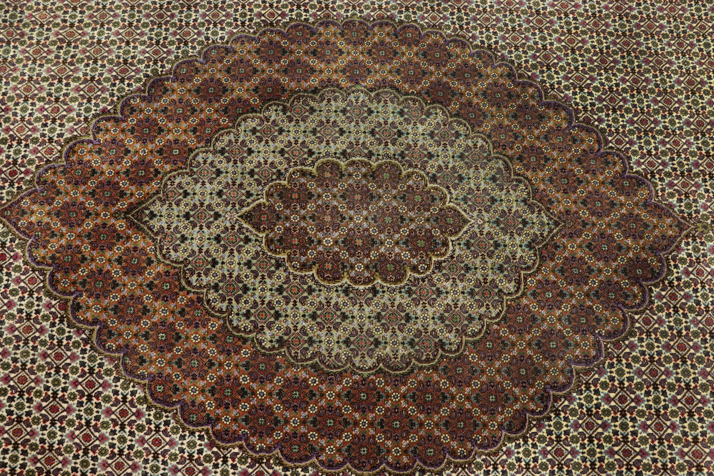 Este tapete de Tabriz apresenta-se em trajes tradicionais. O padrão Herati ou Mahi é um dos desenhos mais clássicos de todos. Se você gosta de design tradicional, nunca mais vai querer perder este tapete.