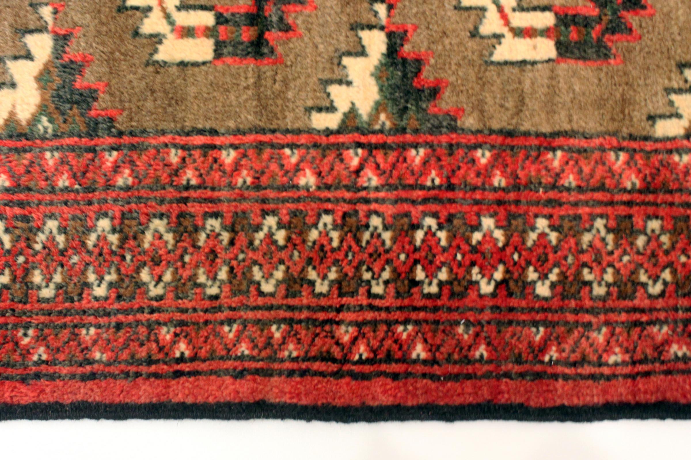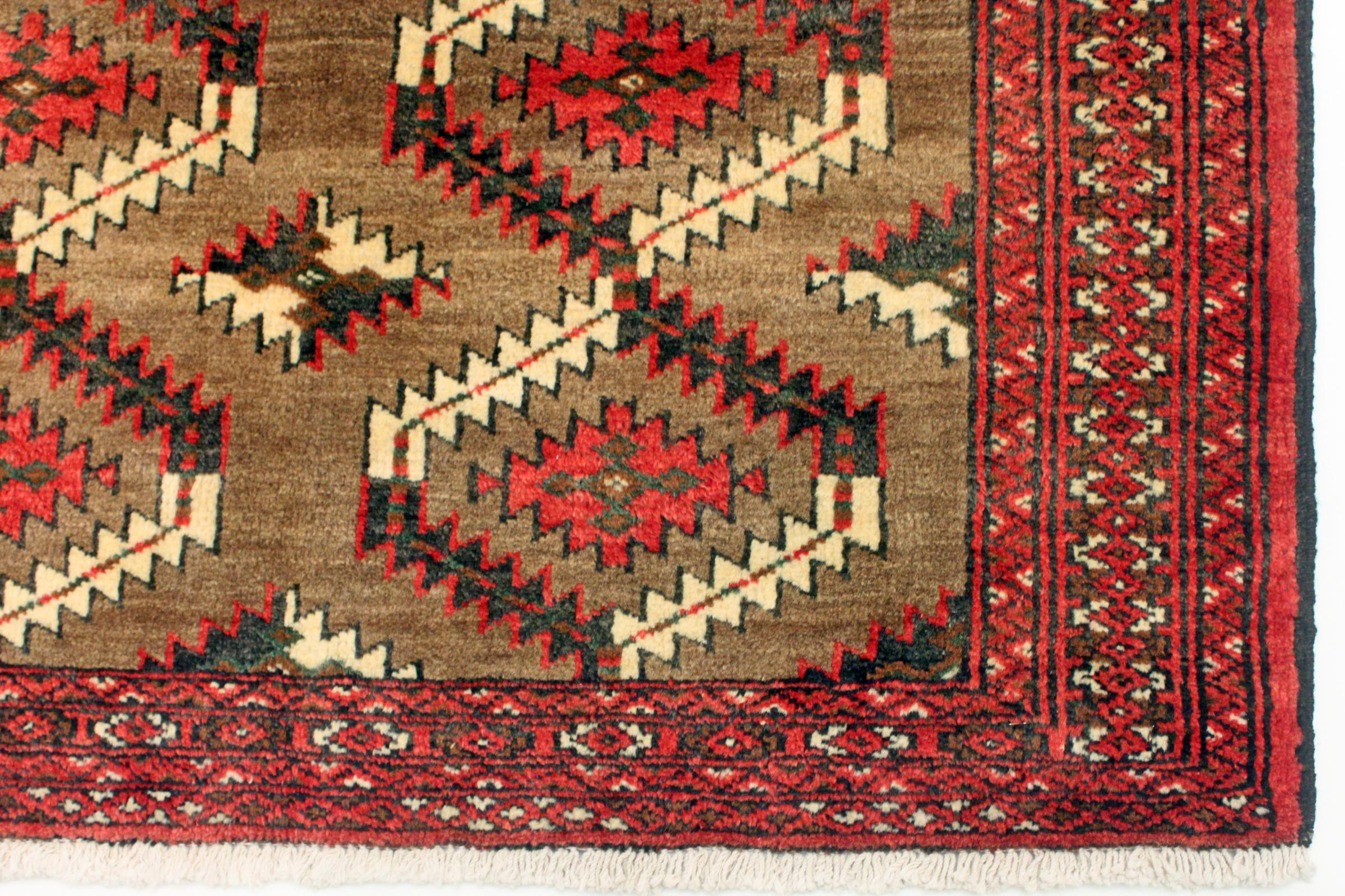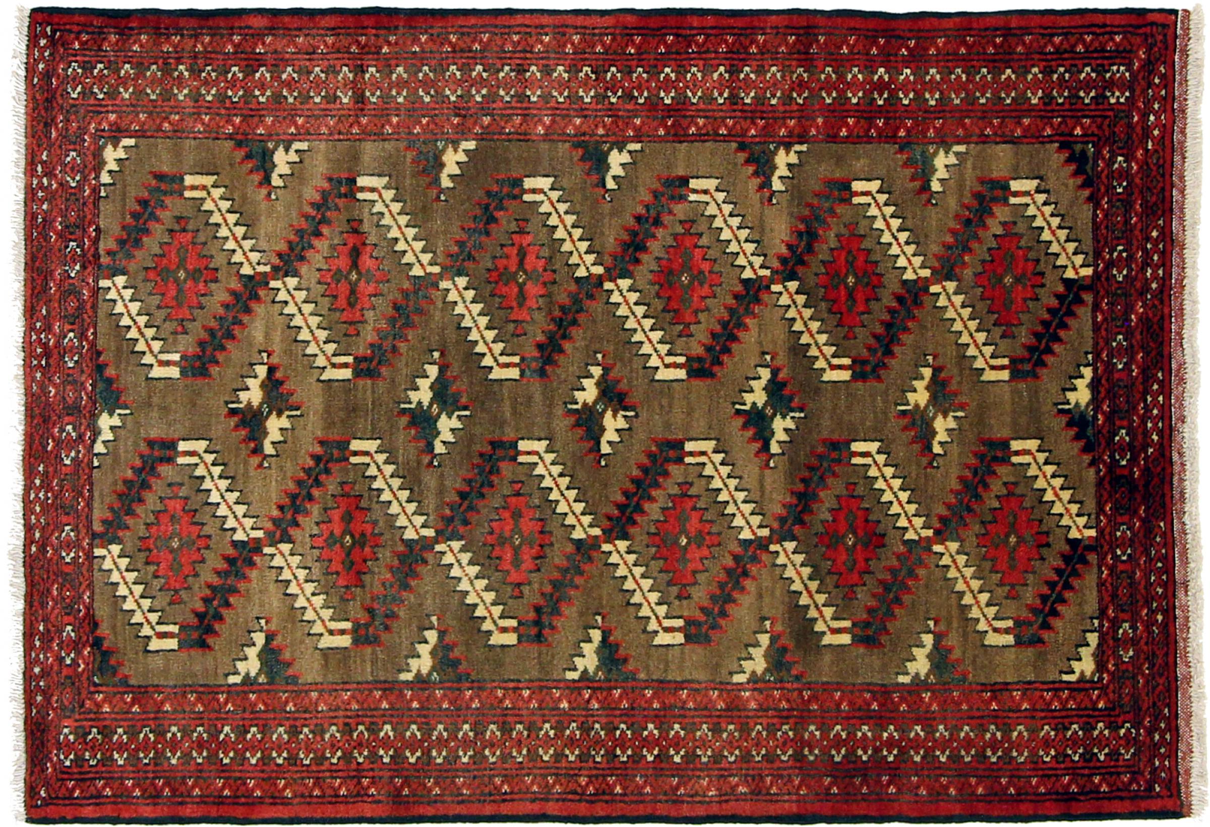 Este tapete turcomano foi tradicionalmente atado à mão e impressiona pelo seu elevado nível de fabrico e pela lã de ovelha de alta qualidade com um elevado teor de gordura. As suas cores quentes e escuras reflectem a cultura dos turcomanos e dão um toque oriental e acolhedor ao seu ambiente de vida. Os tapetes paquistaneses assemelham-se frequentemente a este tipo de tapete, mas muitas vezes não se aproximam da sua qualidade.