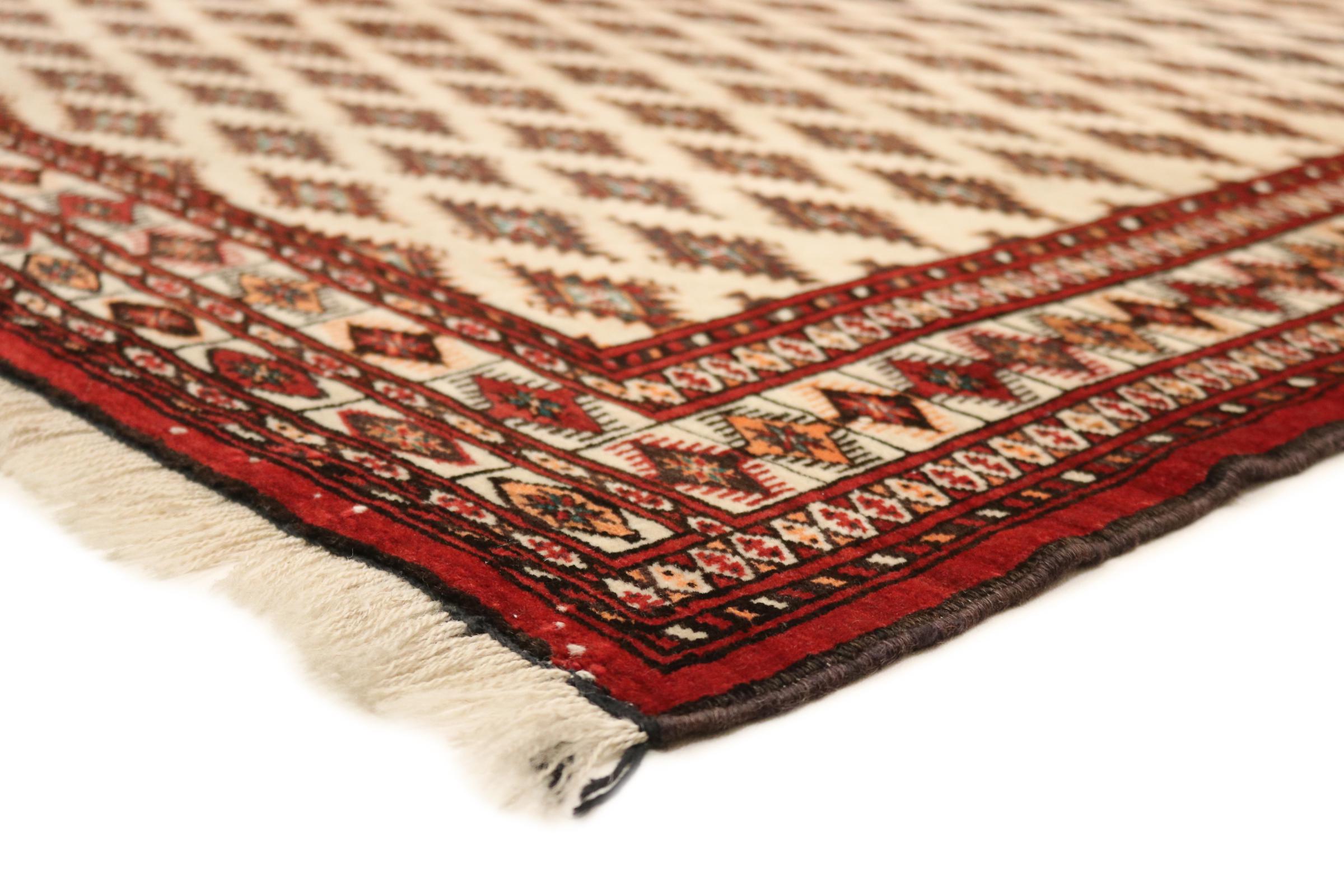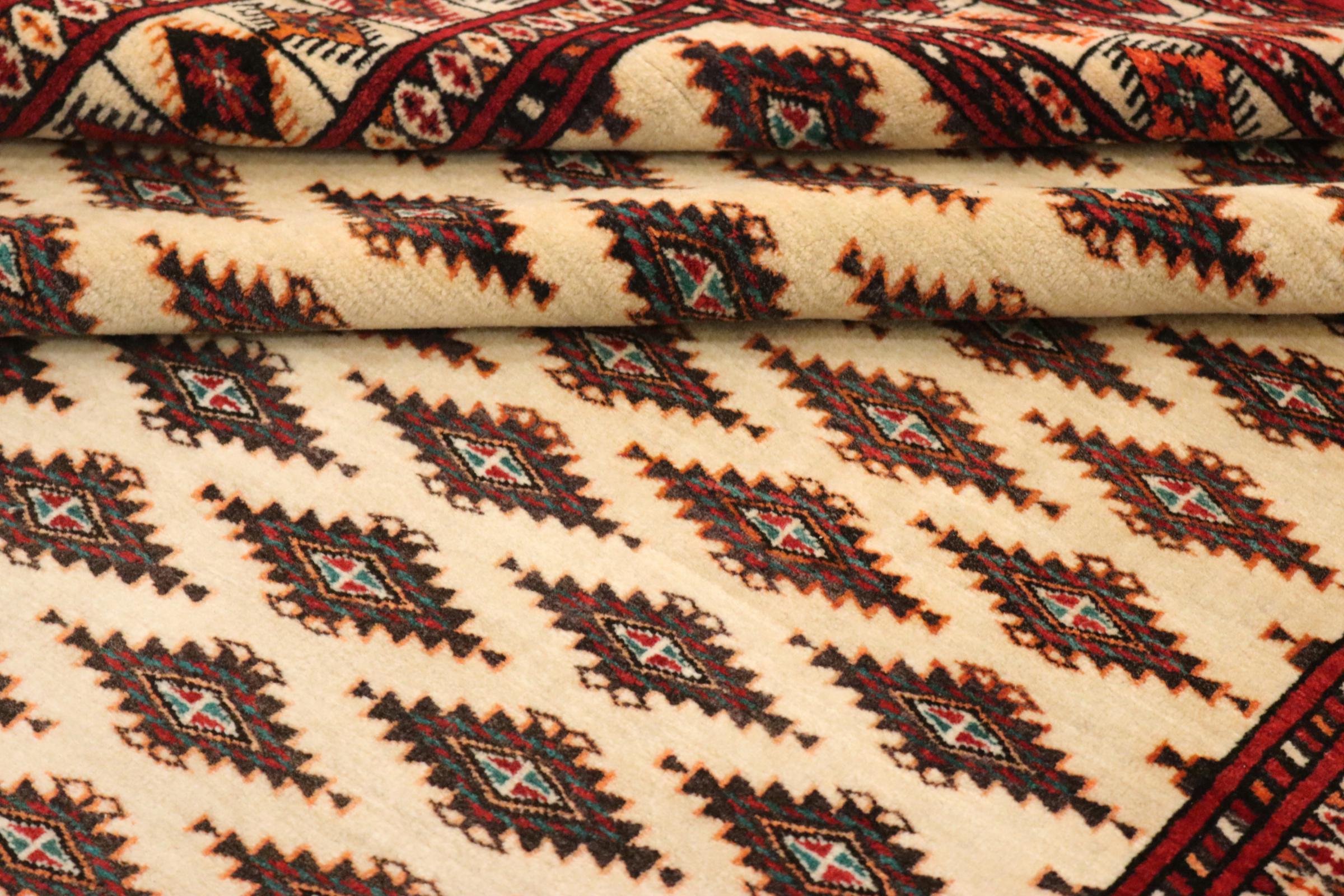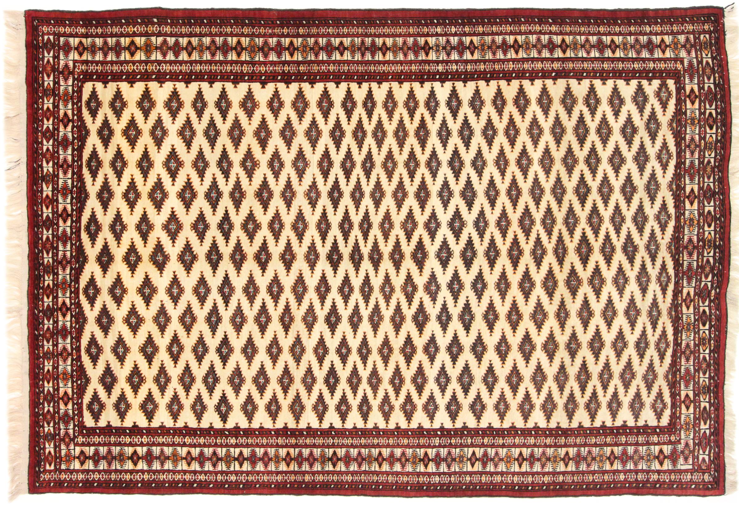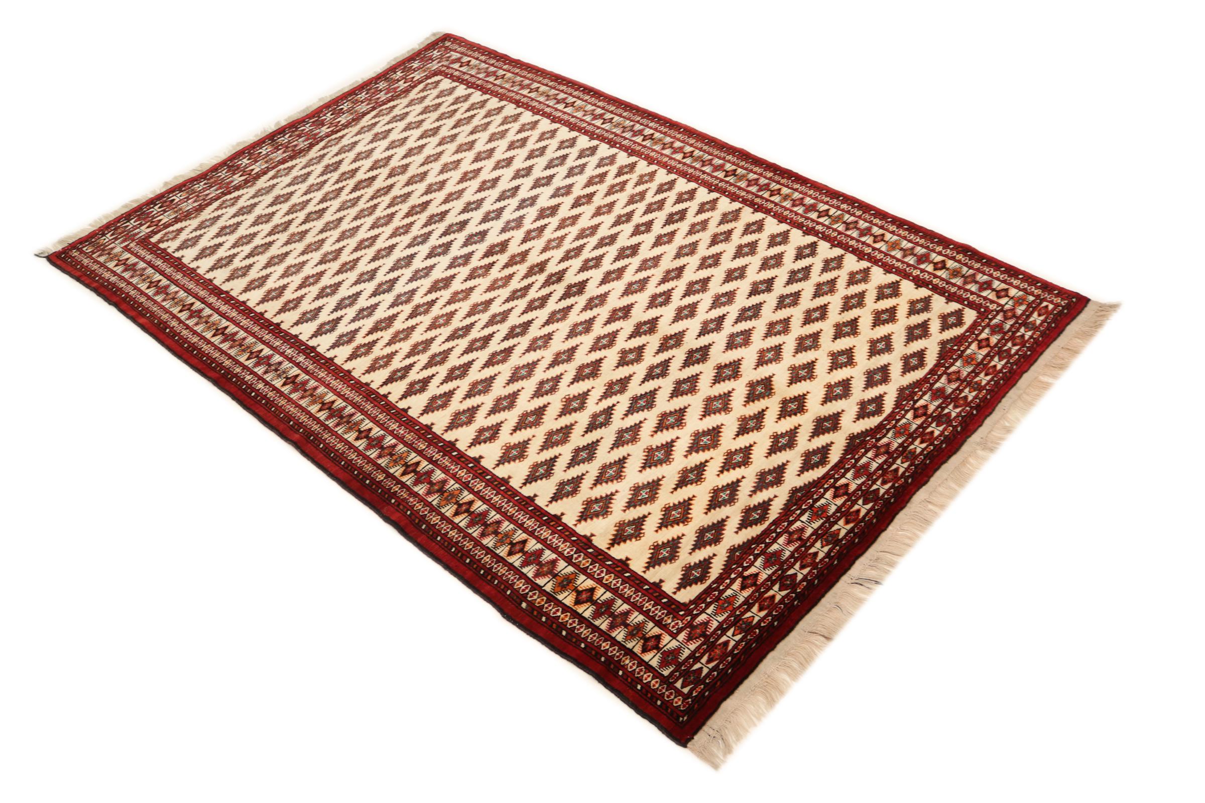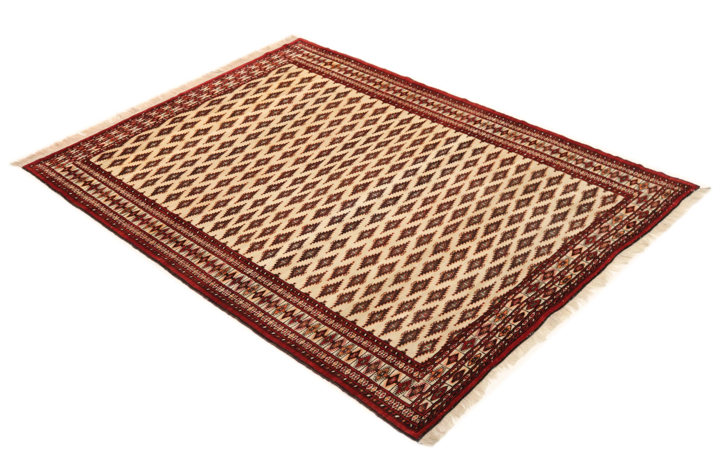 Este tapete turcomano foi tradicionalmente atado à mão e impressiona pelo seu elevado nível de fabrico e pela lã de ovelha de alta qualidade com um elevado teor de gordura. As suas cores quentes e escuras reflectem a cultura dos turcomanos e dão um toque oriental e acolhedor ao seu ambiente de vida. Os tapetes paquistaneses assemelham-se frequentemente a este tipo de tapete, mas muitas vezes não se aproximam da sua qualidade.