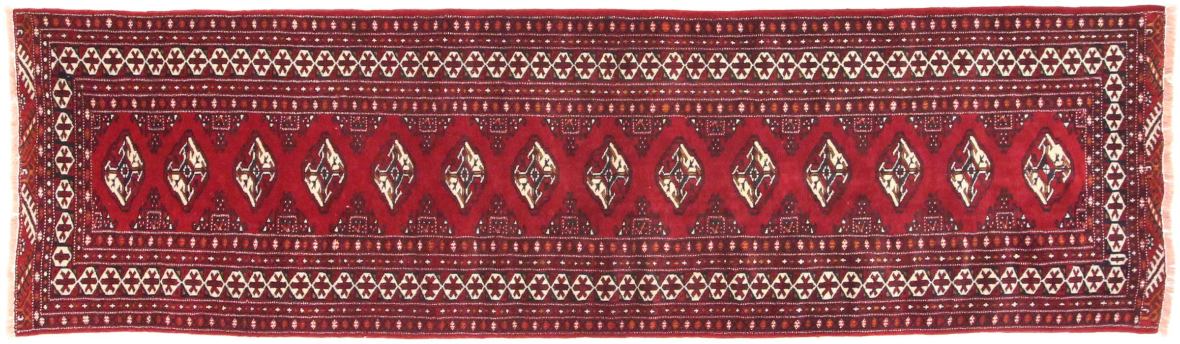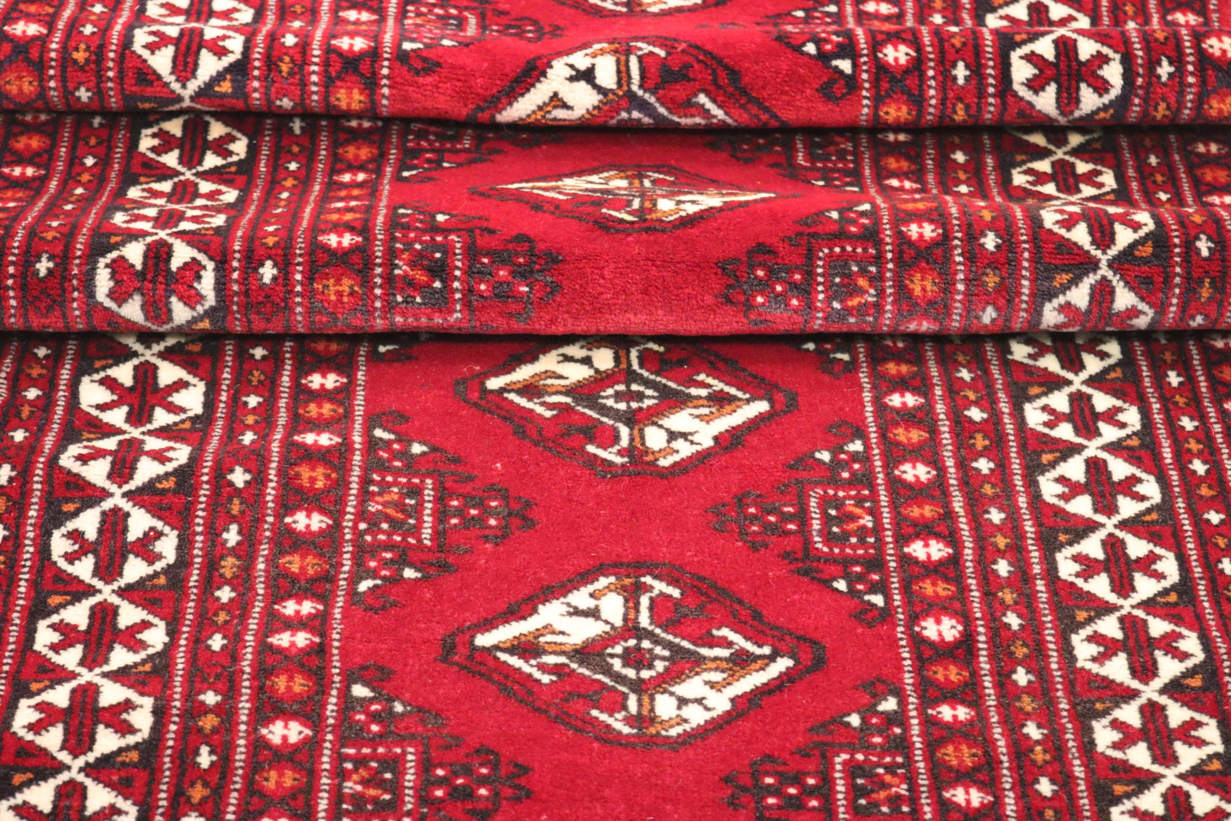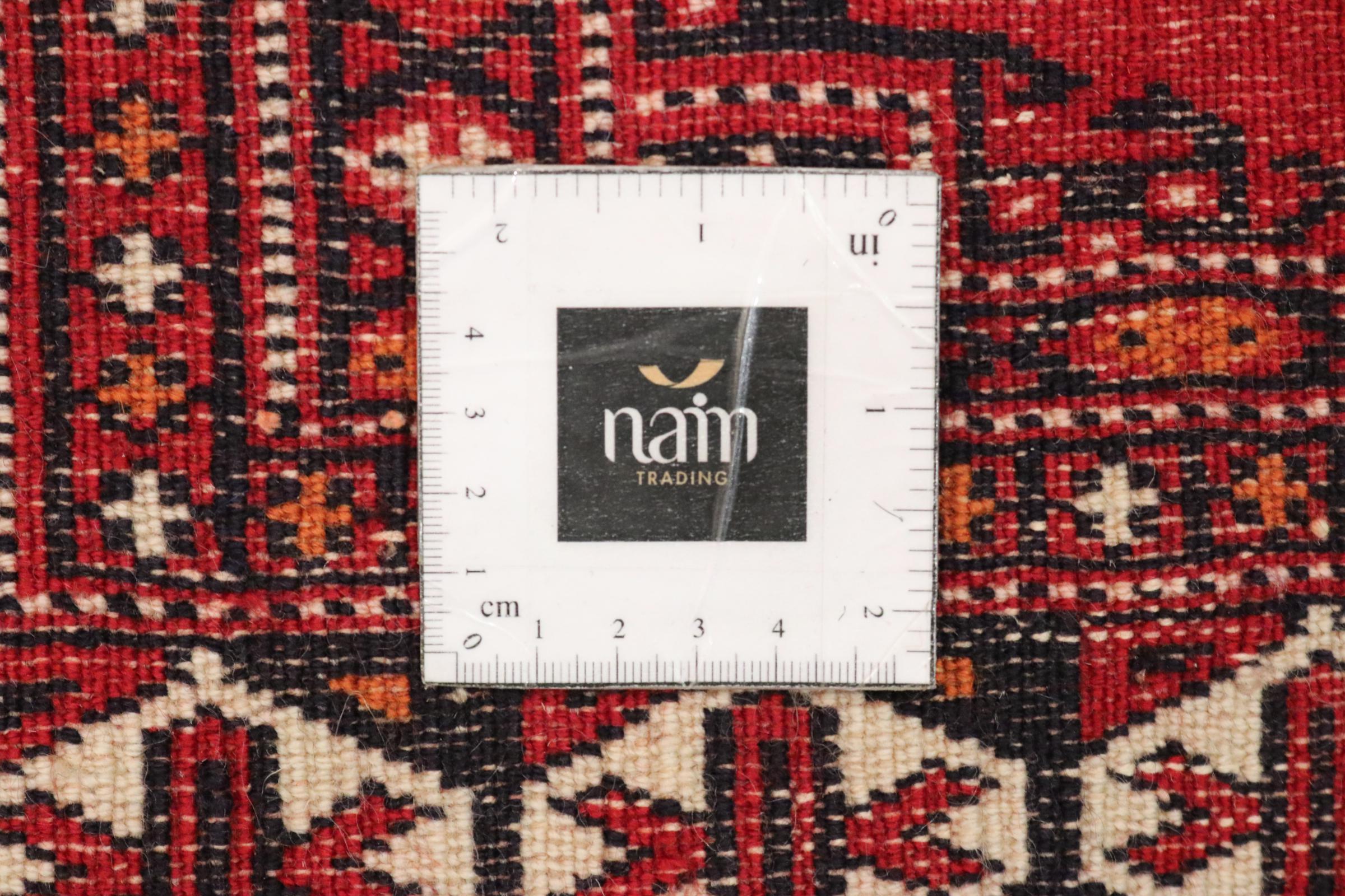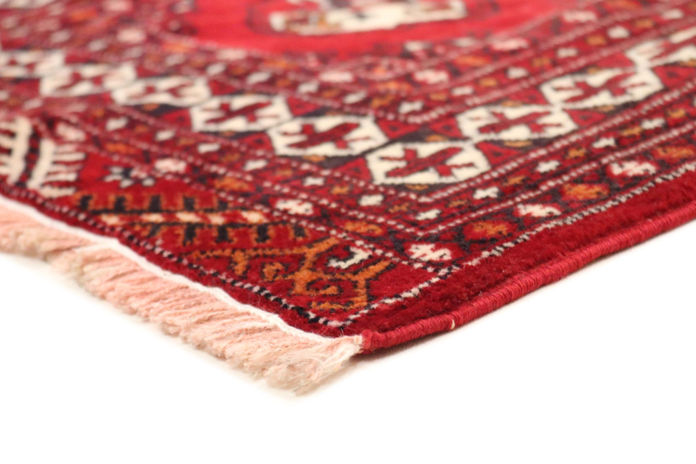 Este tapete turcomano foi tradicionalmente atado à mão e impressiona pelo seu elevado nível de fabrico e pela lã de ovelha de alta qualidade com um elevado teor de gordura. As suas cores quentes e escuras reflectem a cultura dos turcomanos e dão um toque oriental e acolhedor ao seu ambiente de vida. Os tapetes paquistaneses assemelham-se frequentemente a este tipo de tapete, mas muitas vezes não se aproximam da sua qualidade.