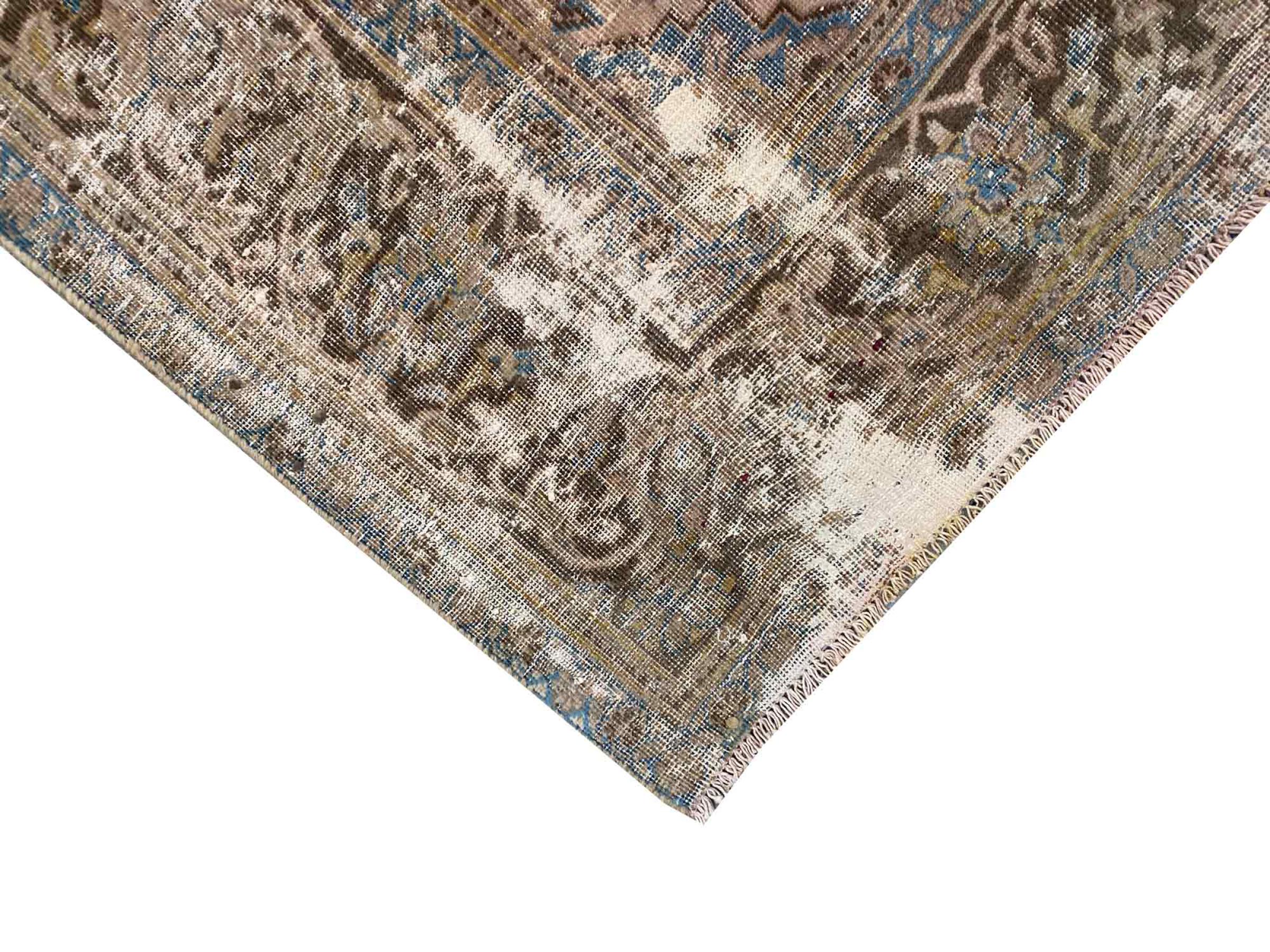 Este é um tapete persa feito à mão que tem pelo menos 20 anos de idade. Este tapete pode durar gerações com os cuidados adequados. O tapete foi completamente tingido de novo sem tingir completamente os ornamentos originalmente atados. Isto dá ao tapete persa de alta qualidade um carácter vintage moderno único.