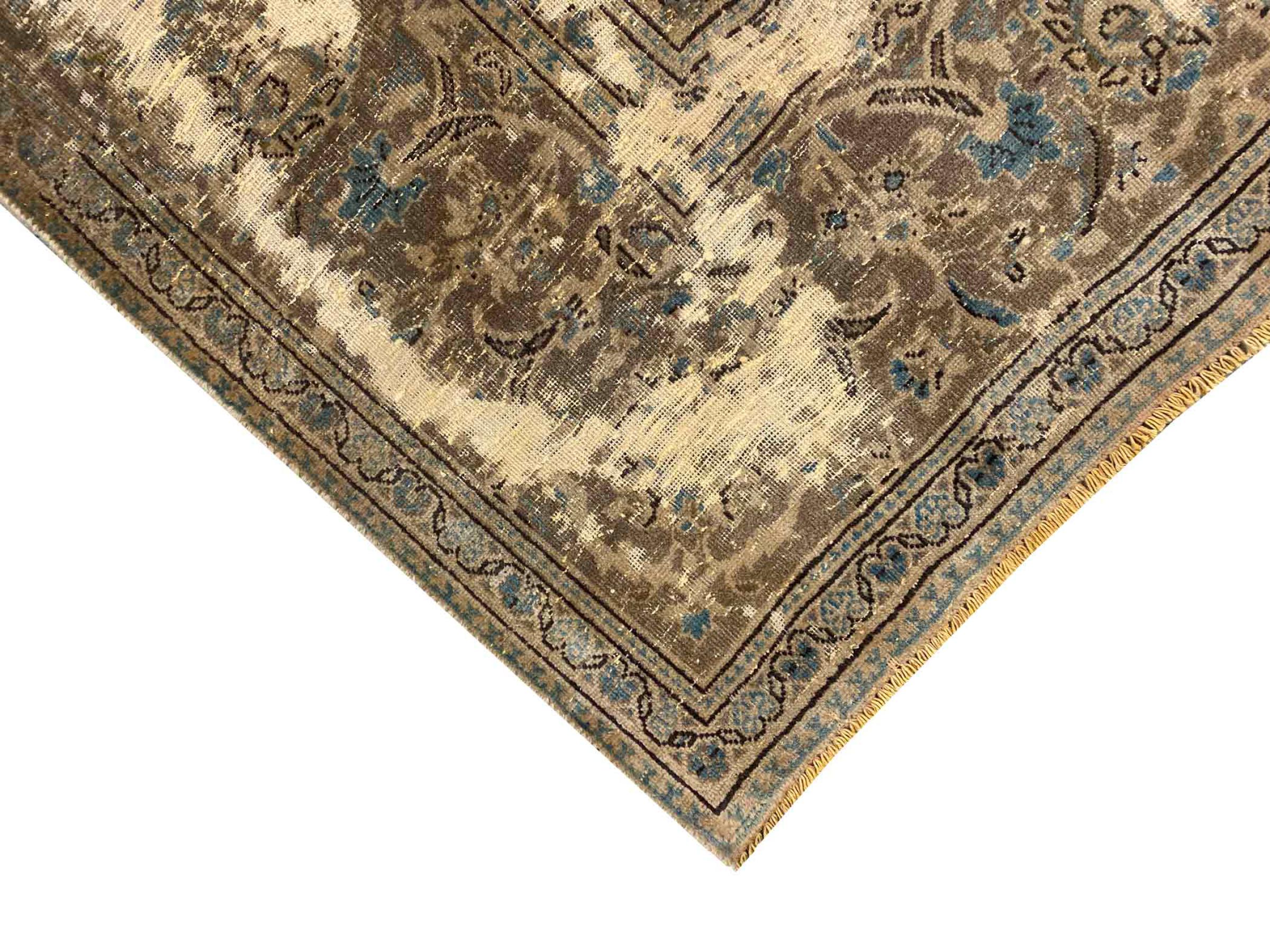 Este é um tapete persa feito à mão que tem pelo menos 20 anos de idade. Este tapete pode durar gerações com os cuidados adequados. O tapete foi completamente tingido de novo sem tingir completamente os ornamentos originalmente atados. Isto dá ao tapete persa de alta qualidade um carácter vintage moderno único.