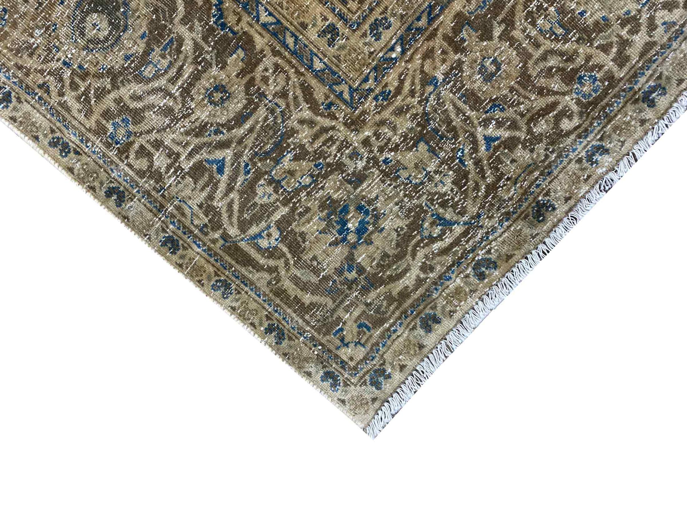 Este é um tapete persa feito à mão que tem pelo menos 20 anos de idade. Este tapete pode durar gerações com os cuidados adequados. O tapete foi completamente tingido de novo sem tingir completamente os ornamentos originalmente atados. Isto dá ao tapete persa de alta qualidade um carácter vintage moderno único.