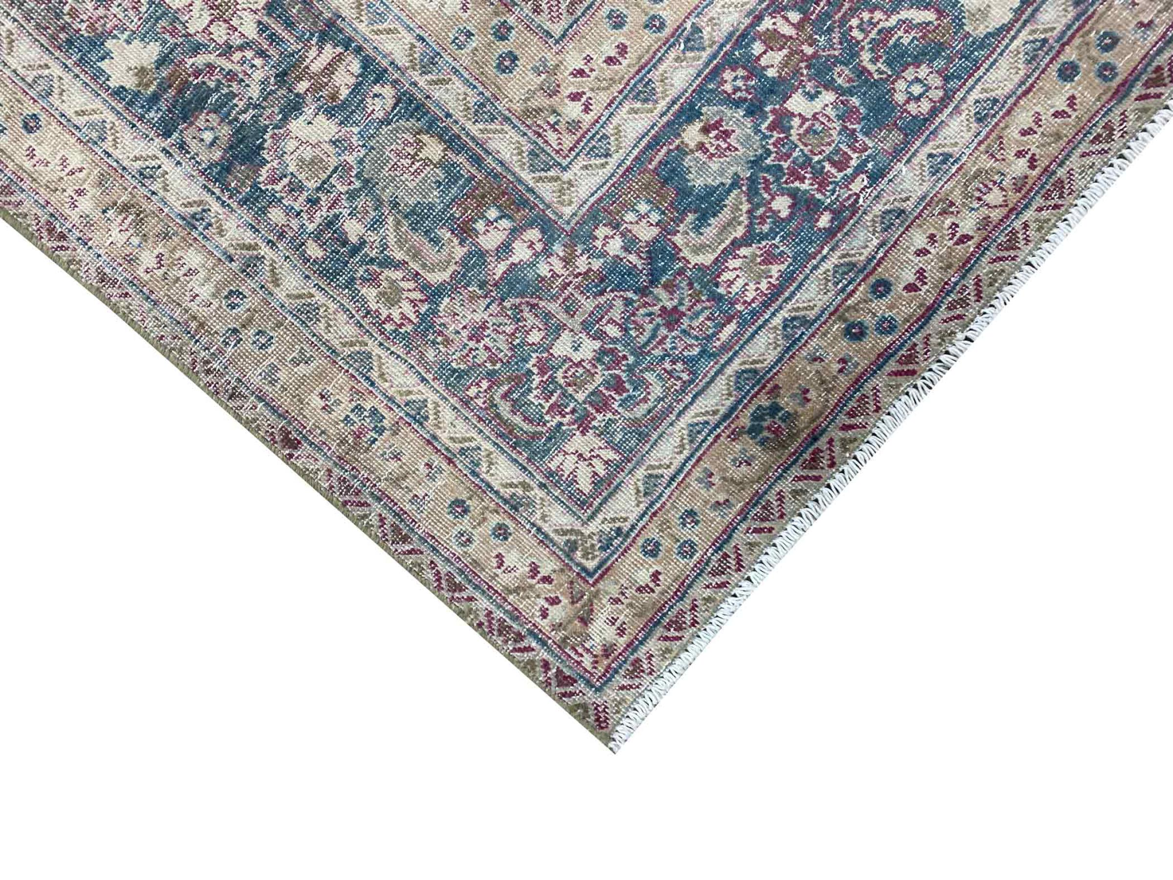 Este é um tapete persa feito à mão que tem pelo menos 20 anos de idade. Este tapete pode durar gerações com os cuidados adequados. O tapete foi completamente tingido de novo sem tingir completamente os ornamentos originalmente atados. Isto dá ao tapete persa de alta qualidade um carácter vintage moderno único.