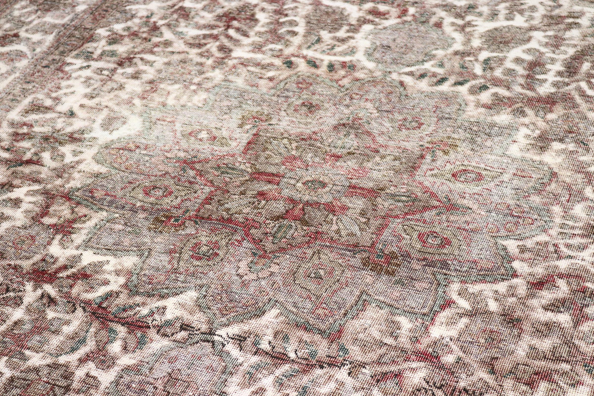 Este é um tapete persa feito à mão que tem pelo menos 20 anos de idade. Este tapete pode durar gerações com os cuidados adequados. O tapete foi completamente tingido de novo sem tingir completamente os ornamentos originalmente atados. Isto dá ao tapete persa de alta qualidade um carácter vintage moderno único.