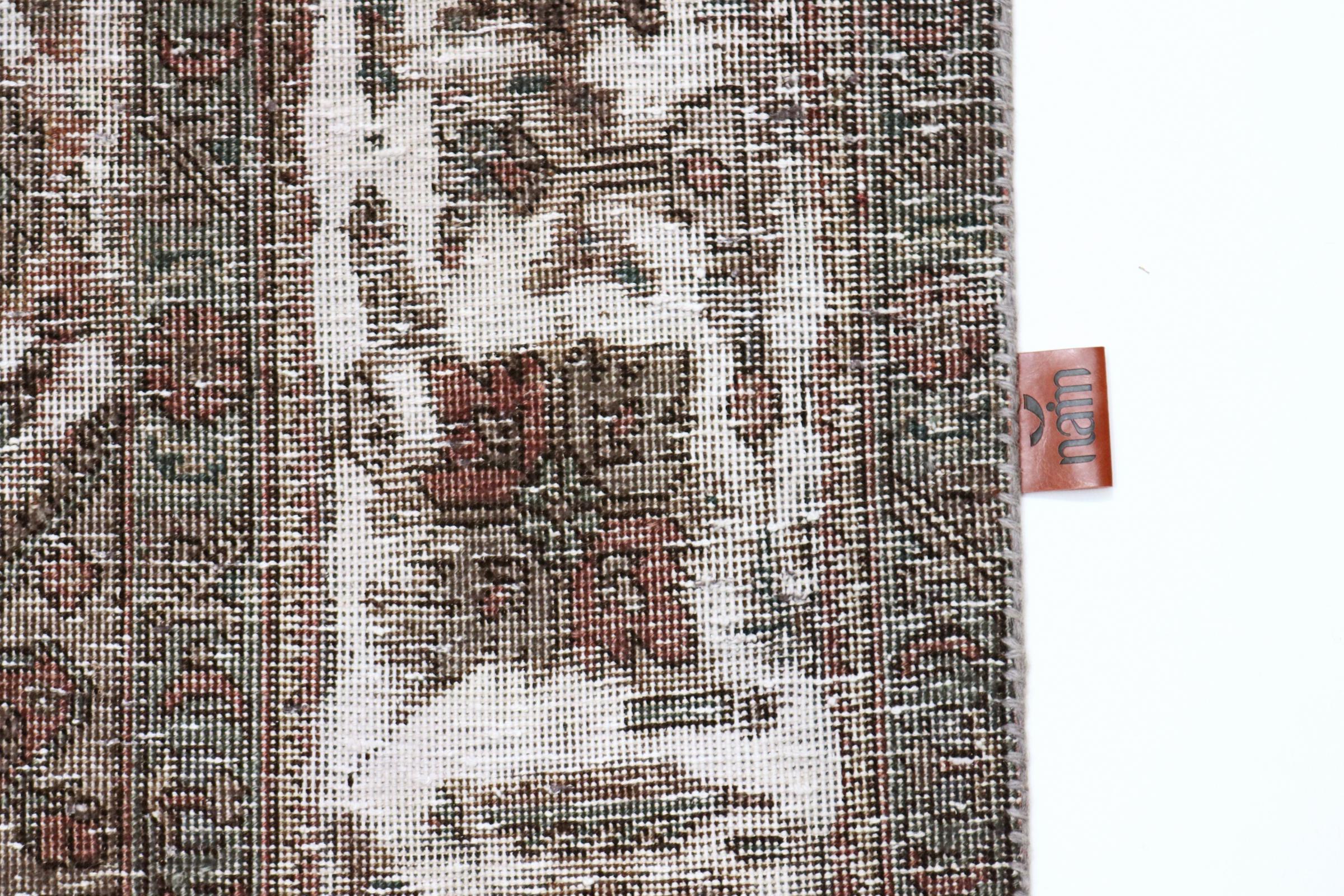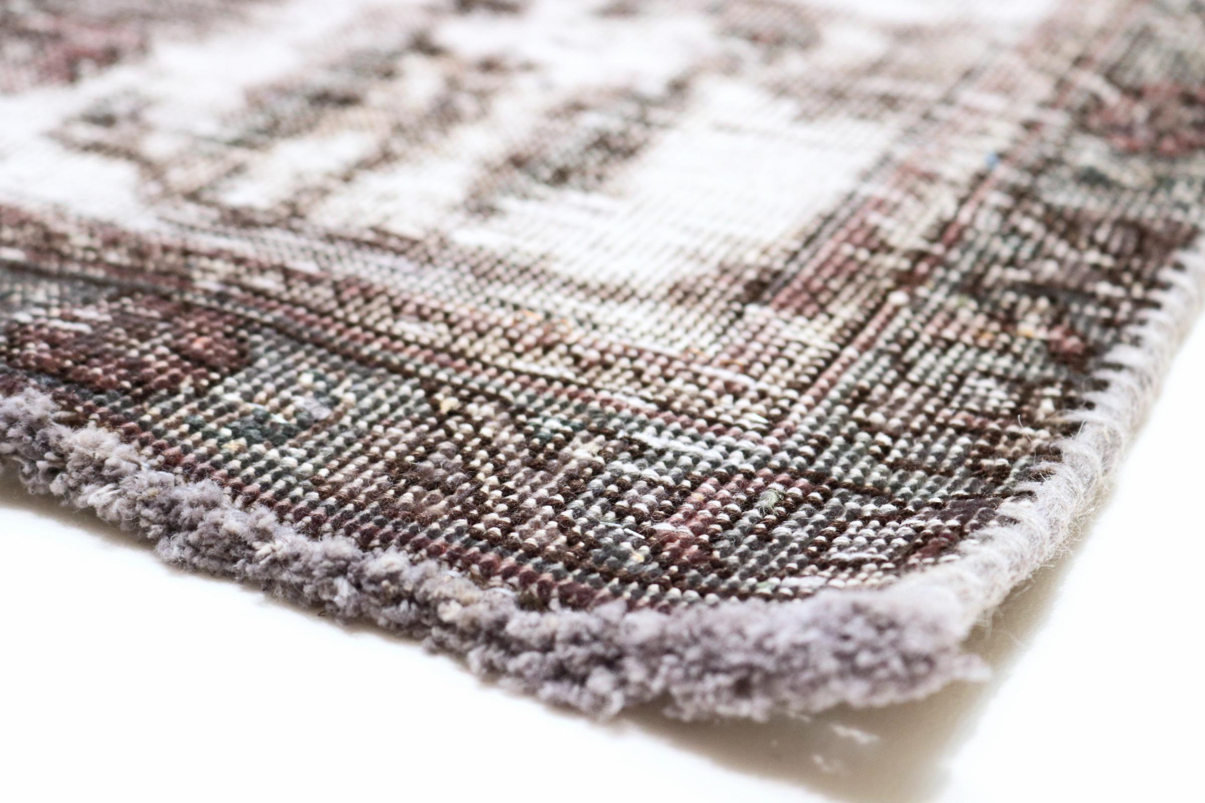 Este é um tapete persa feito à mão que tem pelo menos 20 anos de idade. Este tapete pode durar gerações com os cuidados adequados. O tapete foi completamente tingido de novo sem tingir completamente os ornamentos originalmente atados. Isto dá ao tapete persa de alta qualidade um carácter vintage moderno único.