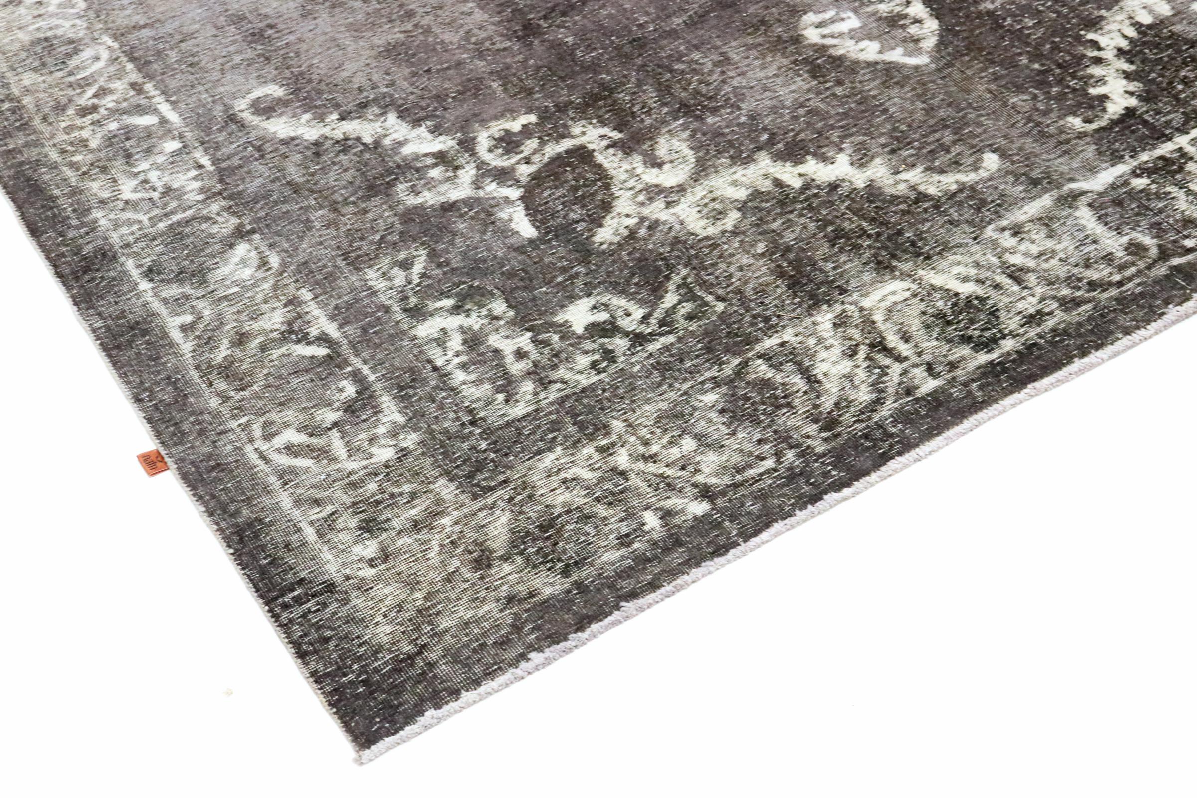 Este é um tapete persa feito à mão que tem pelo menos 20 anos de idade. Este tapete pode durar gerações com os cuidados adequados. O tapete foi completamente tingido de novo sem tingir completamente os ornamentos originalmente atados. Isto dá ao tapete persa de alta qualidade um carácter vintage moderno único.