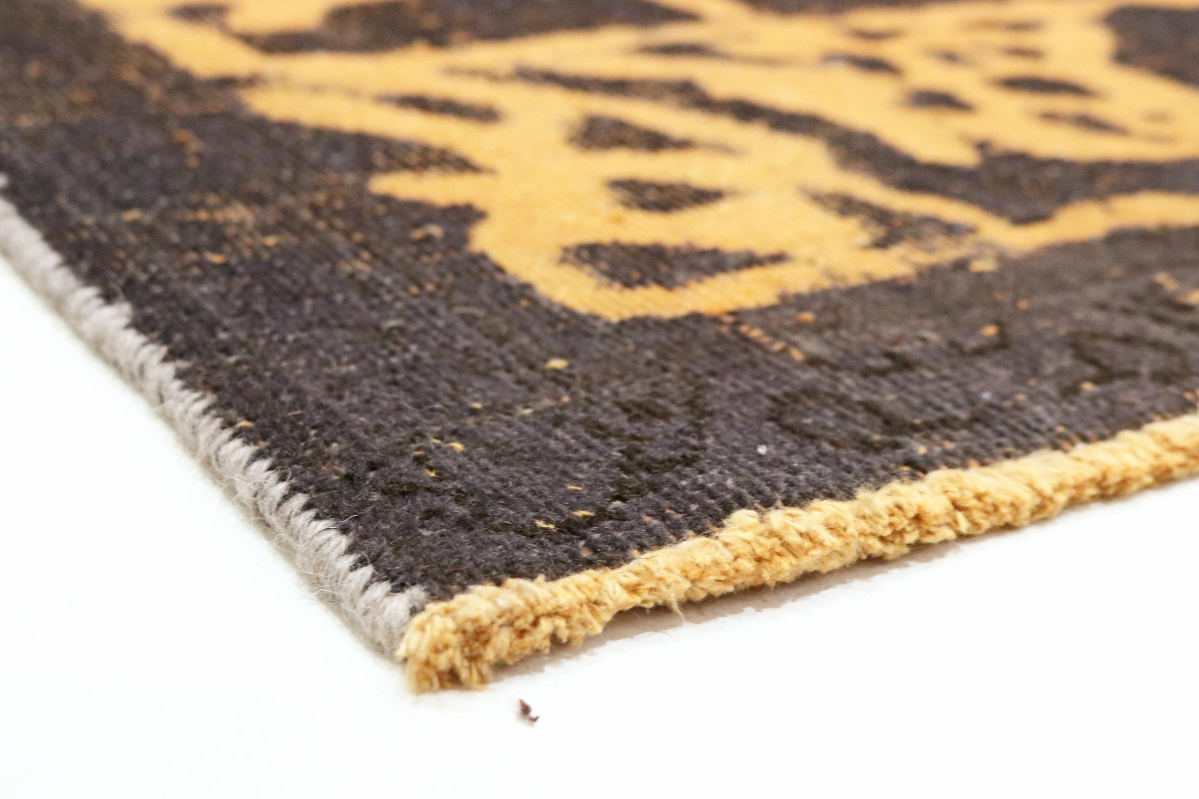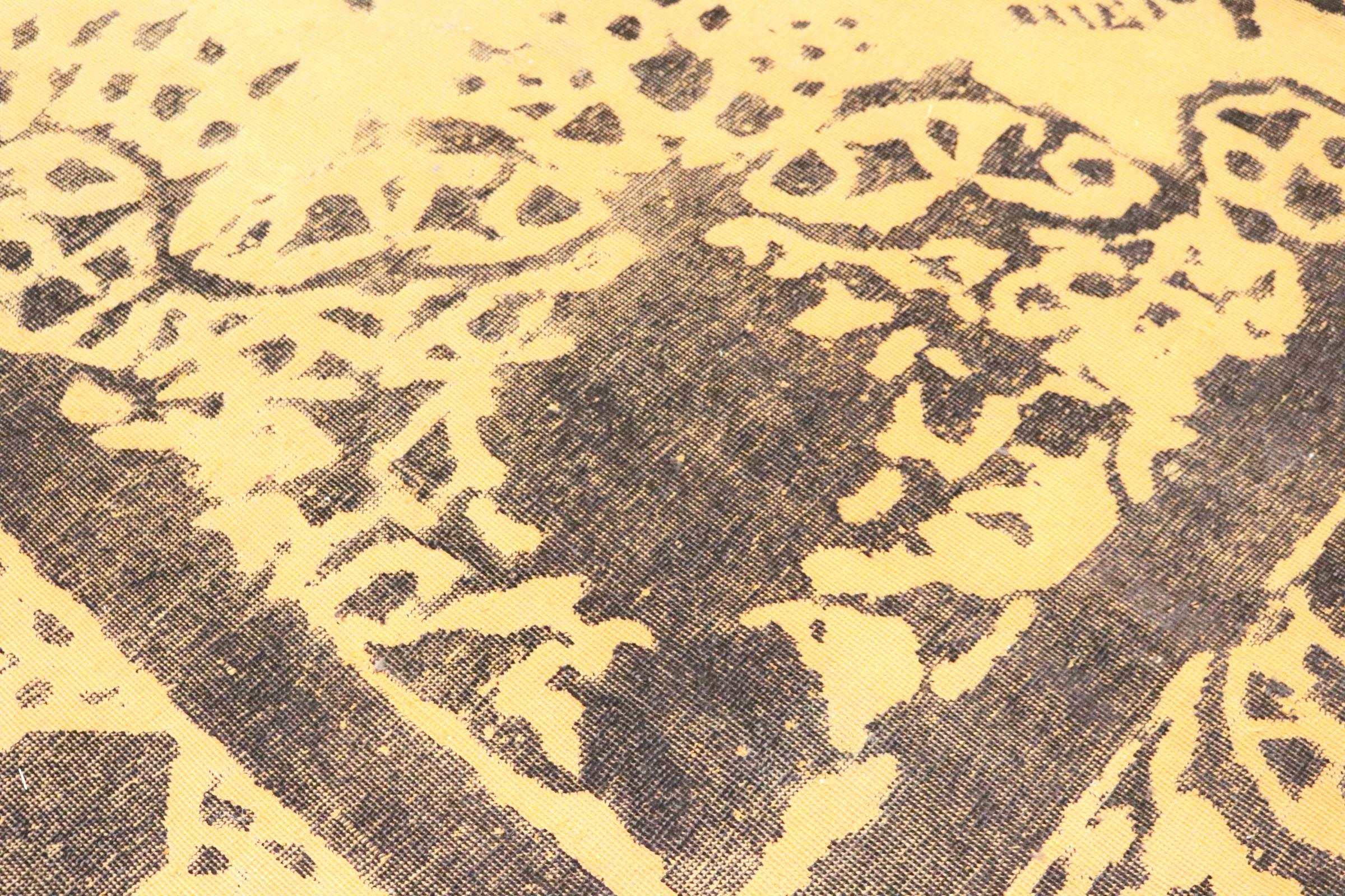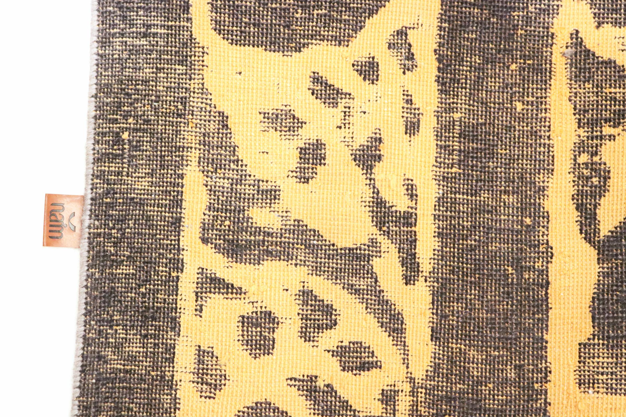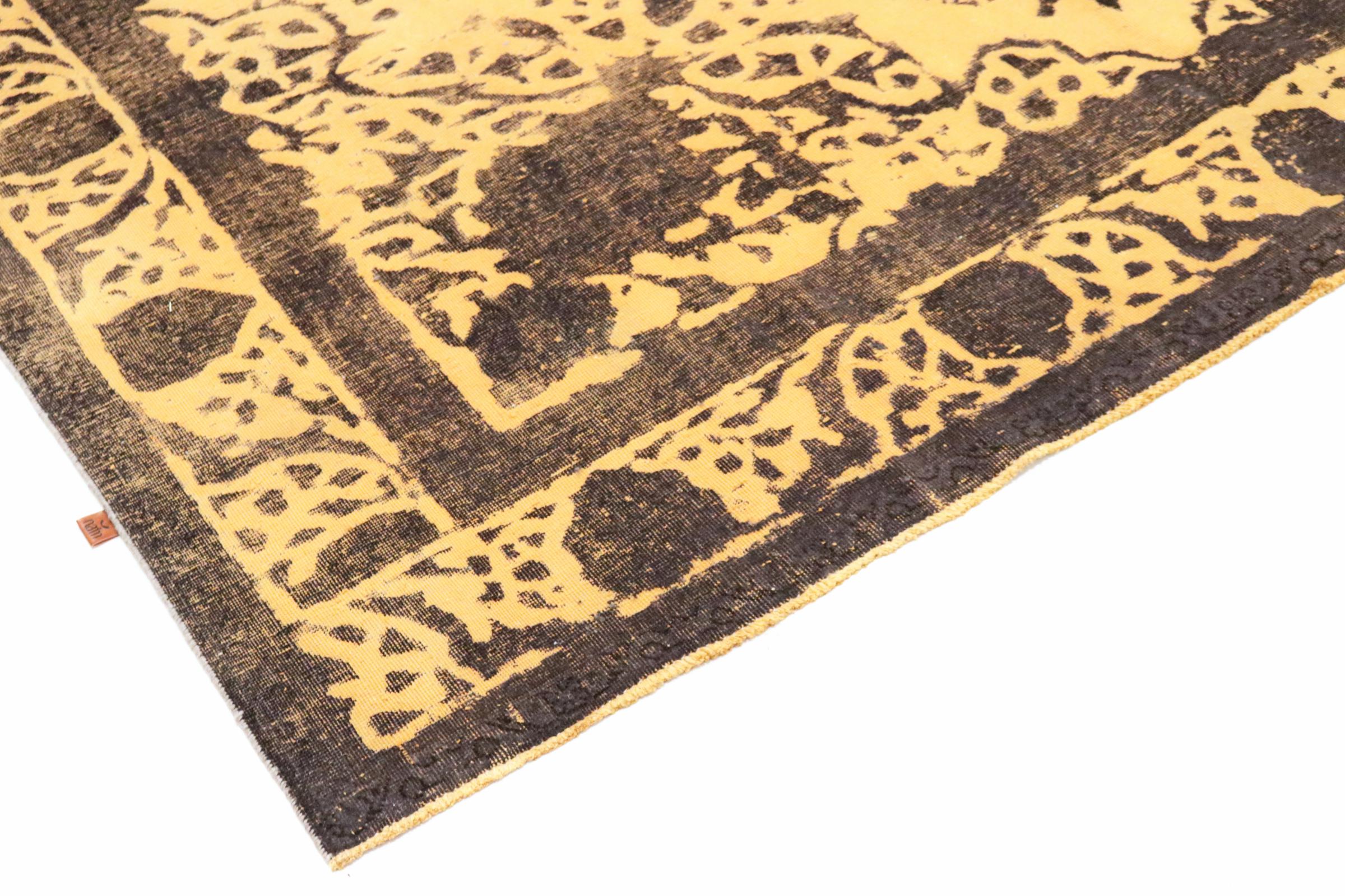 Este é um tapete persa feito à mão que tem pelo menos 20 anos de idade. Este tapete pode durar gerações com os cuidados adequados. O tapete foi completamente tingido de novo sem tingir completamente os ornamentos originalmente atados. Isto dá ao tapete persa de alta qualidade um carácter vintage moderno único.