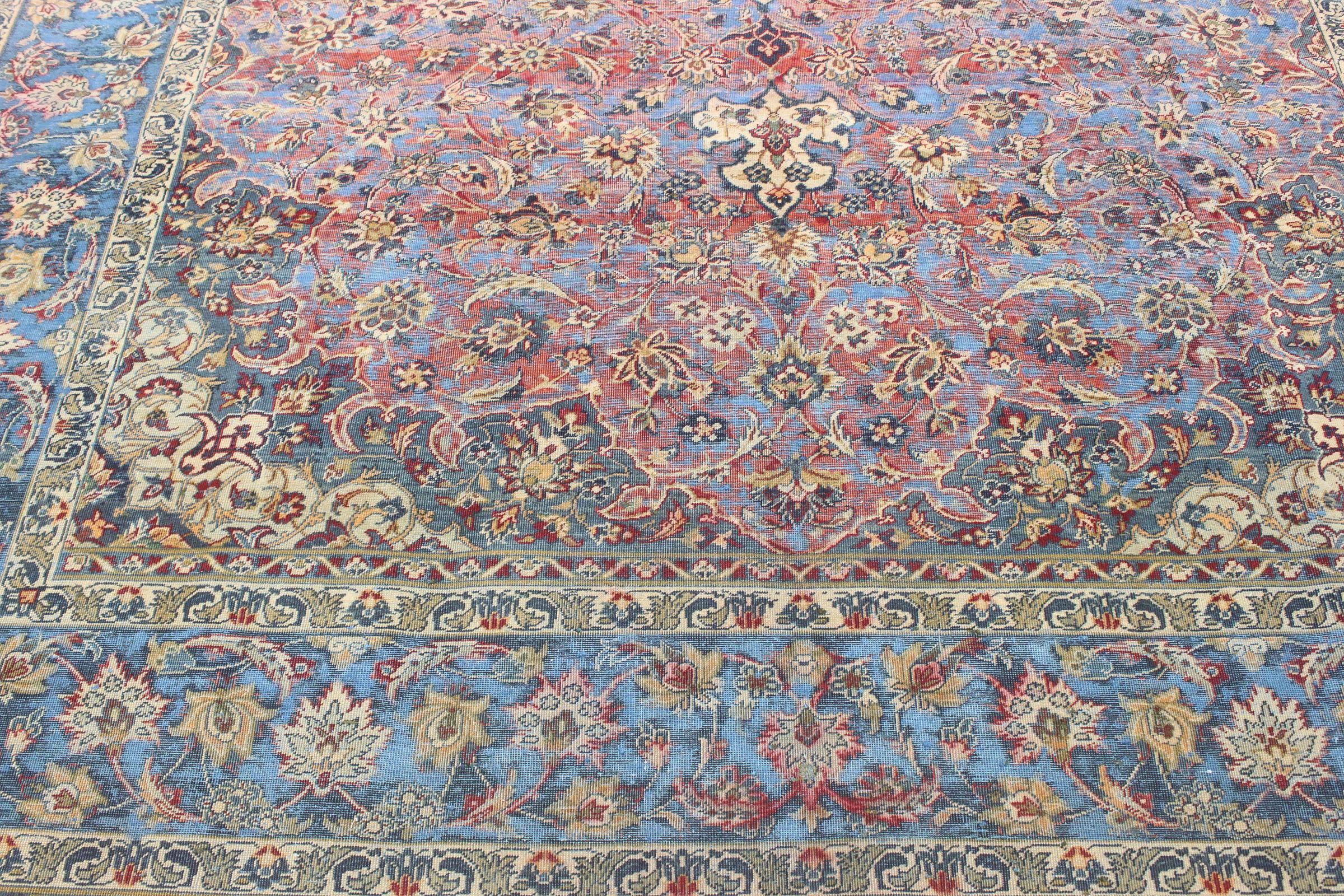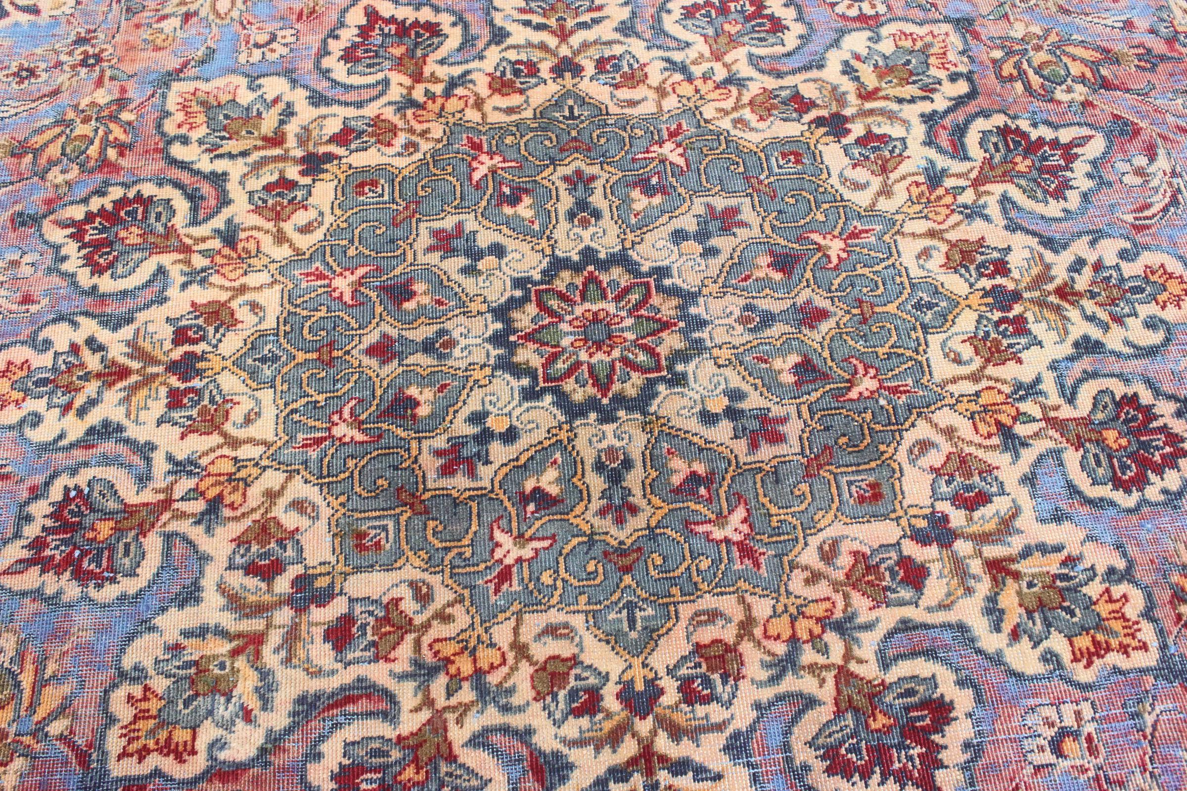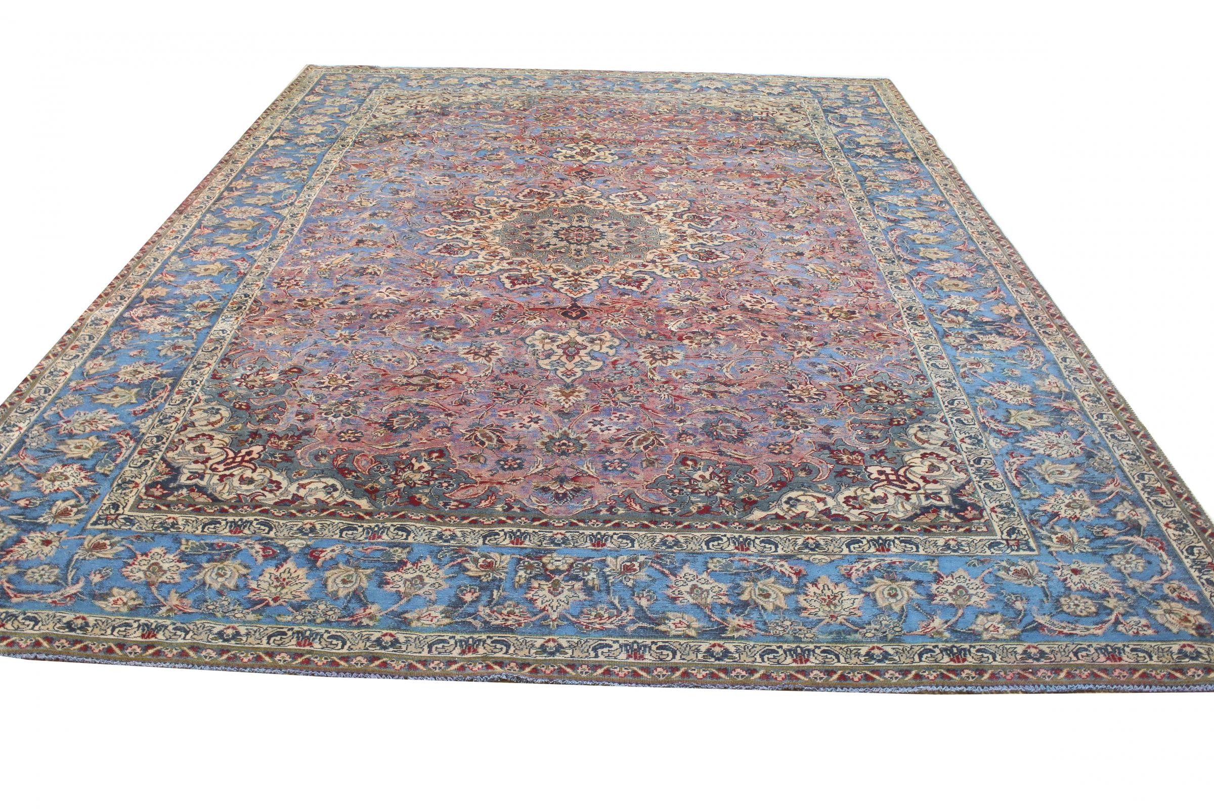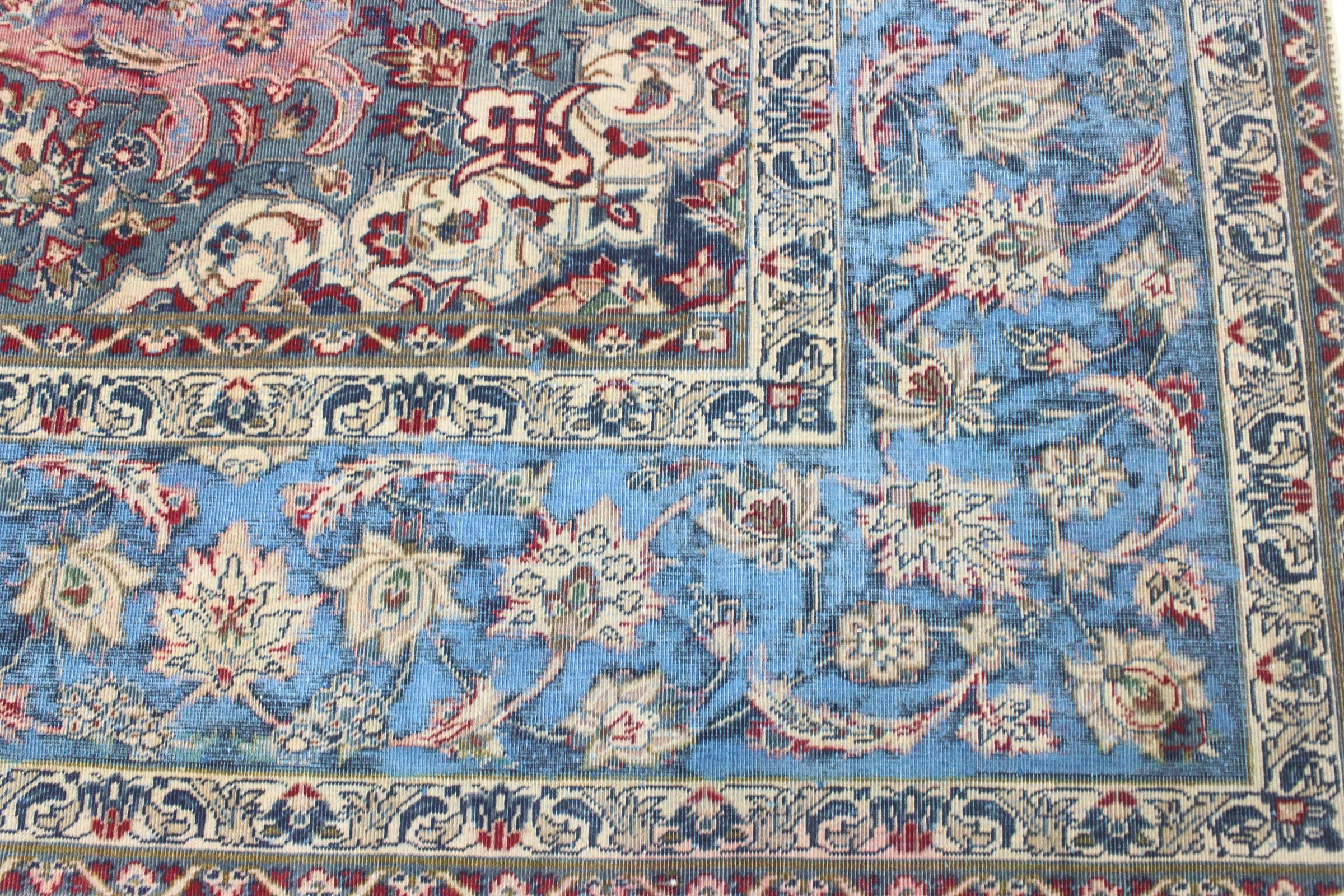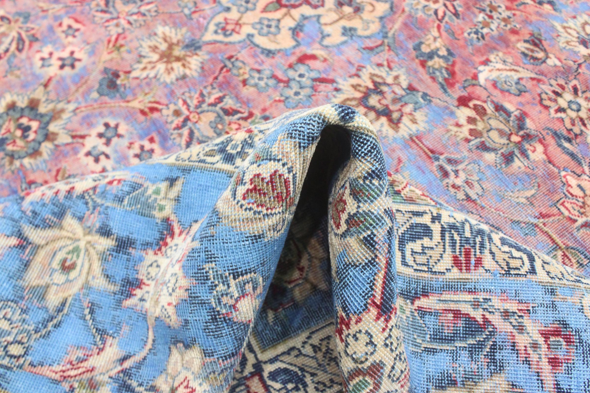 Este é um tapete persa feito à mão que tem pelo menos 20 anos de idade. Este tapete pode durar gerações com os cuidados adequados. O tapete foi completamente tingido de novo sem tingir completamente os ornamentos originalmente atados. Isto dá ao tapete persa de alta qualidade um carácter vintage moderno único.