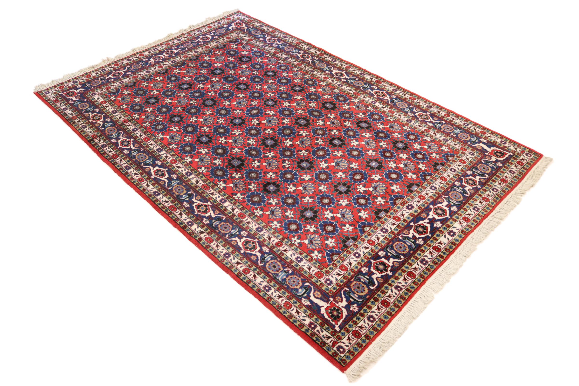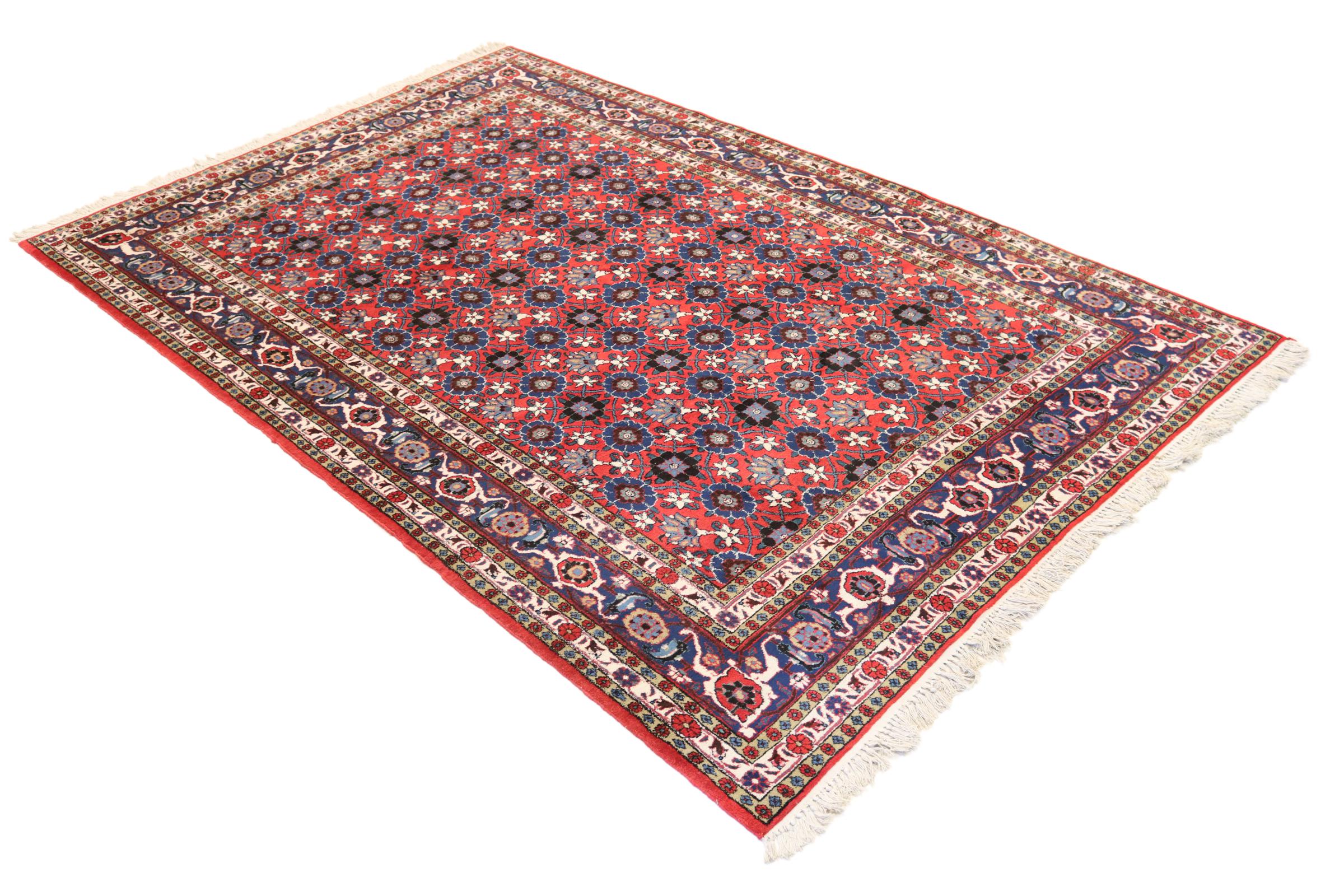 Este nobre tapete persa da cidade iraniana de Waramin apresenta um padrão simétrico em cores orientais. O modelo feito à mão é uma peça única da história contemporânea - feito de lã de ovelha robusta mas macia da mais alta qualidade. Com os seus elementos florais, o tapete dá à sua casa uma atmosfera caseira cheia de alegria de viver oriental.